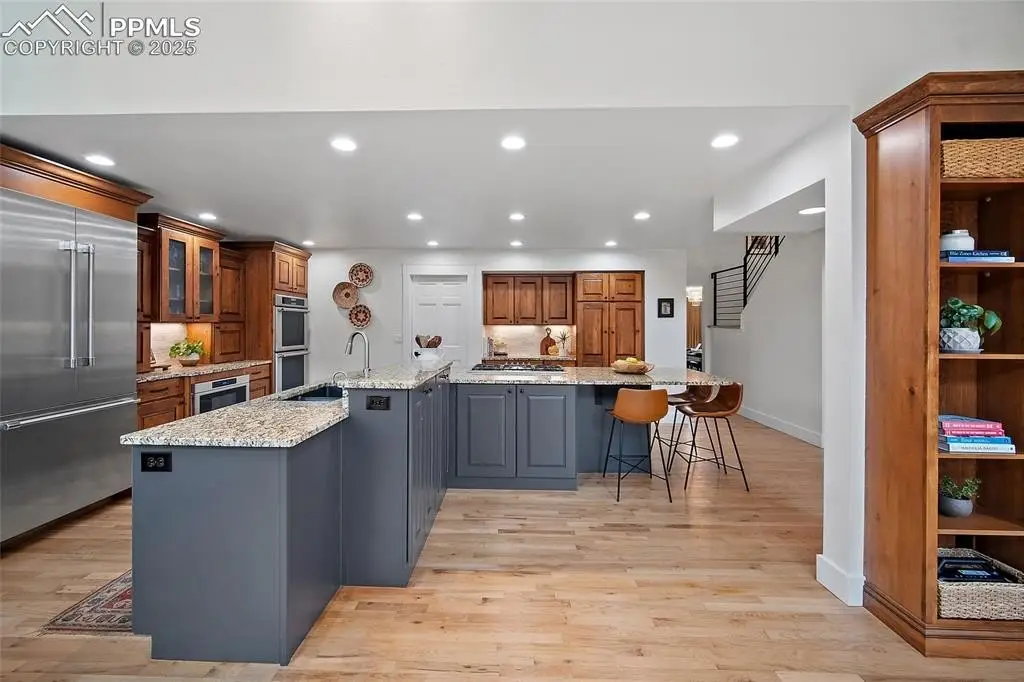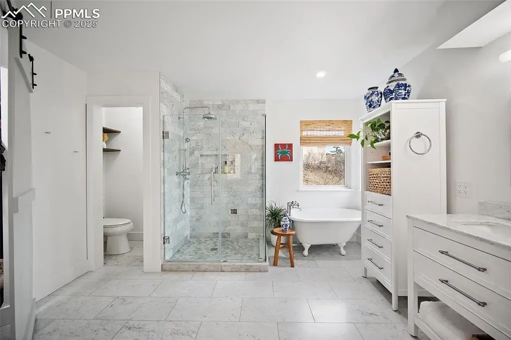 Contemporary showstopper lovingly brought to vibrant life offers a transformative living experience of style and comfort. There isn't a surface that hasn't been touched in this comprehensive renovation inside and out. Dramatic main-level living spaces with palatial ceiling heights and a soaring fireplace blend with a calm and homey atmosphere that make it feel as though you've nested in a work of art. Bright and inviting, you'll want to stay in the gorgeous front parlor, but the entrance draws you in to an open floor plan that leads to an endless chef's kitchen with breakfast banquette for morning coffee or intimate get-togethers with a close friend. The formal dining room has been reimagined into a space of tranquility and class. A main-level master suite brings into the picture a five-piece bath with iron tub and Carrera marble tile. Upstairs, enjoy the views below from the airy landing, which leads to three spacious bedrooms, one en suite, and a second hall bath, all of which have been updated to modern expectations. Downstairs is a whole other world: a cozy family room with a second fireplace, a large wet bar for entertaining that lies just inside from a hot tub, a suite of two exercise rooms, an office/craft room, and a secluded guest suite with a bath that would be the pride of the home anywhere else, including a sauna. Outside, the home has new paint and a new roof in 2025, and the length-of-the-house deck has been replaced with composite decking. Xeriscaped landscaping makes yard maintenance easy. With a four-car tandem garage complete with RV parking, a large pantry and main-level laundry, the home has all the extra conveniences that make this home complete. Tucked on the slopes of upper Skyway with a trailhead just around the corner and Bear Creek Park just down the hill, the location is ideal for outdoor activities.