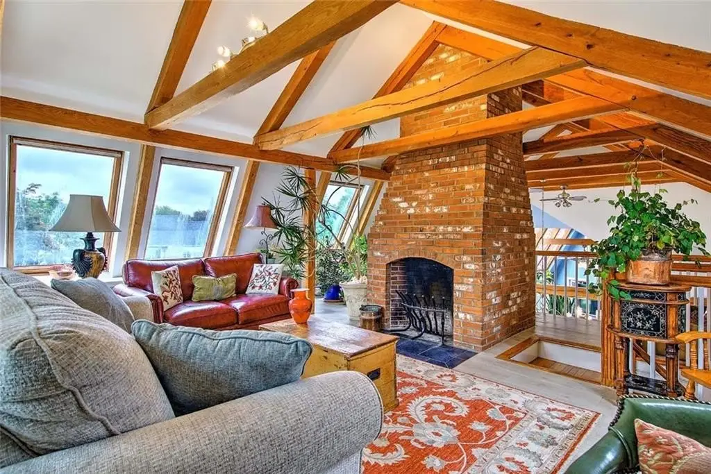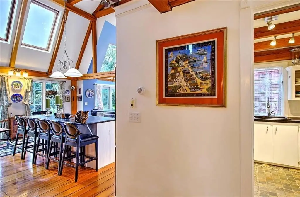 This one-of-a-kind hand-crafted post-and-beam home, named “Sakonnet Shores,” is a rare blend of artistry, sustainability, and connection to the land and sea. Built with traditional timber-frame techniques – without a single nail – the red oak beams were sourced from Massachusetts, hand-cut with wooden pegs, and raised on-site in the tradition of Amish barns. Red cedar siding, wide-plank antique pine floors milled from historic Fall River beams, and exposed timber throughout create warmth and timeless beauty. Built with SIP panels, solar design, and participation in the RI Energy program, the home is both efficient and income-generating. Natural light pours in through Pella and Andersen windows, French doors, sliders, and 10 skylights that frame saltwater views. Modern comforts include two dishwashers, dual laundry areas, a chef’s kitchen with cathedral ceilings, soapstone counters, bar seating for 12, and a walk-in pantry. The primary suite offers a spa bath, private patio, and outdoor shower, complemented by additional bedrooms, flexible office space, and multiple patios for entertaining. Fireplaces in the living room and upper salon invite cozy gatherings, while the lower-level gym doubles as a fifth bedroom with a sauna and steam shower. The 1.68-acre grounds feature flowering trees, hydrangeas, and saltwater frontage with rights to two moorings. Just minutes to Newport and 30 minutes to Providence, it’s a rare coastal retreat.