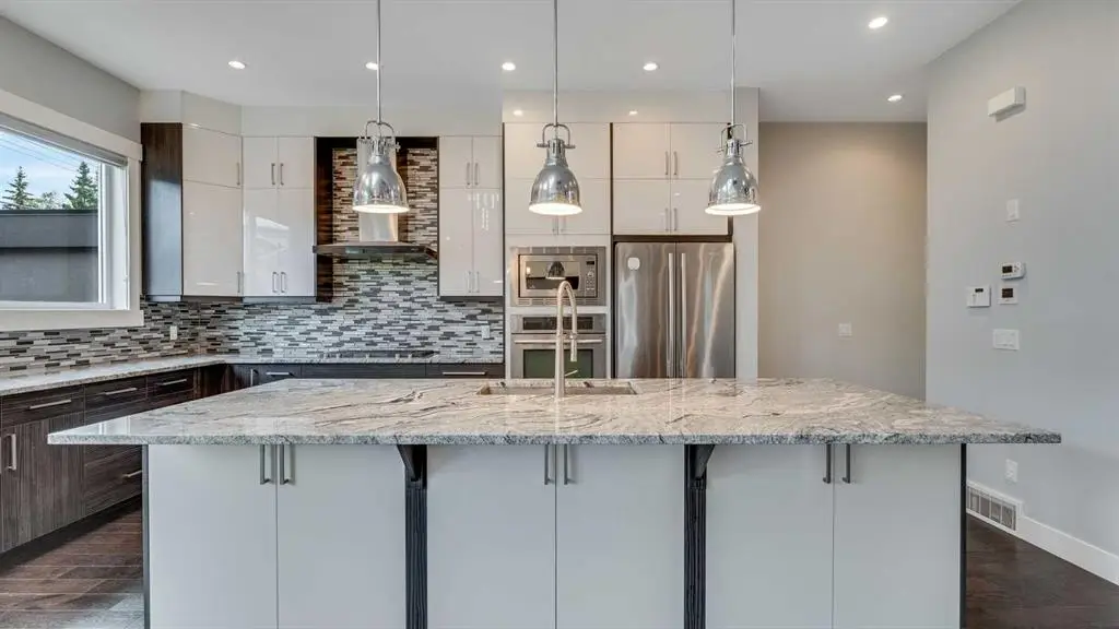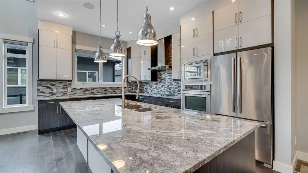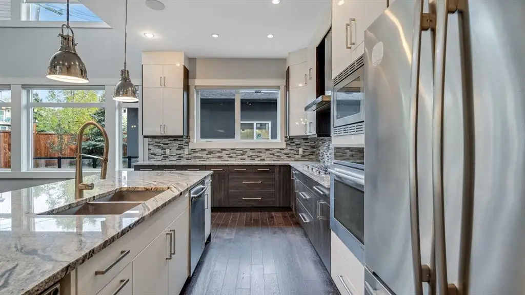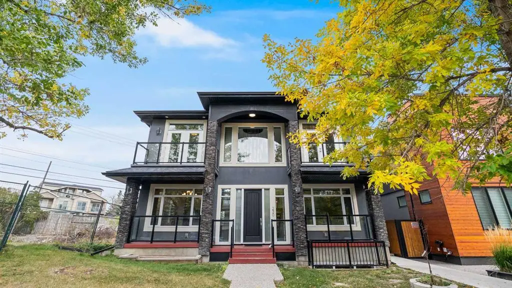 **Masterpiece of Modern Elegance in Parkdale Nestled just steps from the serene Bow River pathways and the lush beauty of Elbow Park, this exquisite residence offers the perfect balance of nature, luxury, and urban convenience. Ideally situated near the Alberta Children’s Hospital, Foothills Hospital, and Market Mall, every essential—whether shopping, recreation, or emergency care—is mere minutes away. Behind the property, tranquil walking and cycling trails invite you to unwind and reconnect with the outdoors. Set on a generous 45-foot lot in Calgary’s highly sought-after inner-city enclave of Parkdale, this stunning stucco home is a showcase of architectural sophistication and exceptional craftsmanship. Spanning over 4,000 sq.ft. of opulent living space, including 2,573sq.ft. above grade, it features five spacious bedrooms and four-and-a-half luxurious baths. From the moment you enter, the home’s grandeur is undeniable—beginning with a soaring 19-foot foyer, beautifully tiled floors, and a dramatic open-riser staircase that exudes modern artistry. Expansive windows flood the open-concept interior with natural light, highlighting fine finishes and elegant design details throughout. The main living area is anchored by a sleek gas fireplace, offering both warmth and sophistication—a perfect setting for relaxed evenings or formal gatherings. The chef-inspired kitchen is a true statement of luxury, boasting a large granite island with breakfast bar, two-tone custom cabinetry, a built-in wine cooler, and an elite JennAir appliance package. French doors lead seamlessly to an oversized patio, ideal for al fresco dining and entertaining, complete with a rough-in BBQ gas line and integrated sound system. A spacious main-floor office or flex room, along with a refined powder room, completes this impressive level. The upper floor unveils a private master retreat that redefines comfort and elegance. Featuring a west-facing balcony, a romantic two-sided fireplace, and a spa-worthy ensuite with a freestanding soaker tub, glass-enclosed shower, and bespoke walk-in closet, this suite is designed for pure relaxation. Two additional bedrooms—one with its own ensuite—plus a stylish full bath provide exceptional accommodation for family or guests. The fully developed lower level extends the home’s luxurious living with a vast recreation and media area, two additional bedrooms, and a full bath. A remarkable highlight is the legal basement suite with in-floor heating and a private entrance, offering both comfort and versatility—ideal for extended family, guests, or potential rental income. Additional features include a central vacuum system, built-in audio throughout all three levels, and advanced exterior security cameras for peace of mind. Every element of this residence has been thoughtfully curated to offer a lifestyle of refined elegance, comfort, and modern sophistication—all within one of Calgary’s most desirable riverside communities.