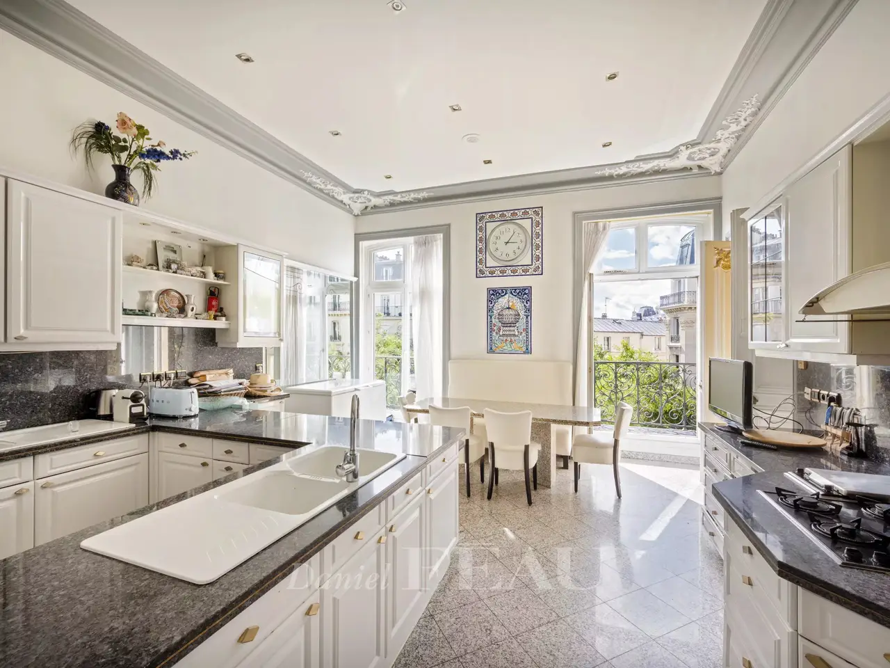 Boulevard de Magenta. This elegant 258 sqm apartment on the 3rd floor of a fine freestone building with a lift features 3.60 metre high ceilings. An entrance hall leads to a double living/reception room benefiting from wide floor-to-ceiling windows opening onto a balcony, a dining room, a kitchen with dining facilities, five bedrooms (four overlooking a courtyard), four bathrooms and a separate wc. Ample fitted storage space. With two cellars and a double lock-up courtyard garage at extra cost. Possible premises for a self-employed professional.