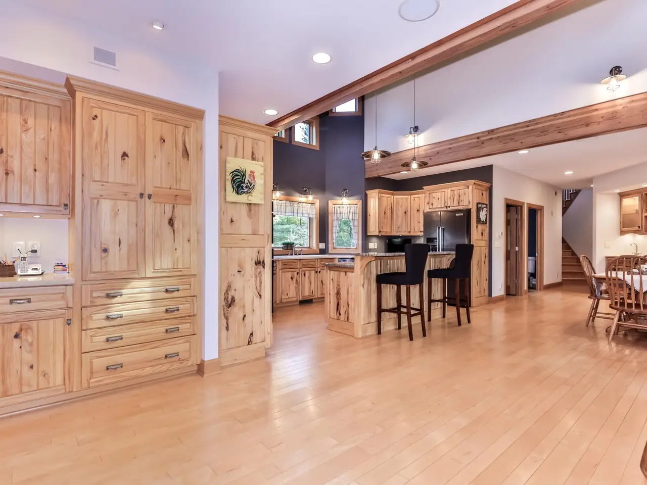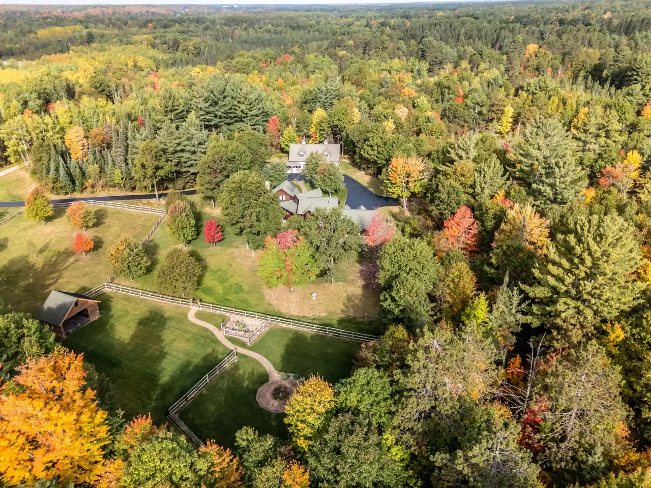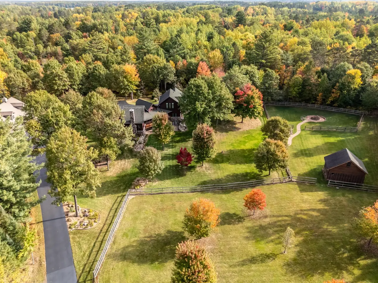 This stunning 3-bedroom, 3.5-bath craftsman-style home and hobby farm estate sits on over 11 acres of rolling, wooded terrain just minutes from Rhinelander, offering a rare blend of privacy, functionality, and charm. The property features fenced pastures, outdoor arenas, multiple wells with irrigation, open meadows, wooded trails, and a classic barnperfect for equestrian or recreational use. Built by VanStrydonk, the home showcases Scan-Log siding & natural fieldstone, multiple porches, extensive landscaping, flower beds, a fire pit, and a blacktop driveway leading to a 2-car attached garage with a finished hobby room above. A custom 52' x 36' auxiliary building echoes the homes architecture, adding versatility and style. Inside, you'll find a gourmet kitchen with solid surface counters and high-end appliances, a dining area with a gas parlor stove, a main floor office, and a soaring two-story living room anchored by a massive fieldstone gas fireplace. The layout includes two primary suitesone on the main level and one upstairsplus a lofted office, main floor half bath, and laundry hookups on both the main and lower levels. The lower level offers a spacious family room with built-in theater, an exercise room with included gym equipment, a third bedroom, full bath, and utility room. With its thoughtful design and natural beauty, this property is a peaceful retreat with all the amenities of modern livingyour own little piece of heaven. Photos, aerial views, and a full inclusion list are available.
