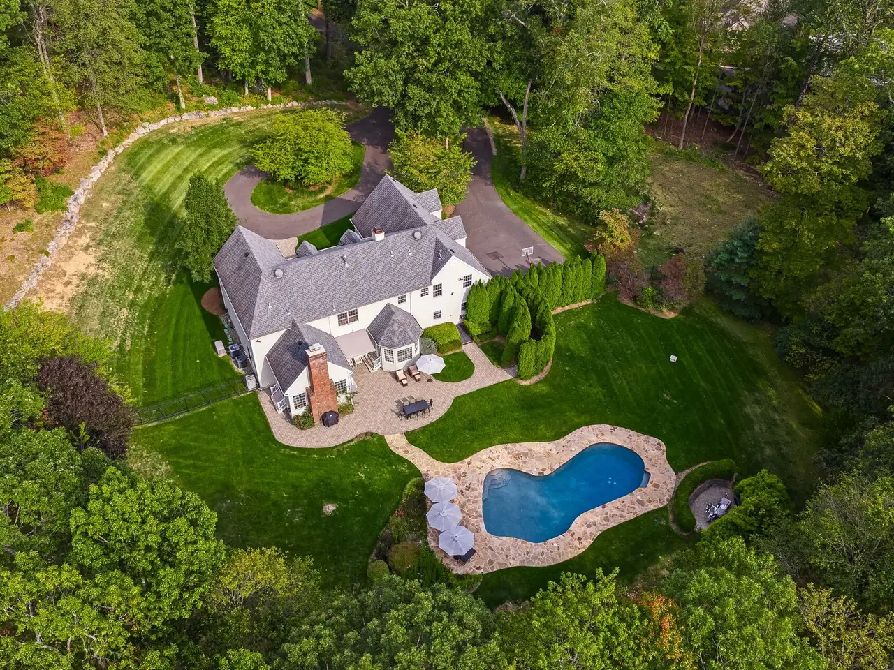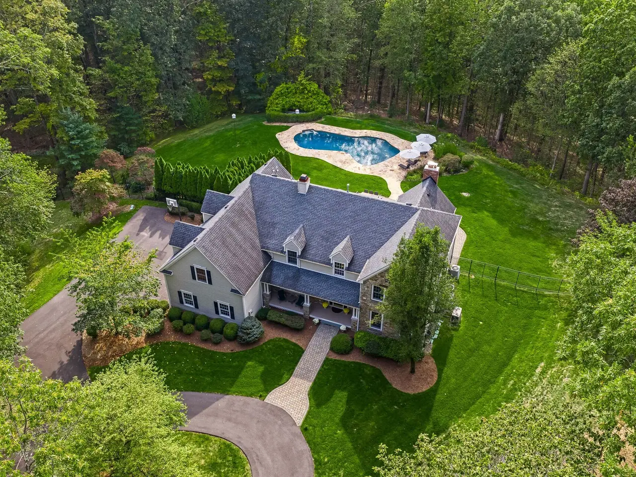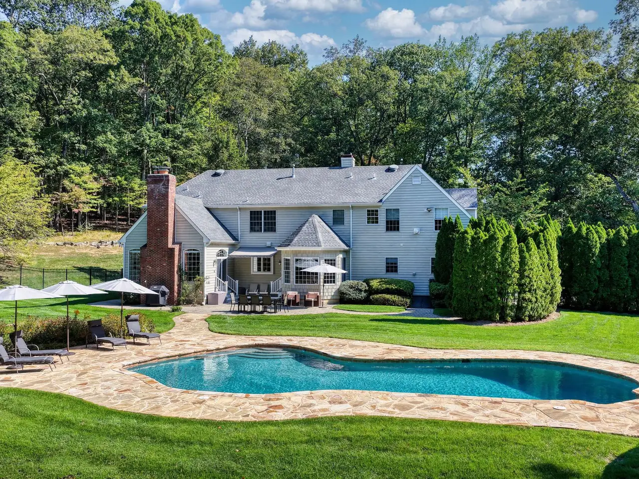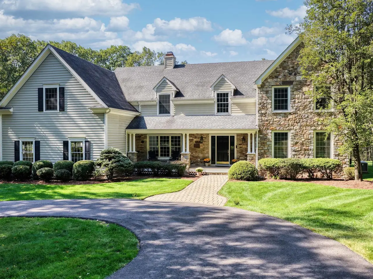 Privately sited on a quiet cul-de-sac, this striking stone and cedar residence, complemented by a three-car garage, is gracefully set on 5+ acres of manicured grounds surrounded by conservation land for lasting privacy. From the circular drive, the property unfolds to a backyard paradise with a saltwater pool, Tennessee sandstone patios, and deer fencing that preserves the landscaping's beauty. Inside, a two-story foyer opens to the formal dining and living rooms, enhanced by French doors and custom millwork. The expansive kitchen, breakfast room, and family room form the heart of the home, where walls of windows and a soaring fieldstone fireplace create warmth and connection to the outdoors. A mudroom with laundry, informal powder room, and back staircase ensure convenience. Upstairs, the primary suite offers a sitting area with gas fireplace, dual walk-in closets, and a spa-like bath. Two bedrooms share a Jack-and-Jill bath, with two more bedrooms and another full bath completing the level. The versatile lower level provides recreation space, a wine closet, half bath, storage, and direct walk-out access to the backyard. Backing to the 160-acre MacGregor Preserve with access to Chester's thousands of acres of parkland, hiking trails, equestrian facilities, and sports clubs, this location blends rural tranquility with commuter convenience, just minutes from farm stands, shopping, dining, award-winning schools, and Midtown Direct trains.