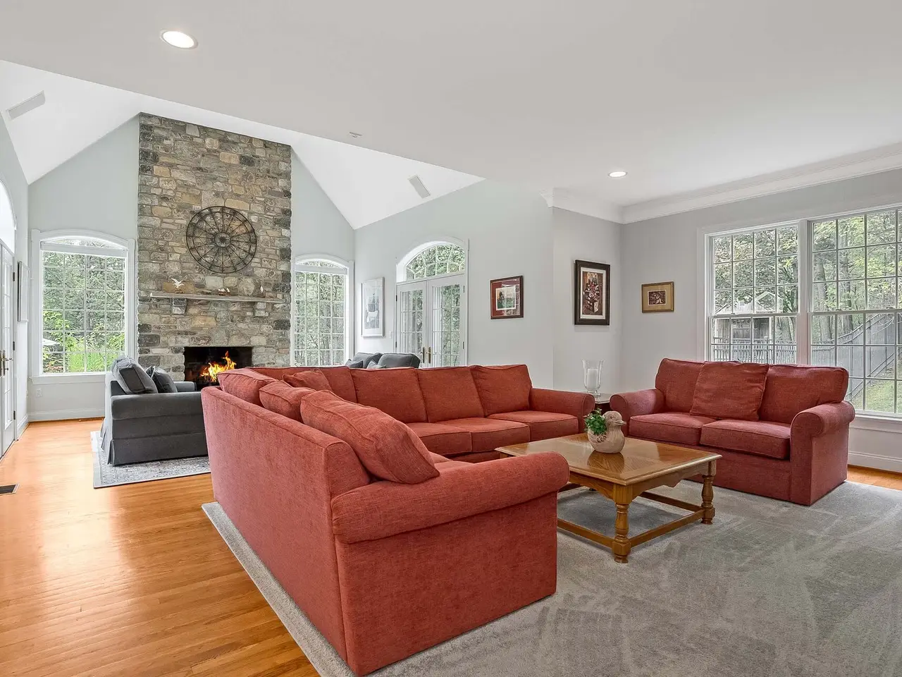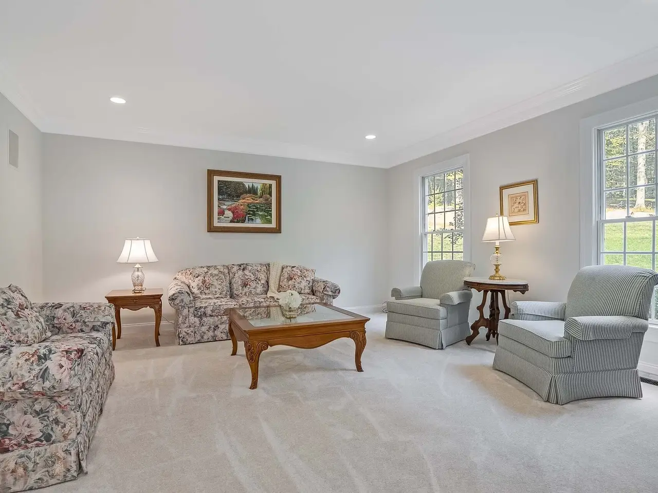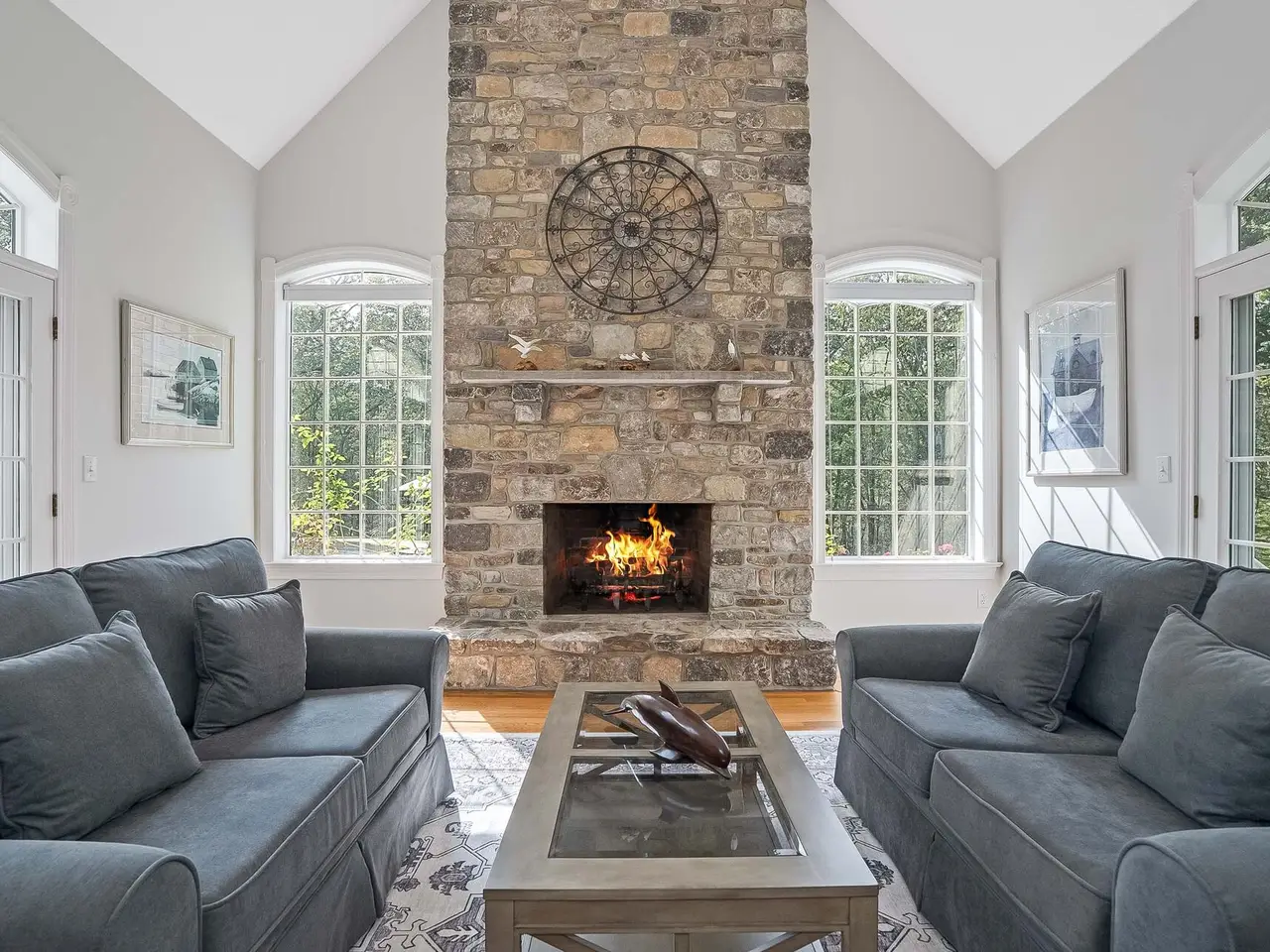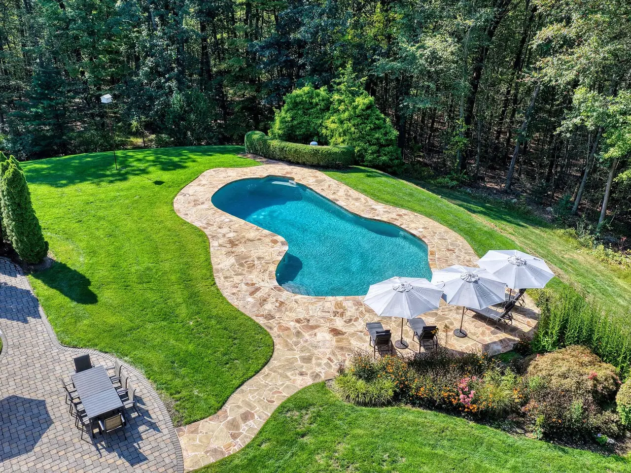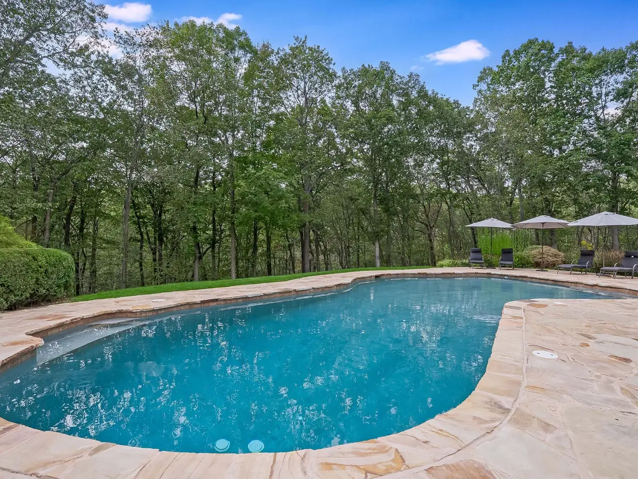 Privately sited on a quiet cul-de-sac, this striking stone and cedar residence, complemented by a three-car garage, is gracefully set on 5+ acres of manicured grounds surrounded by conservation land for lasting privacy. From the circular drive, the property unfolds to a backyard paradise with a saltwater pool, Tennessee sandstone patios, and deer fencing that preserves the landscaping's beauty. Inside, a two-story foyer opens to the formal dining and living rooms, enhanced by French doors and custom millwork. The expansive kitchen, breakfast room, and family room form the heart of the home, where walls of windows and a soaring fieldstone fireplace create warmth and connection to the outdoors. A mudroom with laundry, informal powder room, and back staircase ensure convenience. Upstairs, the primary suite offers a sitting area with gas fireplace, dual walk-in closets, and a spa-like bath. Two bedrooms share a Jack-and-Jill bath, with two more bedrooms and another full bath completing the level. The versatile lower level provides recreation space, a wine closet, half bath, storage, and direct walk-out access to the backyard. Backing to the 160-acre MacGregor Preserve with access to Chester's thousands of acres of parkland, hiking trails, equestrian facilities, and sports clubs, this location blends rural tranquility with commuter convenience, just minutes from farm stands, shopping, dining, award-winning schools, and Midtown Direct trains.