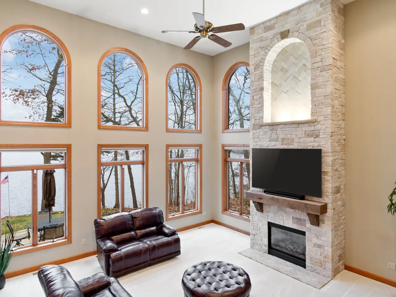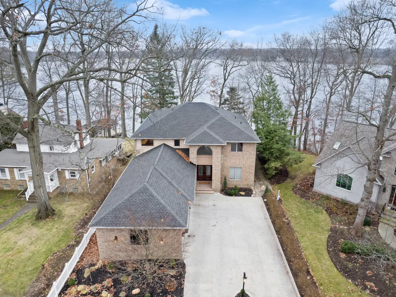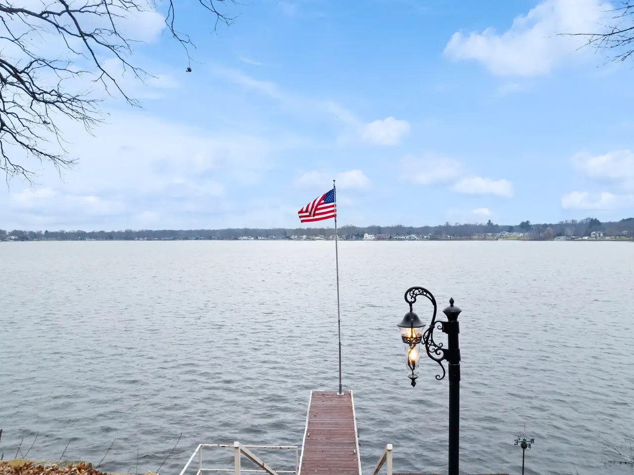 Point Comfort lakefront - panoramic water views - private dock - prime peninsula location on main chain of Portage Lakes. Entry foyer offers views to the lake, new entry door 2022. Great room with wall of windows featuring stunning water views, floor-to-ceiling fireplace encased in natural stone (2022), two story ceilings, and new carpet 2022. Immaculate home featuring numerous recent updates including new roof June 2023 and gorgeous exterior lighting. The kitchen is a chef's and entertainer's dream, opens to a great room/dining area and features stainless KitchenAid appliances 2022, large center island, breakfast bar, and dining area with water views, walk-in pantry adjoins kitchen. Relax and enjoy the views year-round in the four-seasons room with new slider (2022) to lakefront backyard. The expansive owners retreat located on the second-floor features stunning water views, expansive walk-in closet with dressing mirror and secondary walk-in closet. French door from owner’s retreat leads to a private office with extensive built-in cabinetry and beautiful views. Owner's en suite includes a spa tub, separate shower, dual sinks, separate makeup/vanity area. First floor bedroom has a private bathroom, walk-in closet and main floor flex space adjacent to kitchen perfect for your home hub, office, playroom etc. The laundry room located on the main floor provides an abundance of cabinetry, folding table, laundry chute, and utility sink. The third bedroom includes a private bathroom and walk-in closet. The oversized three-car garage offers an abundance of additional storage, direct access to the basement storage area, man door, hot and cold water, drains and finished drywall. Custom brick residence, circular driveway and an abundance of parking. Above ground living area approximately 3,397 square feet, per owner from building plans and approximately 1,200 square feet of partially finished (unfinished drywall) basement area, rough plumbed for half bath and ready for your personal touches/finishes.