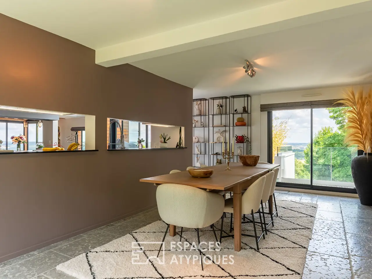 Located on the heights of La Bouille, this 294 m2 contemporary house sits on a 1,800 m2 plot. Its cubic design and clean lines make it a striking architectural achievement, designed to fully embrace the landscape thanks to large bay windows and several terraces with panoramic views of the Seine Valley. Spread over three levels, the house is organized around a dual-aspect living space on the ground floor, entirely clad in Burgundy stone. The open-plan kitchen with a central island and professional range hood opens onto a dining room and a bright living room, structured around a fireplace and a unique view of the river. A 44 m2 terrace with a swimming pool, suspended above the valley, extends the interior space and offers an exceptional visual and sensory experience. Upstairs, the sleeping area includes a large 39m2 landing, a master suite with a dressing room and bathroom, and two additional bedrooms. On the garden level, there are two additional bedrooms with bathrooms, as well as an office. This level also features a laundry room, a cellar, and a closed garage that can accommodate two to three vehicles. In a quiet location, 5 minutes from the A13 motorway and 15 minutes from Rouen, this house with its distinctive architecture offers a privileged living environment combining nature, modernity, and accessibility. Information on the risks to which this property is exposed is available on the Georisques website: www.georisques.gouv.fr ENERGY CLASS: C / CLIMATE CLASS: A Estimated average annual energy expenditure for standard use, based on 2021 energy prices: between €3,220 and €4,440. REF. 11335EAR Additional information * 8 rooms * 5 bedrooms * 3 bathrooms * Floor : 3 * 3 floors in the building * Outdoor space : 1800 SQM * Parking : 2 parking spaces * Property tax : 4 445 € Energy Performance Certificate Primary energy consumption c : 153 kWh/m2.year High performance housing