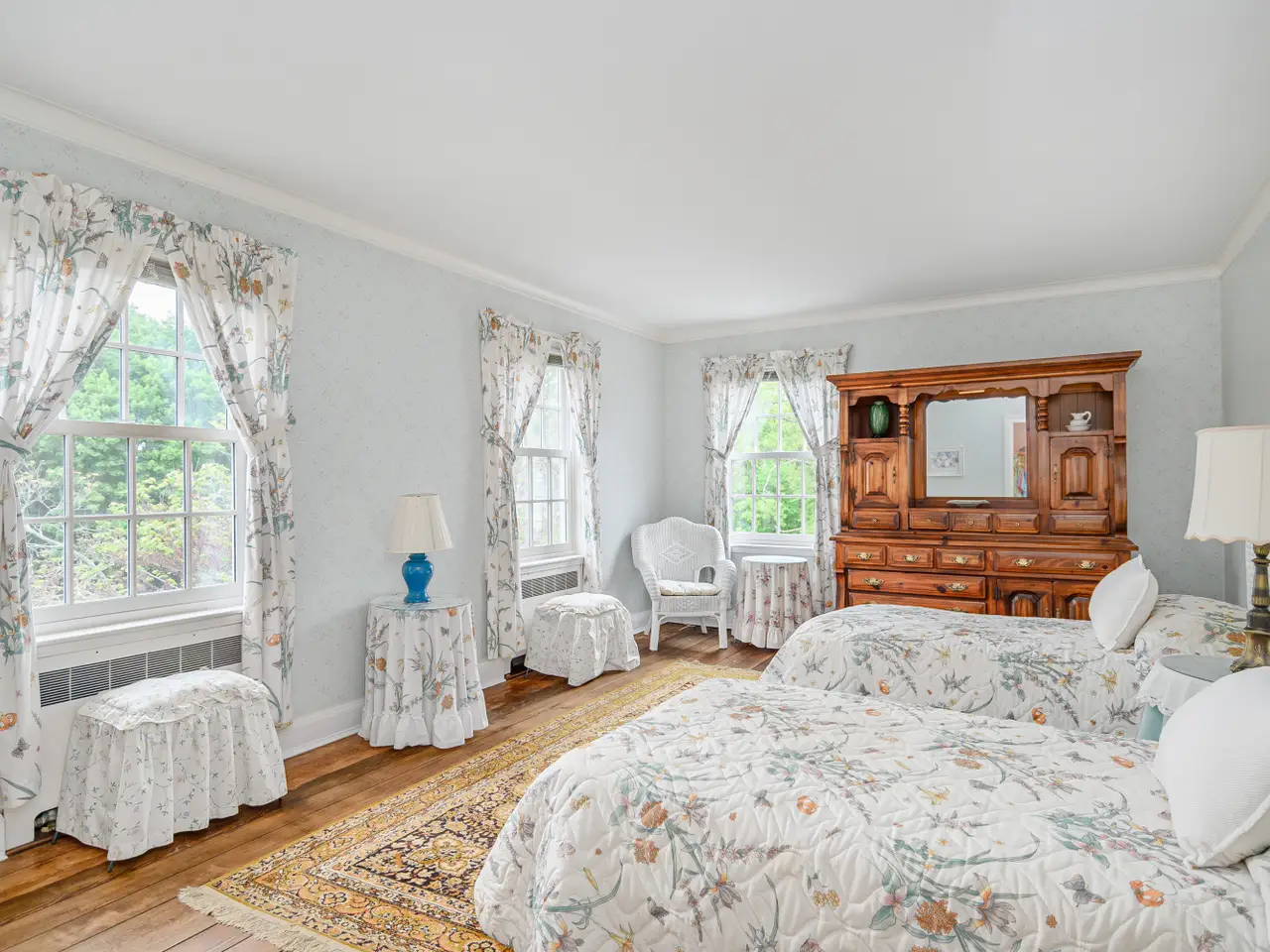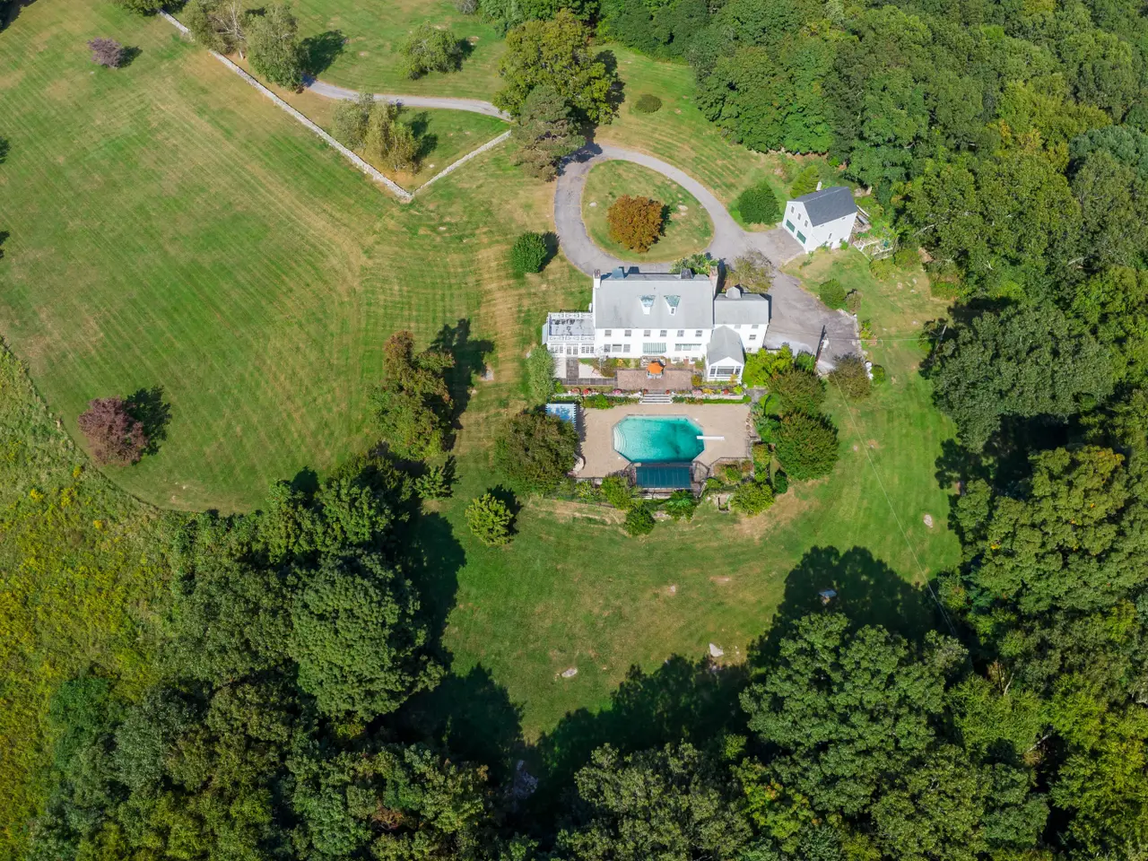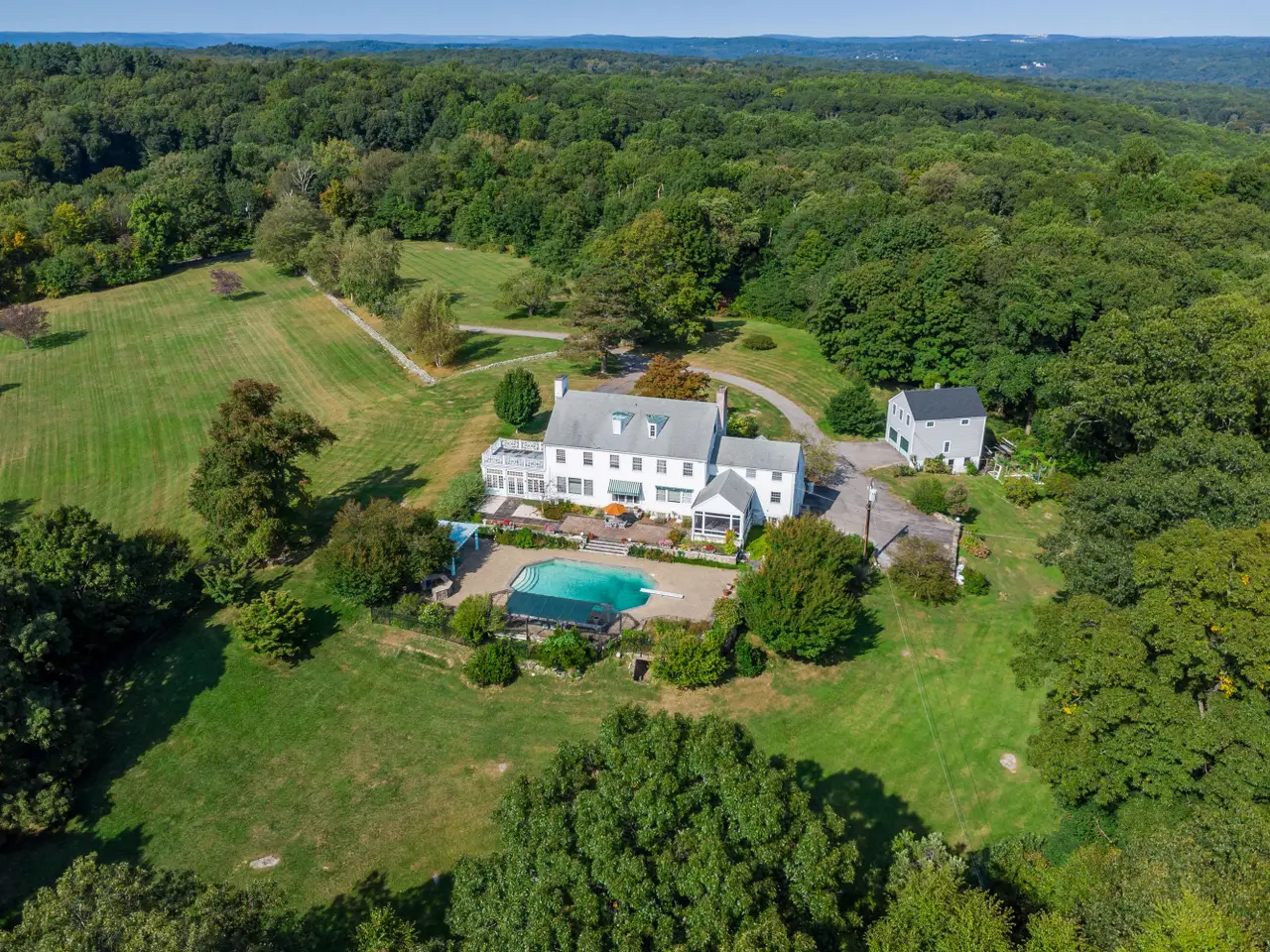 Welcome to 49 Great Ring Road-an iconic estate with breathtaking views and a classic 1940 built home full of charm and elegance. Step into the front-to-back foyer and take in the sight lines to the expansive stone patio and sparkling pool. At the heart of the home is the great room, featuring a soaring ceiling and a grand fireplace-perfect for gatherings. The custom cherry sunroom is a showstopper with wide plank chestnut floors, coffered ceiling, and French doors leading outside. Host memorable dinners in the banquet-sized dining room with built-ins and a cozy fireplace. The updated kitchen features granite counters, a breakfast bar, large pantry, and adjacent laundry area. A delightful breakfast room and an oversized screened-in porch complete the space. The primary suite is a two-room retreat with two fireplaces, ample closets, dual baths, and a balcony overlooking the grounds. Upstairs, you'll find three additional ensuite bedrooms, plus two more bedrooms with a shared full bath. The finished lower level includes a custom bar and a parlor with fireplace. Potential in-law suite over the kitchen with a full bath. A detached two-car garage includes guest quarters. Additional land available-an extraordinary opportunity. The right side of the house features air conditioning via a split system, while the left side (as you face the home) does not have A/C but could be easily updated. The guest house will require a new kitchen. There is also space above the kitchen that could serve as an in-law suite or playroom. Please refer to the floor plans for a better understanding of the layout-this exceptional home offers an abundance of flexible and beautifully designed space.