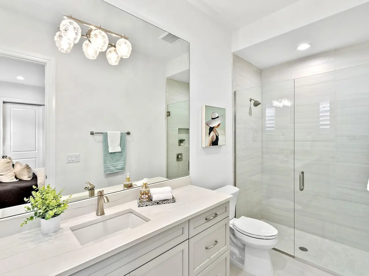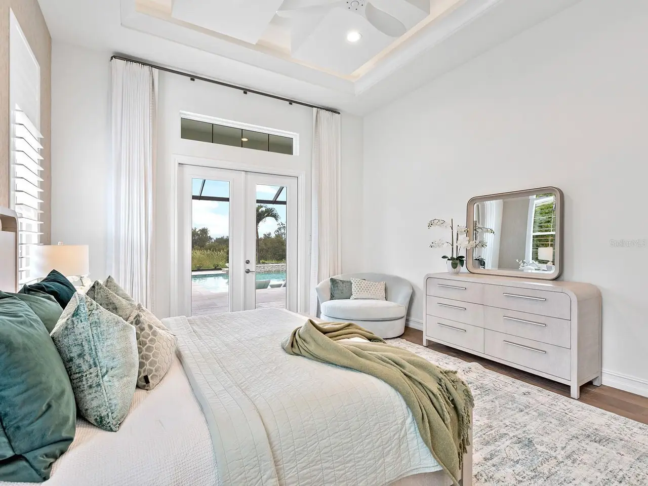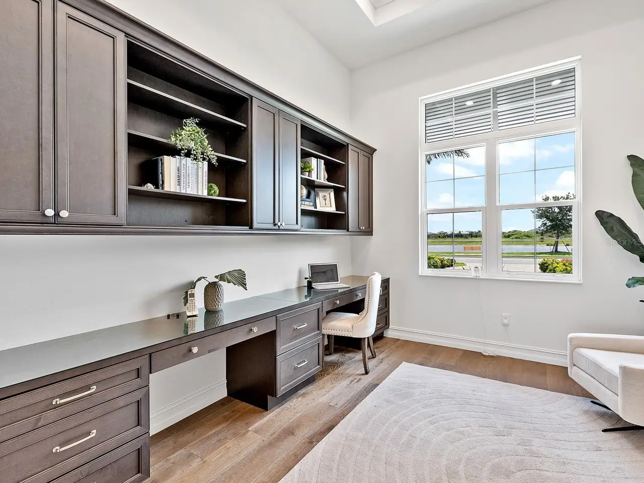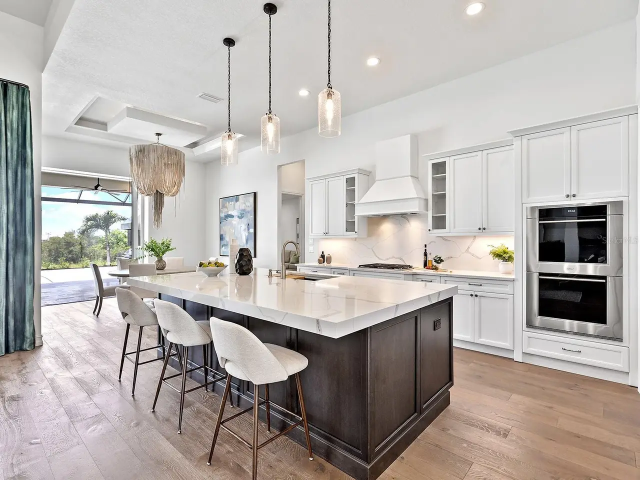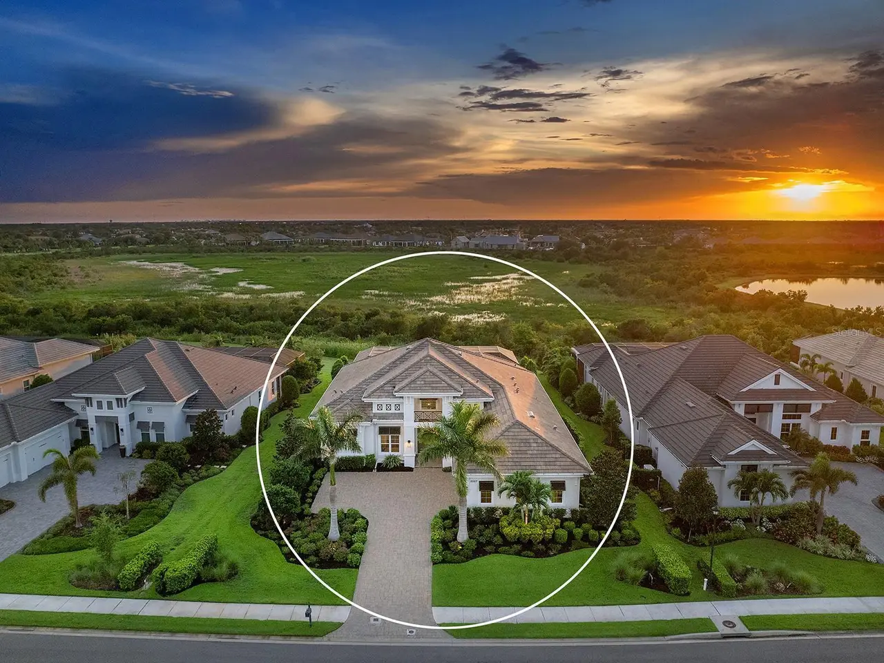 Prestigious living in The Lake Club of Lakewood Ranch is within reach! Nestled among towering palms and verdant landscaping is this completely, custom Madison II home built by Stock Luxury Homes in 2021. The lush Florida conservation wetland provides a beautiful backdrop for the western rear exposure with spectacular sunsets. This entire residence had every detail carefully hand-selected to evoke a luxurious and comforting residence including oak hardwood flooring, cove crown molding and custom ceilings, high-end designer light fixtures, plantation shutters, and top-of-the-line functional selections in every room. Superior details and a sense of security continue with high-end construction, impact doors and windows throughout, additional remote control hurricane screens on the lanai, 22kw whole-house generator, surge protector, and whole-house water filtration system. The central great room is the heart of the home with custom coffered ceiling, custom built-in display shelving and entertainment cabinetry, and a full wall of impact sliding glass doors to the lanai. Enjoy a modern open-concept floor plan that flows effortlessly throughout the living areas and out onto the marble paver lanai. With beautiful and private views of the preserve, the lanai offers a serene space to gather around the gas fireplace and under wood ceilings, take in the views from panoramic screen enclosure, or dine by the outdoor kitchen. The custom saltwater pool offers a sunken 360-edge spa, sunshelf, Nebula lights built into the screen enclosure to create a starlight effect above, and a built-in fire bar feature plus water bowls – you won’t find another lanai like this at any other home. The luxurious lifestyle continues indoors with the executive kitchen that is expertly outfitted with high-end appliances including Wolf gas cooktop, Miele dishwasher, Sub-Zero refrigerator, and dual Wolf wall ovens. The custom cabinetry offers complimentary two-tone colors, thick quartz counters with full-height backsplash, pots and pans drawers, additional integrated pantry tower, and a walk-in pantry with shelving. The adjacent dining room has custom ceilings, disappearing corner impact sliders, and a breathtaking designer chandelier. Work from home in the study equipped with dual built-in desks with glass tops, file drawers, and display shelving. The primary suite sparkles with designer wallpaper, custom ceilings, impact French doors to the lanai, and impressive dual walk-in closets with custom closet systems. The spa-like bathroom gives you a five-star experience with dual vanities, make-up space, linen closet storage tower, modern freestanding soaking tub, and walk-in shower with rain shower head. Guests will find similar comfort in two guest suites with their own private en-suite bathrooms. The spacious rear bonus room is ideal for gathering with a custom dry bar with quartz counters, mirrored backsplash, display cabinetry, and two Sub-Zero wine refrigerators. There is also a dedicated full pool bathroom with walk-in shower and exterior lanai access, plus a guest powder bathroom. A functional laundry room, mudroom-style garage entry, spacious 3-car garage and oversized driveway complete this impressive home. You’ll also enjoy a lower property tax bill than other homes because the debt portion of the CDD Lakewood Ranch Stewardship has been PAID OFF. The Lake Club is an exclusive premier, gated community with a Grande Clubhouse, restaurant, pool, tennis, pickleball and more.