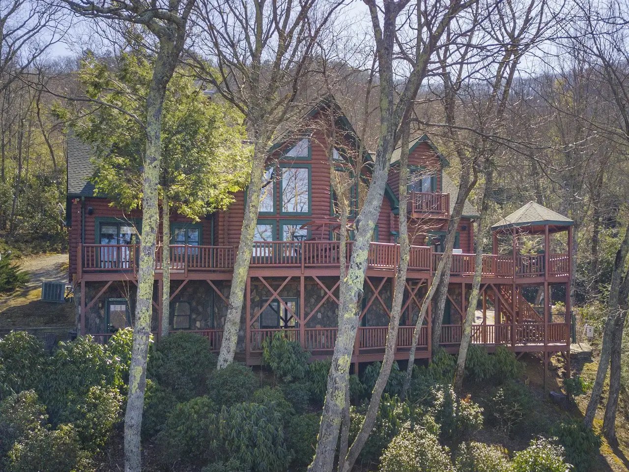 Experience the pinnacle of Maggie Valley mtn living in this custom lodge-like log home, nestled at a breathtaking 4200' elevation. Set on over 3 acres, the home offers privacy and inspiring views. Inside, discover high-end custom finishes throughout. The expansive open-plan living area features a stunning stone fireplace, and the large windows frame awe-inspiring views. Huge primary bedroom suite on the main also enjoys a fireside setting, along with direct access to the sprawling deck. Upstairs you'll find two more bedrooms, bathroom, and a large loft overlooking the 2-story great room. Ideal for entertaining, the lower level boasts a den with pool table/fireplace/bar, bonus rooms, garage, and abundant storage space. Outside, you'll find ample deck space to enjoy the cool summer temps. Newly stained/sealed exterior and new roof ensures lasting beauty/durability. Below the home is a small site-built cabin, perfect as a playhouse or hobby space. 600 sq ft detached studio/workshop is ideal for creative/practical pursuits. Paved roads lead to the gated property. Adjoining included parcel makes a great buffer... or an additional build site with big views! This gated property has so much to offer, and it is your opportunity to own a piece of Blue Ridge paradise.