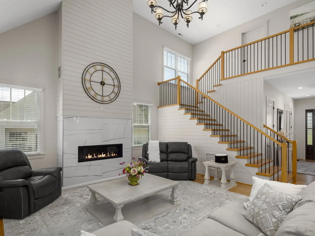 Welcome to this stunning 5-bedroom, 4.5-bathroom home in Hollabrook Farm, that seamlessly blends sophistication with livability. Upon entering, you'll be greeted by an elegant entrance featuring slip and frost-resistant tile, leading to a grand foyer adorned with a crystal chandelier. To your left, you'll find a beautiful dining room, and to your right, through French doors, an office complete with a walk-in closet. The rear of the home boasts a two-story great room with soaring windows that offer breathtaking views. From the great room, you can step out onto a slip and frost-resistant tile covered patio, perfect for enjoying the backyard and mountain scenery. The chef's dream kitchen features a massive island, a 5-burner gas cooktop, high-end KitchenAid appliances, and a charming breakfast nook. Adjacent to the kitchen, a rear foyer provides a convenient space for coats and shoes, with direct access to the laundry room. The spacious owner's en suite bedroom on the main level offers a custom bathroom designed for ultimate comfort, featuring double-insulated exterior walls, ample cabinetry, a vast shower, and a soaking tub for spa-like relaxation. Ascending the custom wood staircase, you'll discover three additional en suite bedrooms, along with another bedroom featuring a full bath conveniently located in the hallway. The upper level also includes a dedicated study, a spacious recreation room perfect for games, exercise, and activities like pool and ping pong, and a versatile bonus room ideal for storage or a home theater. This must-see home truly offers an unparalleled living experience.This must-see home truly offers an unparalleled living experience. Residents of Hollabrook Farm enjoy a pond, pool, clubhouse, and walking trails. Don't miss your chance to own this exquisite home! See the video!
