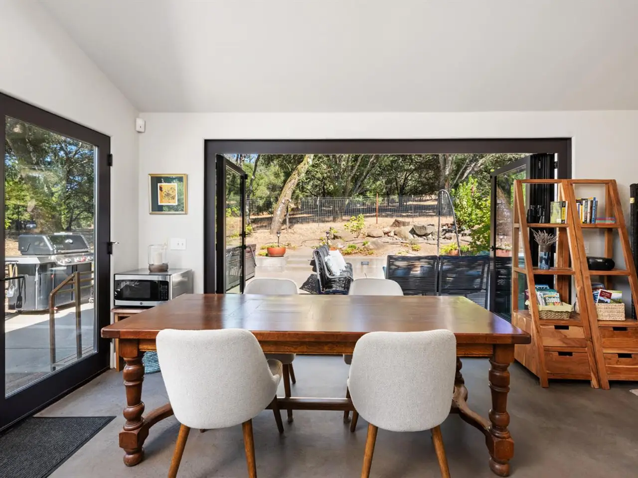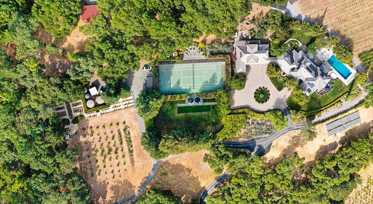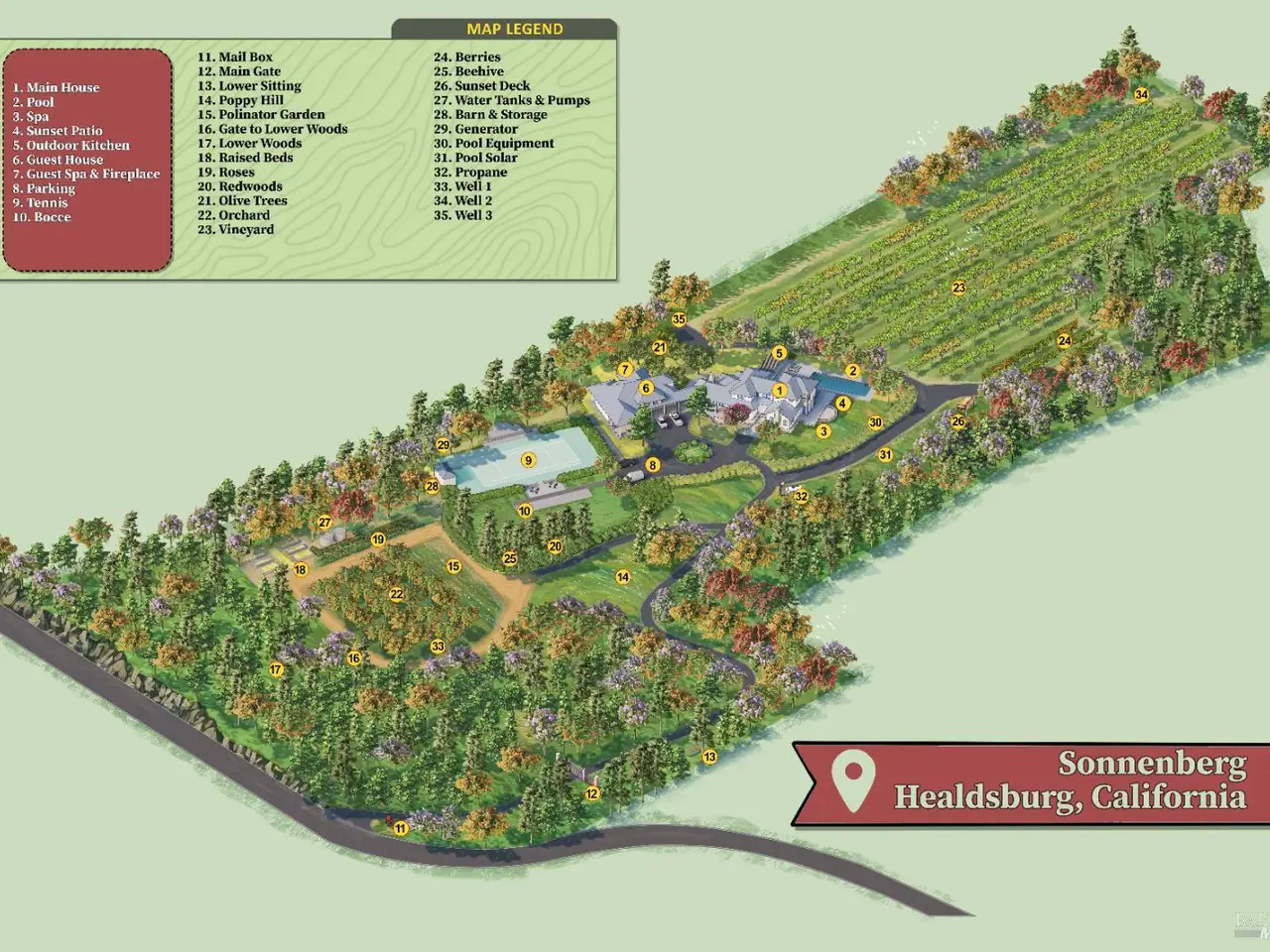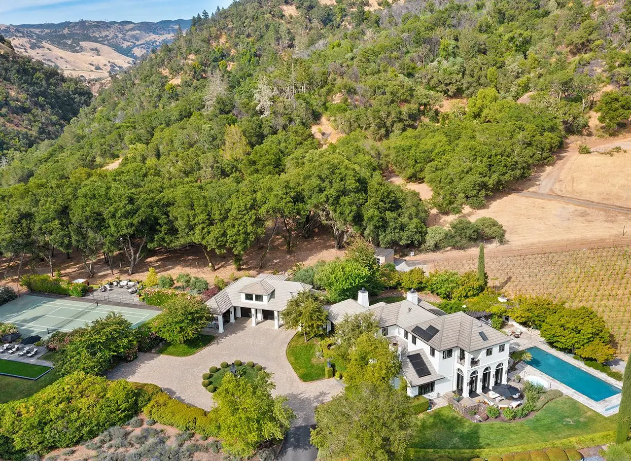Welcome to 4395 Pine Flat Road, an elegant Healdsburg estate offering some of the most breathtaking views in Sonoma County. Just minutes from downtown yet worlds away, this extraordinary property blends luxury, comfort, and resort-style amenities on 10-plus mostly usable acres. The main residence consists of a four-bedroom, five-bathroom home is designed for both entertaining and everyday living. High ceilings, rich wood floors, and expansive windows frame vineyard and mountain vistas at every turn. Highlights include a Chef's kitchen with bar seating and seamless flow to the outdoor dining pavilion, formal dining room and multiple living spaces including a family room, library/office, gym, and wine cellar, main-level suite perfect for guests or multi-generational living, upstairs primary suite with private balcony, sitting area, and generous storage. A spacious detached studio offers flexible use for guests or extended family. Its outdoor entertainment area, complete with fireplace, is ideal for gatherings under the stars. This estate was made for relaxation and play, featuring a sparkling pool and hot tub, tennis court and bocce court, outdoor kitchen and vineyard-view dining, orchard, rose gardens, and raised garden beds, serene spots for birdwatching or simply doing nothing at all.