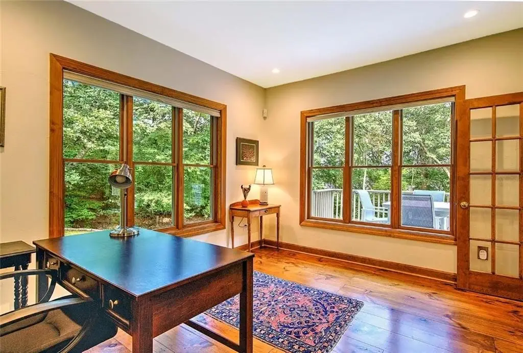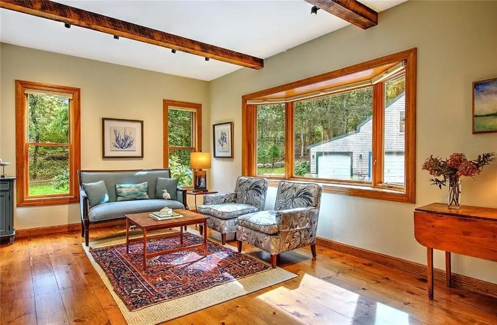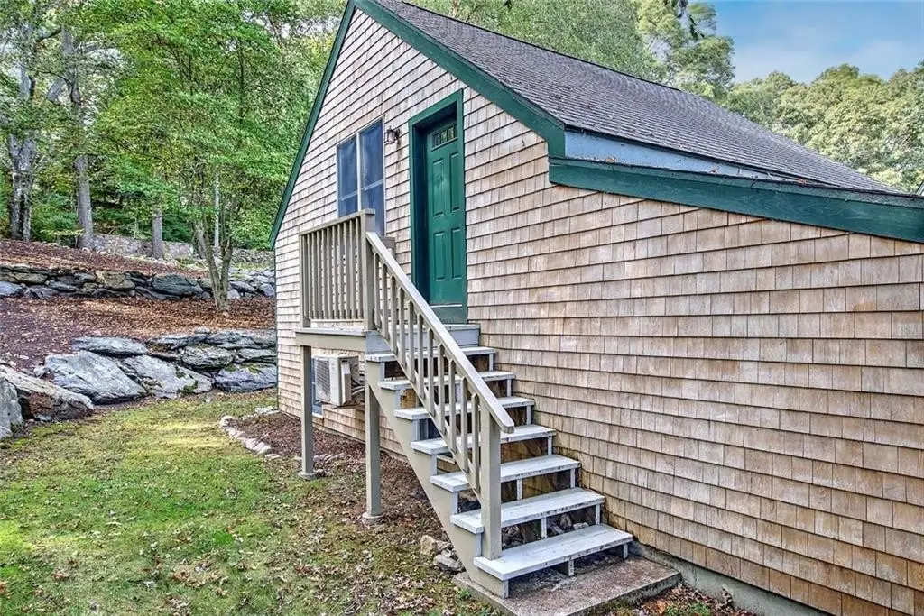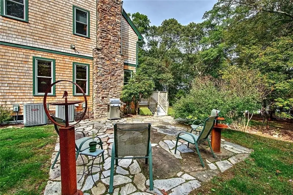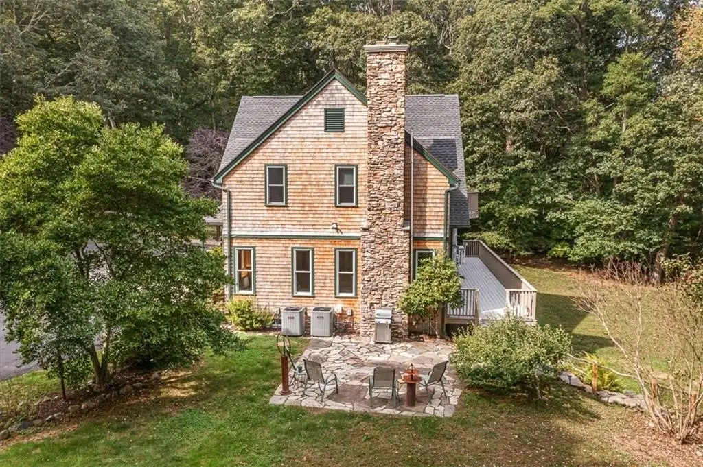 Adirondack inspired waterfront home on Narrow River in Saunderstown. Incredibly peaceful and serene spot nestled amid meandering stone walls and nature inspired landscape on 2.63 private acres. Wander down the wide path to enjoy a very special alcove beach at the waterfront. Have a daily swim in the refreshing water or have a late afternoon kayak trip around the river. The newly cedar shingled Colonial was built in 2000 but rebuilt in 2019. The light filled living room has a wood burning stone fireplace, lovely wood floors and a beamed ceiling. The kitchen has beautiful honed black marble counters, tile backsplash and stainless steel appliances. The center island has river views over the expansive waterside deck and private back yard. There is a first floor office off of the kitchen and a huge laundry room and half bath. Upstairs encompasses a large primary ensuite bedroom with a stunning bath with soaking rub, double sinks and a glassed in tiled shower. There are three more generous sized bedrooms and another full bath to complete the second floor. The walk out lower level has a finished media room and another full bath and utility room. The three car garage has a finished 864 sq. ft. loft with a mini split for heat and AC. The house has a whole house generator, and AC. Centrally located in the state, Saunderstown is a 1.5 hour drive from Boston and an easy 3 hour train ride from NYC. The famed South County beaches are just a short 5 minute drive down Route 1.