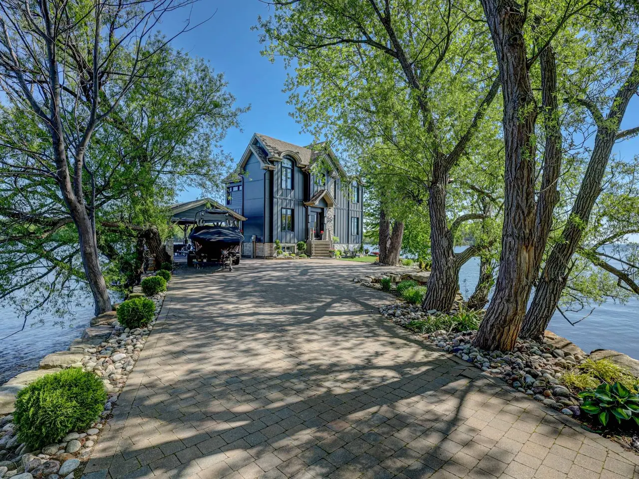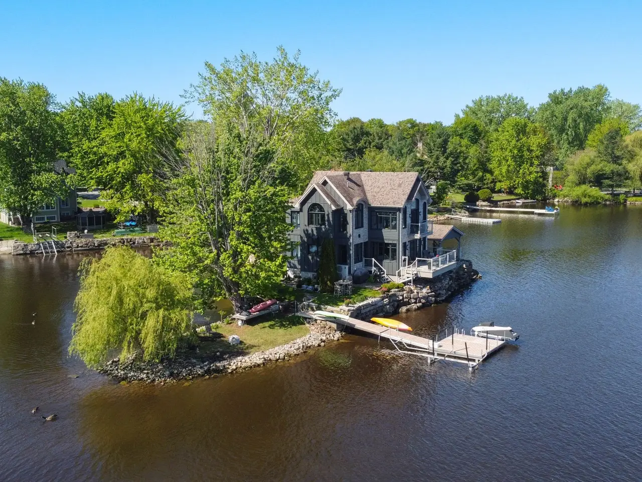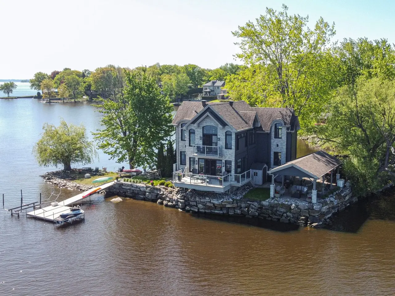 Experience unparalleled waterfront living on a private peninsula with 360-degree views of Lac St-Louis, gated entrance, and a stunning unistone driveway. This exceptional home features three fireplaces and an open-concept main floor with breathtaking views. The chef's kitchen boasts granite counters and a butler's pantry. Upstairs, the retreat-style primary suite offers walls of windows, 10-foot ceilings, a spacious walk-in closet, and an ensuite. 2 bedrooms with basement or office that can be converted into a 3rd bedroom. Built in 2008 and beautifully rejuvenated in 2021 with new siding, triple-pane windows, and exterior doors. A rare gem.