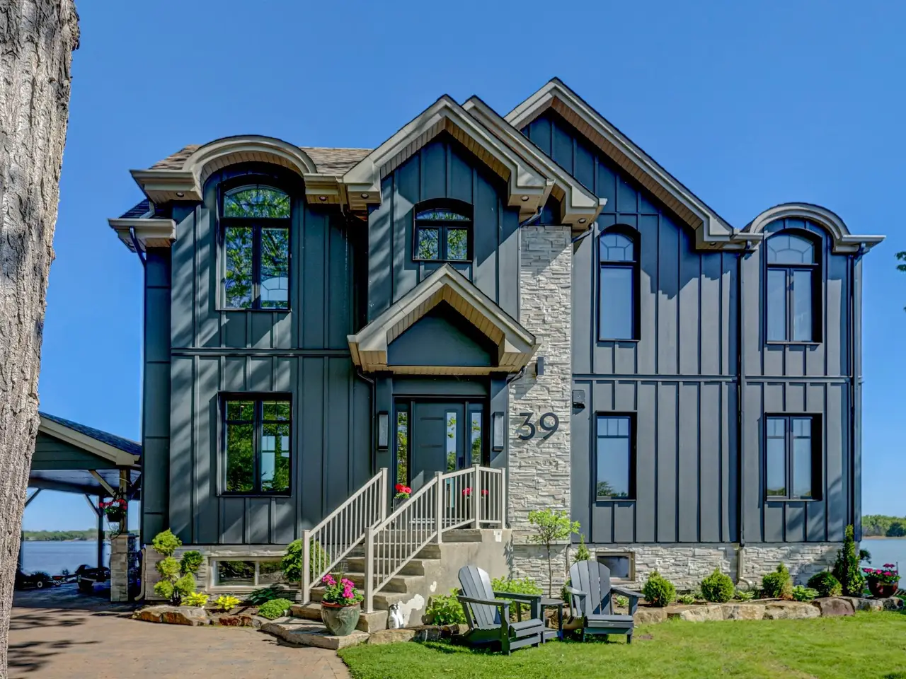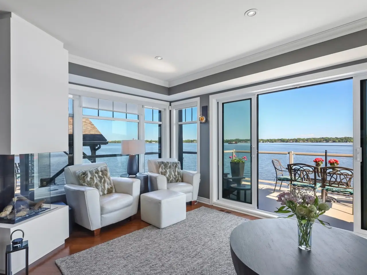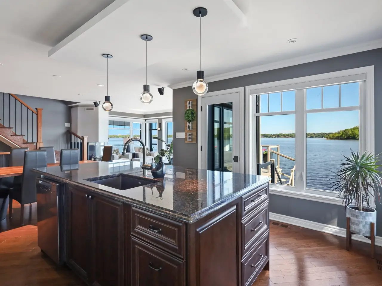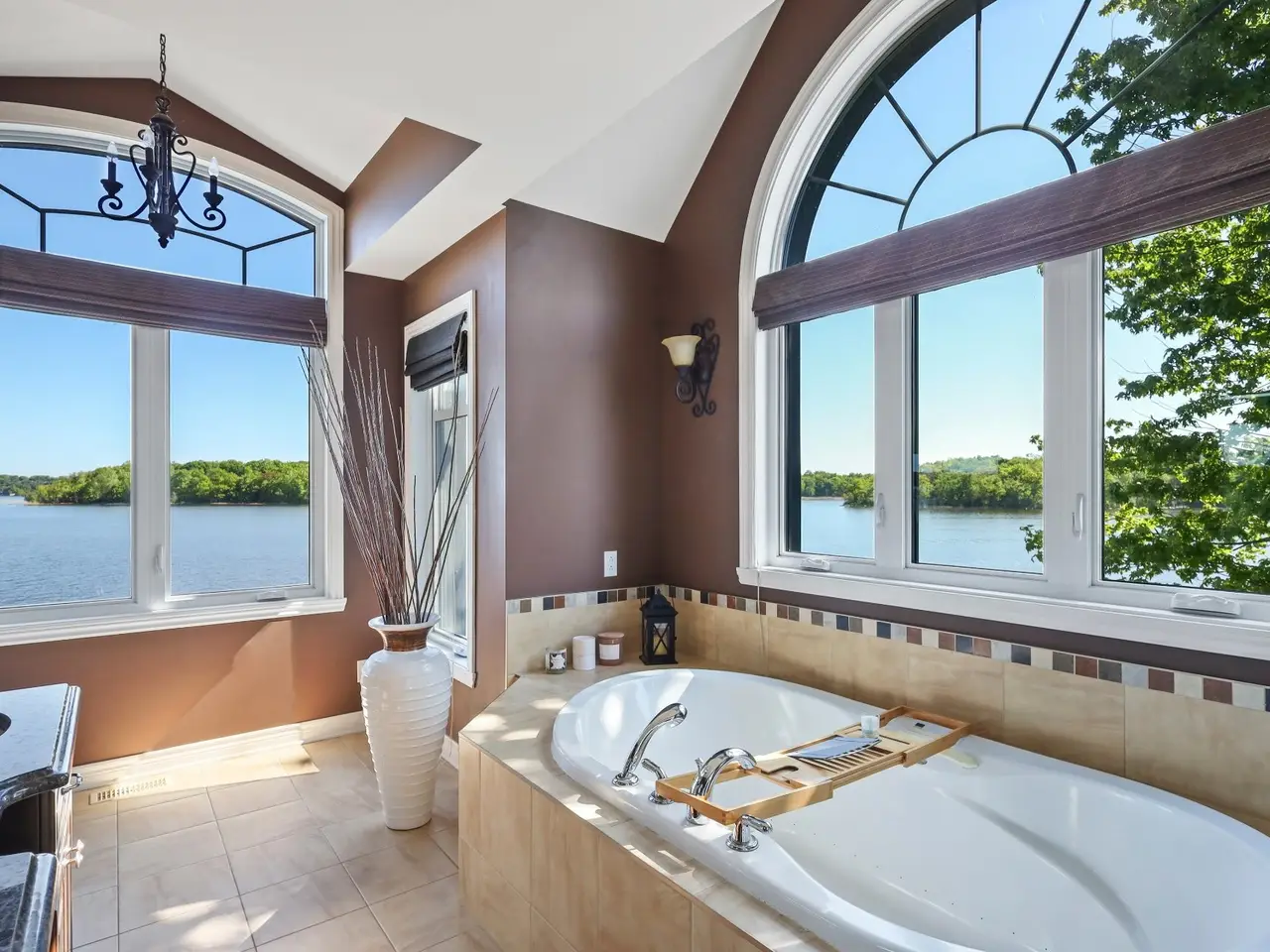 Experience unparalleled waterfront living on a private peninsula with 360-degree views of Lac St-Louis, gated entrance, and a stunning unistone driveway. This exceptional home features three fireplaces and an open-concept main floor with breathtaking views. The chef's kitchen boasts granite counters and a butler's pantry. Upstairs, the retreat-style primary suite offers walls of windows, 10-foot ceilings, a spacious walk-in closet, and an ensuite. 2 bedrooms with basement or office that can be converted into a 3rd bedroom. Built in 2008 and beautifully rejuvenated in 2021 with new siding, triple-pane windows, and exterior doors. A rare gem.