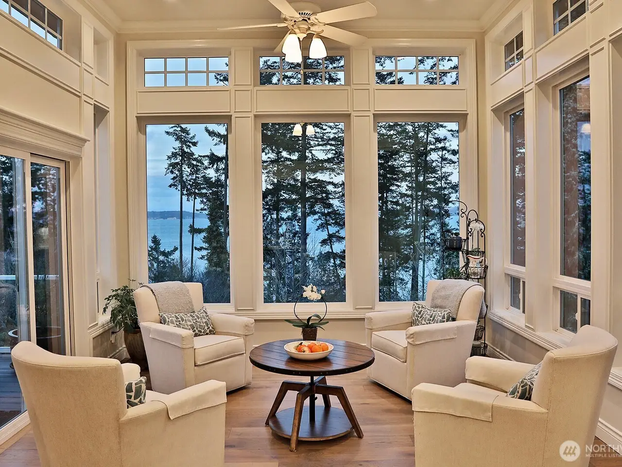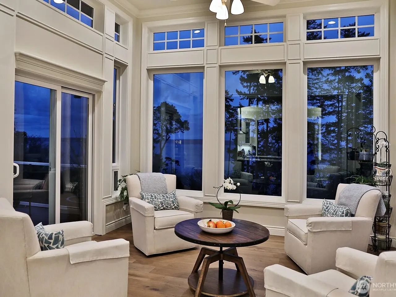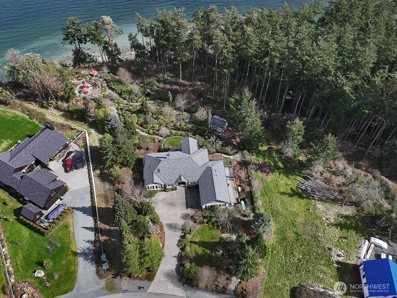 Experience the perfect blend of luxury and serenity in this stunning retreat. Greet each day with breathtaking views of lush gardens, sparkling water, and Mt. Baker's glow. Wander through vibrant blooms, fruit trees, an artist's studio, a totem pole, and inviting outdoor spaces. Expansive windows fill the open-concept living area with light, highlighting a double-sided travertine fireplace, custom cabinetry, and high-end appliances. The main floor was reimagined in 2023 by architect Stig Carlson and designer Lezlie Trujillo. New roof, exterior paint (2024), whole-house generator, Starlink, and a private lower-level apartment add versatility and peace of mind..