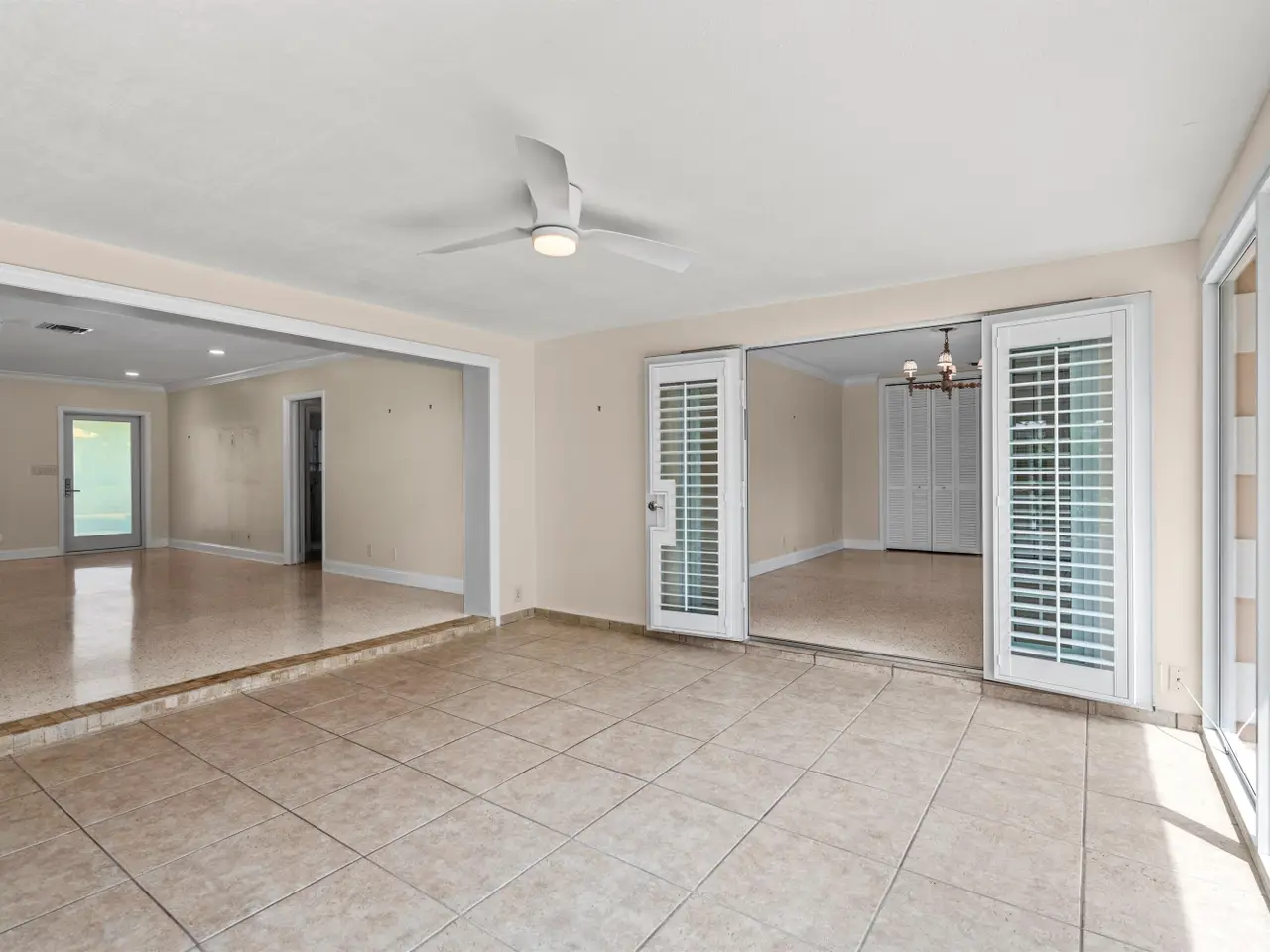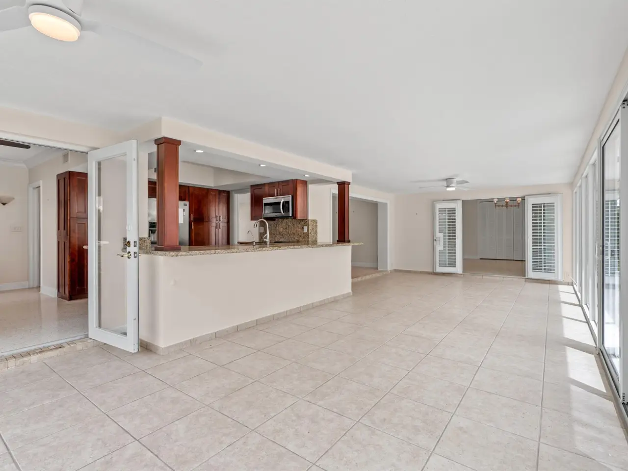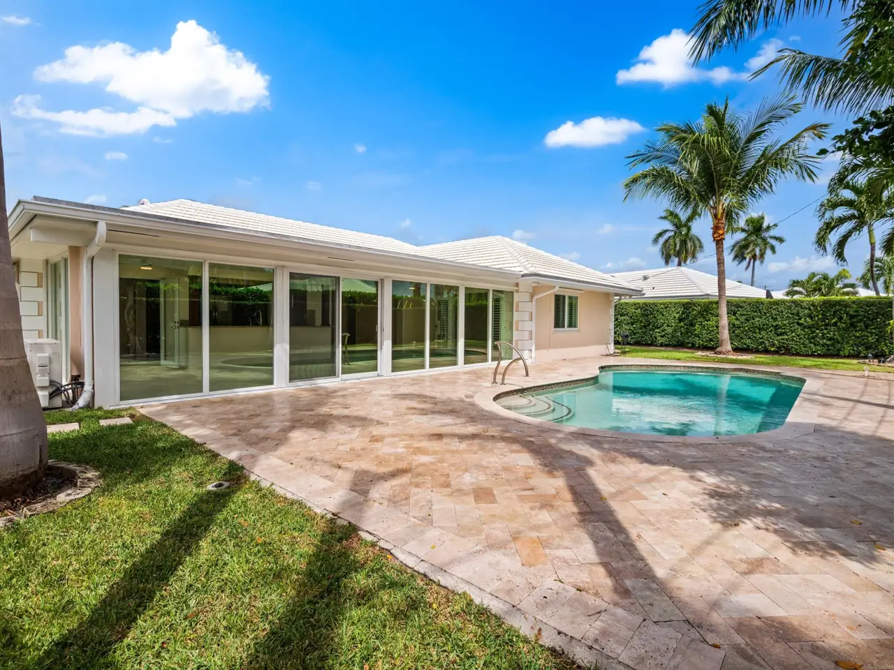 Located in desirable Camino Gardens, this classic Bermuda-style residence presents a harmonious blend of tropical character and modern sophistication, featuring an updated gourmet kitchen and designer bathrooms. The light-filled interiors span 2,539 +/- total square feet in a free-flowing, open floor plan. Architectural details include crown moldings and elegant plantation shutters. The central great room is perfectly situated for entertaining, serviced by a spacious bar connecting it to the kitchen. The kitchen is equipped with Mahogany Shaker cabinetry, granite countertops, and stainless-steel appliances. The adjoining breakfast nook offers a built-in buffet with glass showcase cabinetry.
