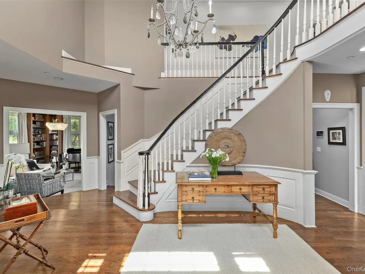 This meticulously designed Colonial in the prestigious Chappaqua Central School District provides a true haven for those who appreciate refined living with a contemporary turnkey design aesthetic. The blend of traditional and contemporary vibes creates an exquisite mix of sophistication and relaxed comfort for entertaining and everyday living. Featuring high-end finishes throughout, every level of this stunning home has been thoughtfully upgraded. At the heart of the home, an inviting great room showcases a floor-to-ceiling stone fireplace flanked by dramatic picture windows that showcase the gardens beyond, providing a front row seat to the magnificent color of the changing seasons. This room seamlessly connects to an updated gourmet kitchen with an oversized island and wine storage plus ample seating perfect for gathering and entertaining. The thoughtfully considered coffee bar and beverage center make mornings a pleasure. The custom library with floor-to-ceiling oak shelving, built-in cocktail bar, and additional picture windows looks out over the expansive grounds and hand-stacked stone wall, onto the shimmering pool beyond. This library space leads to a private office, while the elegant dining room with wainscoting provides an ideal setting for both intimate dinners and larger celebrations. The grand foyer presents a double high space with a graceful curved front staircase leading to the second-floor Primary Suite, where custom backlit molding and built-in oak shelving add warmth and sophistication. The Waterworks spa-like primary bath features radiant heated floors and abundant natural light. A second en-suite bedroom offers privacy for guests, while two additional bedrooms are connected by a stylish full bath with heated floors, no-step shower, and under-cabinet lighting. At the end of the long hall, a bright and spacious bonus room with custom built-in cabinets offers endless possibilities, with a back staircase leading from the bedrooms to the mud room with custom cubbies, shelving and side door. The walk-up third floor boasts expansive finished storage illuminated by natural light. Meanwhile, the incredible lower level is a suite unto itself, designed for versatility: featuring a large, bright art studio; stylish room with custom-designed sliding doors for versatile usage; barn doors leading to deep storage space; a state-of-the-art workout area; yoga studio; and a home theater/game room/lively entertainment space. Step outside to a backyard paradise, where a stone patio opens onto a resort-style oasis including a heated gunite pool and spa surrounded by lush mature and meticulously planned landscaping, creating a private retreat for every season of the year. A luxurious cabana with Wi-Fi, whole home sound system and outdoor TV provides a shaded lounge area, perfect for unwinding poolside. The fully equipped outdoor kitchen makes al fresco dining effortless for large parties or small gatherings. Enjoy fresh vegetables from your very own organic garden. A true sanctuary in every way, every detail of this extraordinary home has been curated to offer timeless elegance and modern convenience for a contemporary lifestyle.