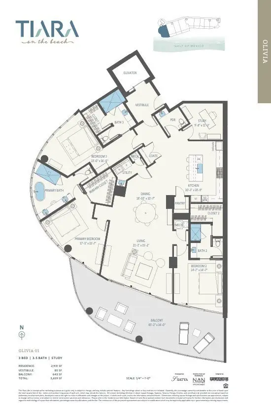 Open House November 1st 11:00AM-3:00PM. Now under construction! Welcome to the Olivia floorplan at Tiara on the Beach– This floorplan is located on the 4th floor and redefines the art of gracious living with a private elevator vestibule, lofty 10’ ceilings, and all Thermador appliances. Contemporary and sophisticated, Tiara on the Beach will be an architectural gem nestled along one of Galveston Island’s prime locations. This luxury residence will offer an amenity-rich lifestyle on Galveston Island. Features include spacious open floor plans and endless water views. Distinctive finishes such as Italian cabinetry and the highest levels of design and craftsmanship await you. Visit our one-of-a-kind sales gallery that includes a scaled model to showcase the architecture and amenities on 300ft of beachfront. Total square footage includes square footage of balcony. Completion scheduled for Summer of 2027.