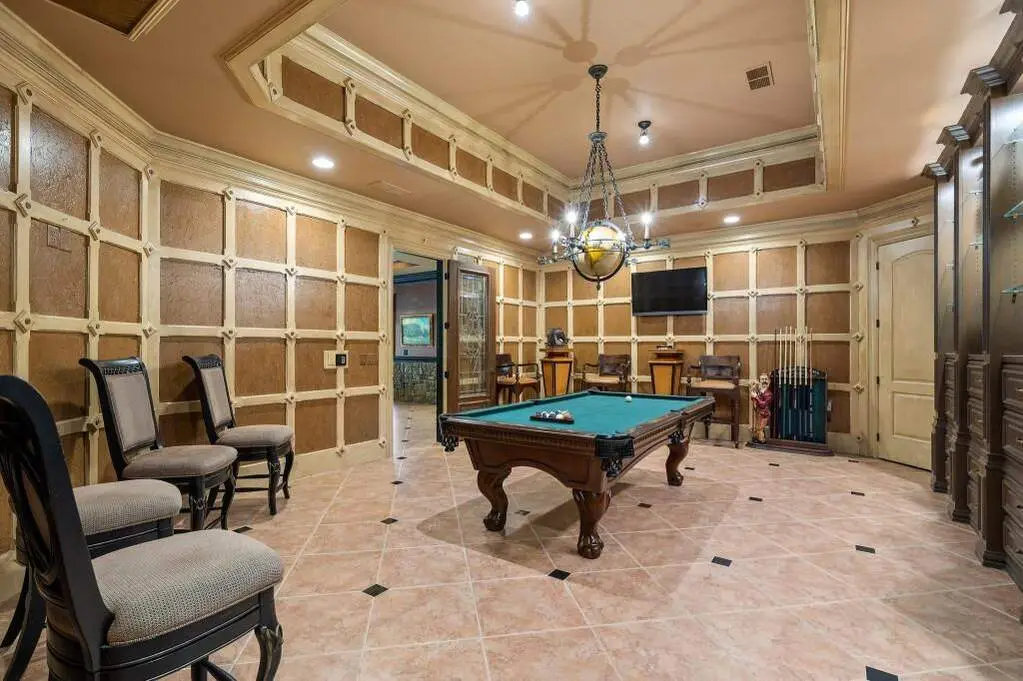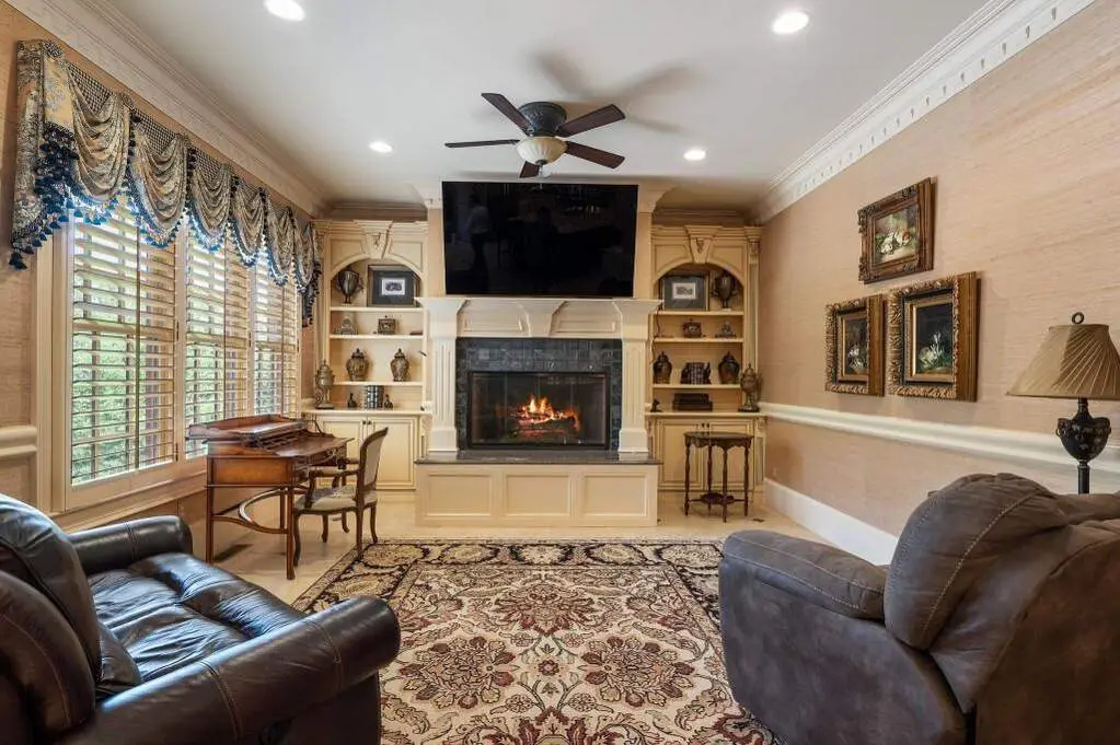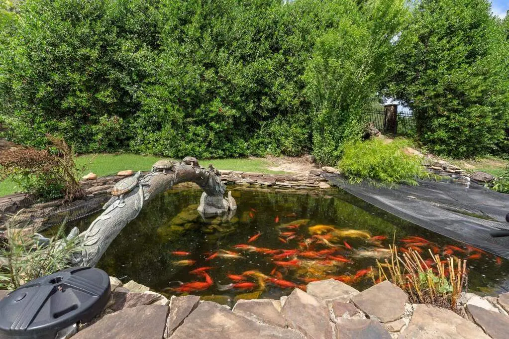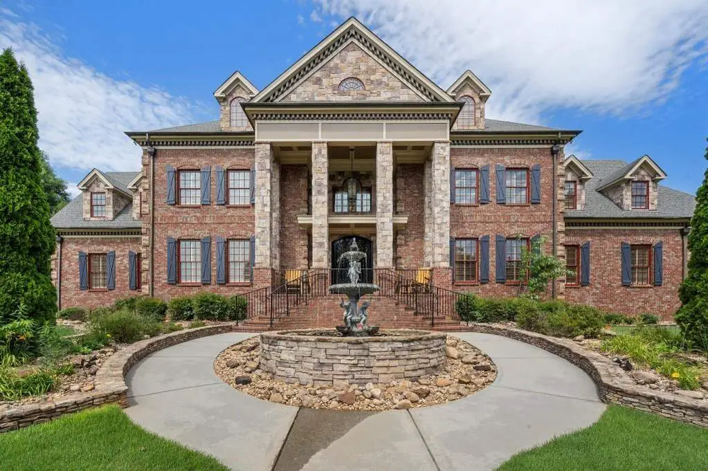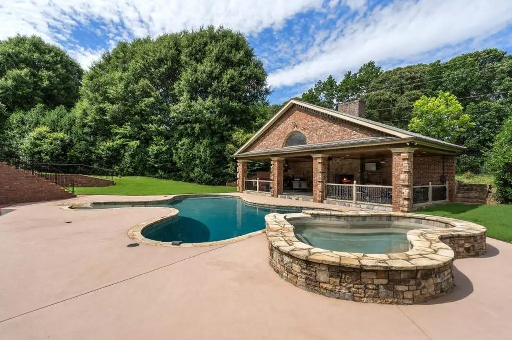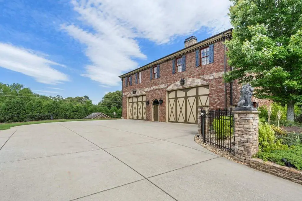 A magnificent estate where timeless architecture meets exceptional craftsmanship. Set on lush, rolling acres, this brick and stone masterpiece offers both grand entertaining spaces and serene outdoor retreats. A courtyard-style entry with a central fountain and dual staircases sets a dramatic tone. Inside, a soaring foyer with mirrored staircases leads to a formal living room featuring a stone fireplace and built-in bookcases, with direct access to a tranquil screened-in porch. The formal dining room impresses with coffered ceilings and intricate molding, ideal for elegant dinners. A hidden prep kitchen with double ovens, ice maker, and fridge adds convenience. The chef's kitchen boasts an oversized stone island with prep sink, 8-burner cooktop, double ovens, and wine storage, flowing into a sunny breakfast room and informal living area with a cozy fireplace.The main-level primary suite is a spacious, private retreat with a fireplace, morning bar, sitting area, and oversized windows. The spa-like bath features double vanities, a soaking tub, and a luxurious wraparound shower. Upstairs are four guest bedrooms with en-suite baths, connected by a dramatic open bridge hallway. A large storage closet and half bath add function. A stunning library-style study, adorned with rich wood paneling and custom murals, offers a refined escape. The terrace level is perfect for entertaining, with exposed beams, a cozy living room with fireplace, full bar and kitchenette, and lounge area with outdoor access. A half bath with mahogany paneling, large game room, and custom Georgia Bulldogs-themed home theater enhance the experience. A spacious gym and second half bath complete the level. Outside, a resort-style pool and hot tub create the ultimate retreat. The cabana features two grills, a microwave, counter space, and a fireplace. A koi pond adds tranquility. The carriage house sits above an oversized garage with space for large vehicles or a car collection. It offers a full kitchen, living and dining areas, and two private bedrooms with full baths-ideal for guests. Surrounding the home, manicured gardens and mature trees enhance the setting. A charming barn adds versatility, perfect for storage or a workshop, blending seamlessly into the estate's classic aesthetic.