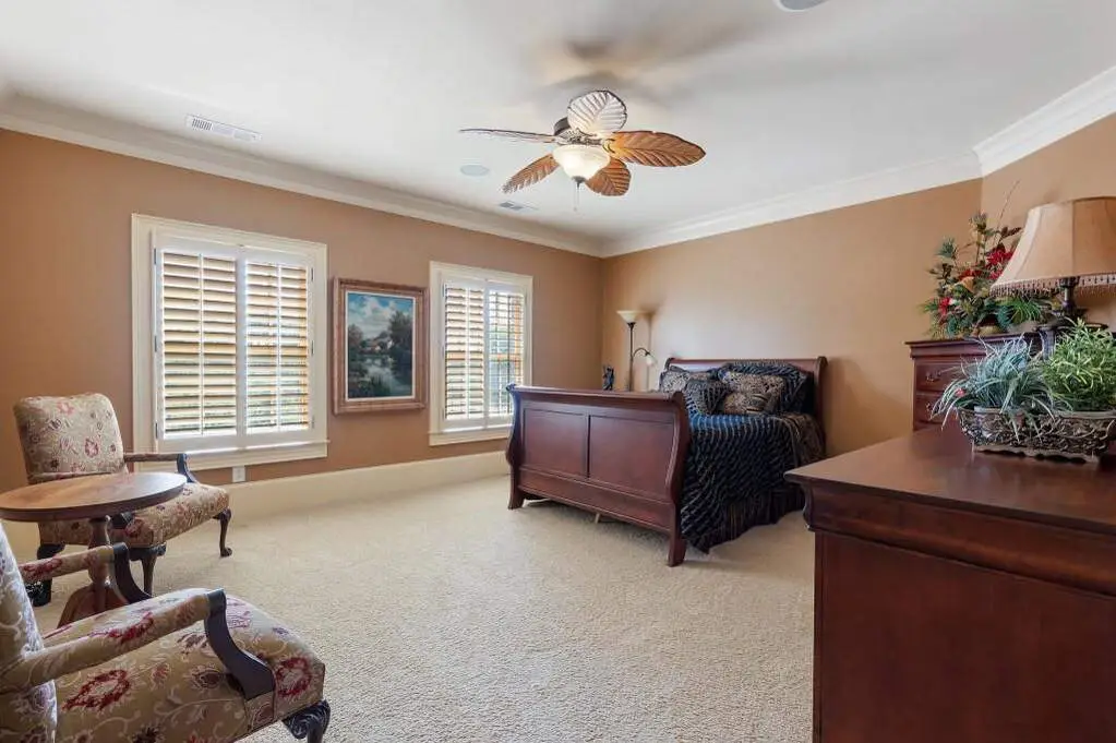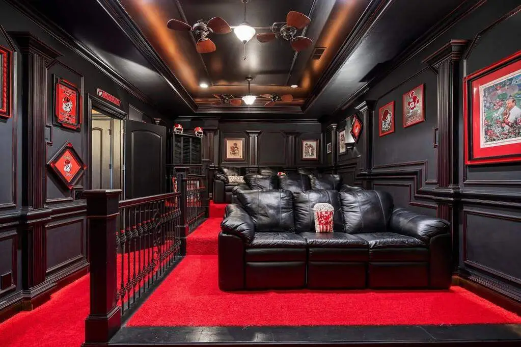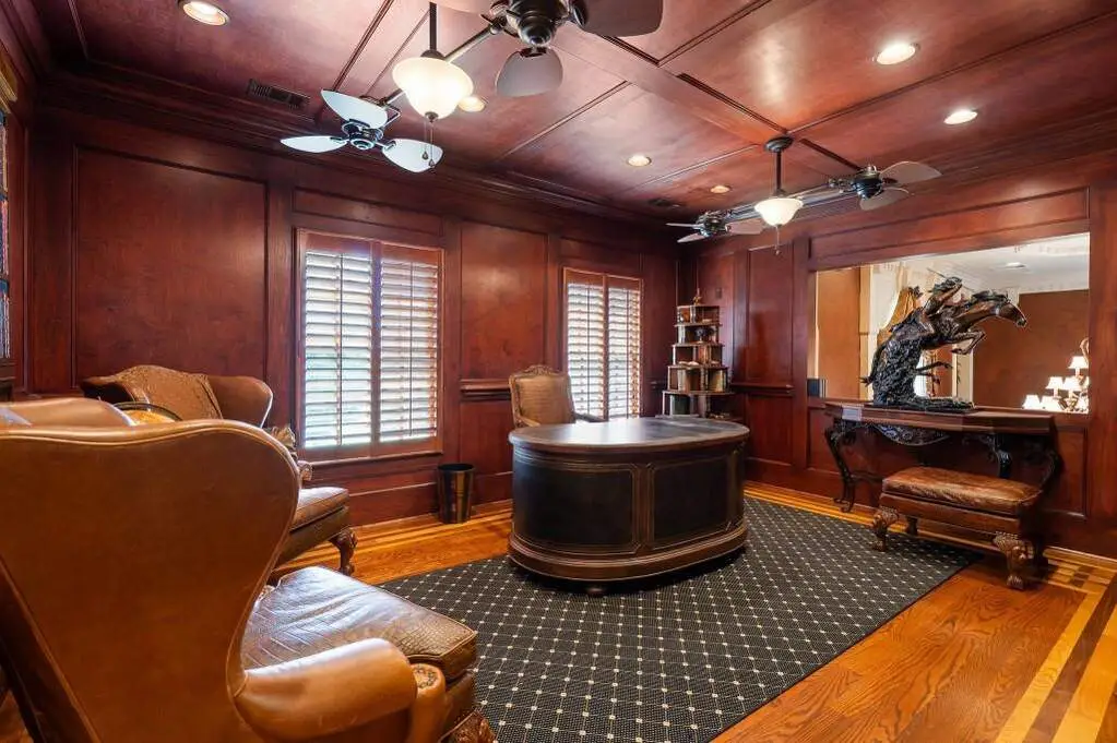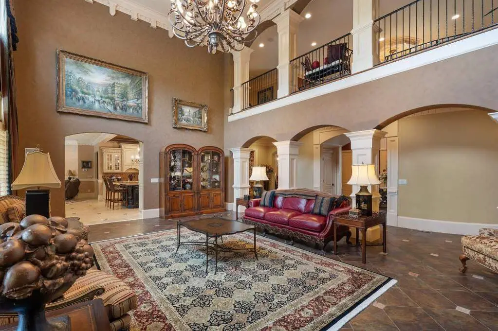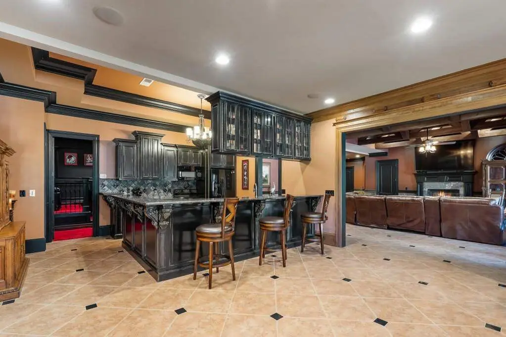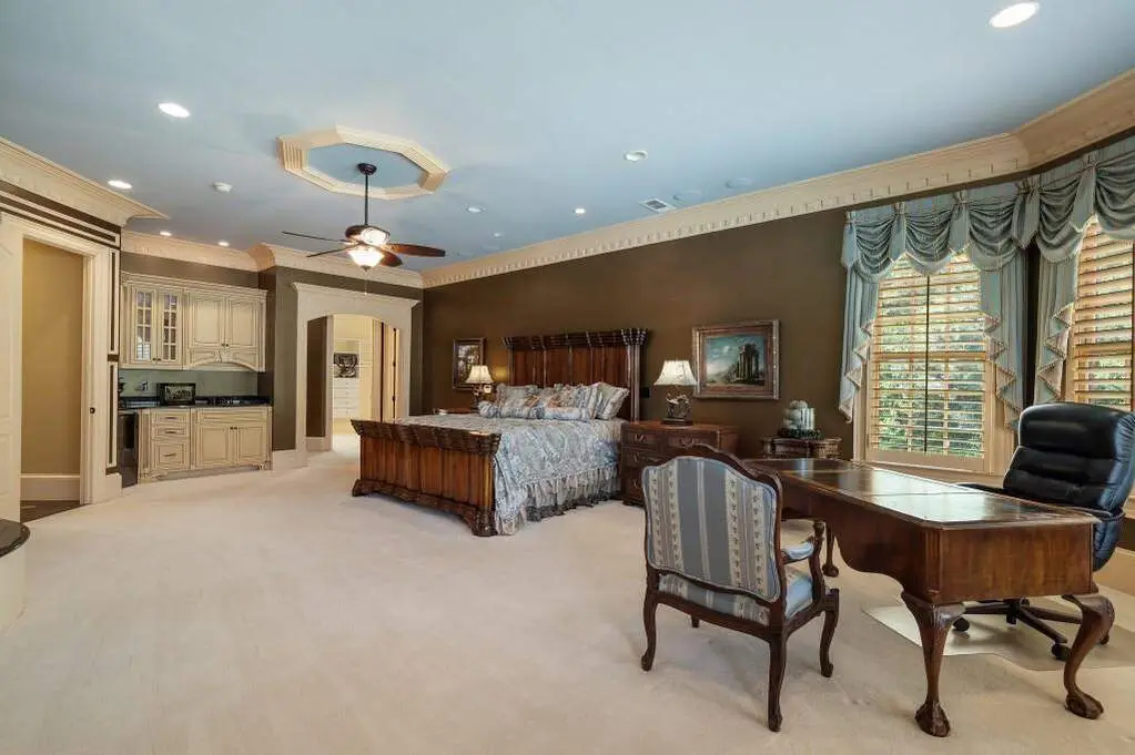 A magnificent estate where timeless architecture meets exceptional craftsmanship. Set on lush, rolling acres, this brick and stone masterpiece offers both grand entertaining spaces and serene outdoor retreats. A courtyard-style entry with a central fountain and dual staircases sets a dramatic tone. Inside, a soaring foyer with mirrored staircases leads to a formal living room featuring a stone fireplace and built-in bookcases, with direct access to a tranquil screened-in porch. The formal dining room impresses with coffered ceilings and intricate molding, ideal for elegant dinners. A hidden prep kitchen with double ovens, ice maker, and fridge adds convenience. The chef's kitchen boasts an oversized stone island with prep sink, 8-burner cooktop, double ovens, and wine storage, flowing into a sunny breakfast room and informal living area with a cozy fireplace.The main-level primary suite is a spacious, private retreat with a fireplace, morning bar, sitting area, and oversized windows. The spa-like bath features double vanities, a soaking tub, and a luxurious wraparound shower. Upstairs are four guest bedrooms with en-suite baths, connected by a dramatic open bridge hallway. A large storage closet and half bath add function. A stunning library-style study, adorned with rich wood paneling and custom murals, offers a refined escape. The terrace level is perfect for entertaining, with exposed beams, a cozy living room with fireplace, full bar and kitchenette, and lounge area with outdoor access. A half bath with mahogany paneling, large game room, and custom Georgia Bulldogs-themed home theater enhance the experience. A spacious gym and second half bath complete the level. Outside, a resort-style pool and hot tub create the ultimate retreat. The cabana features two grills, a microwave, counter space, and a fireplace. A koi pond adds tranquility. The carriage house sits above an oversized garage with space for large vehicles or a car collection. It offers a full kitchen, living and dining areas, and two private bedrooms with full baths-ideal for guests. Surrounding the home, manicured gardens and mature trees enhance the setting. A charming barn adds versatility, perfect for storage or a workshop, blending seamlessly into the estate's classic aesthetic.