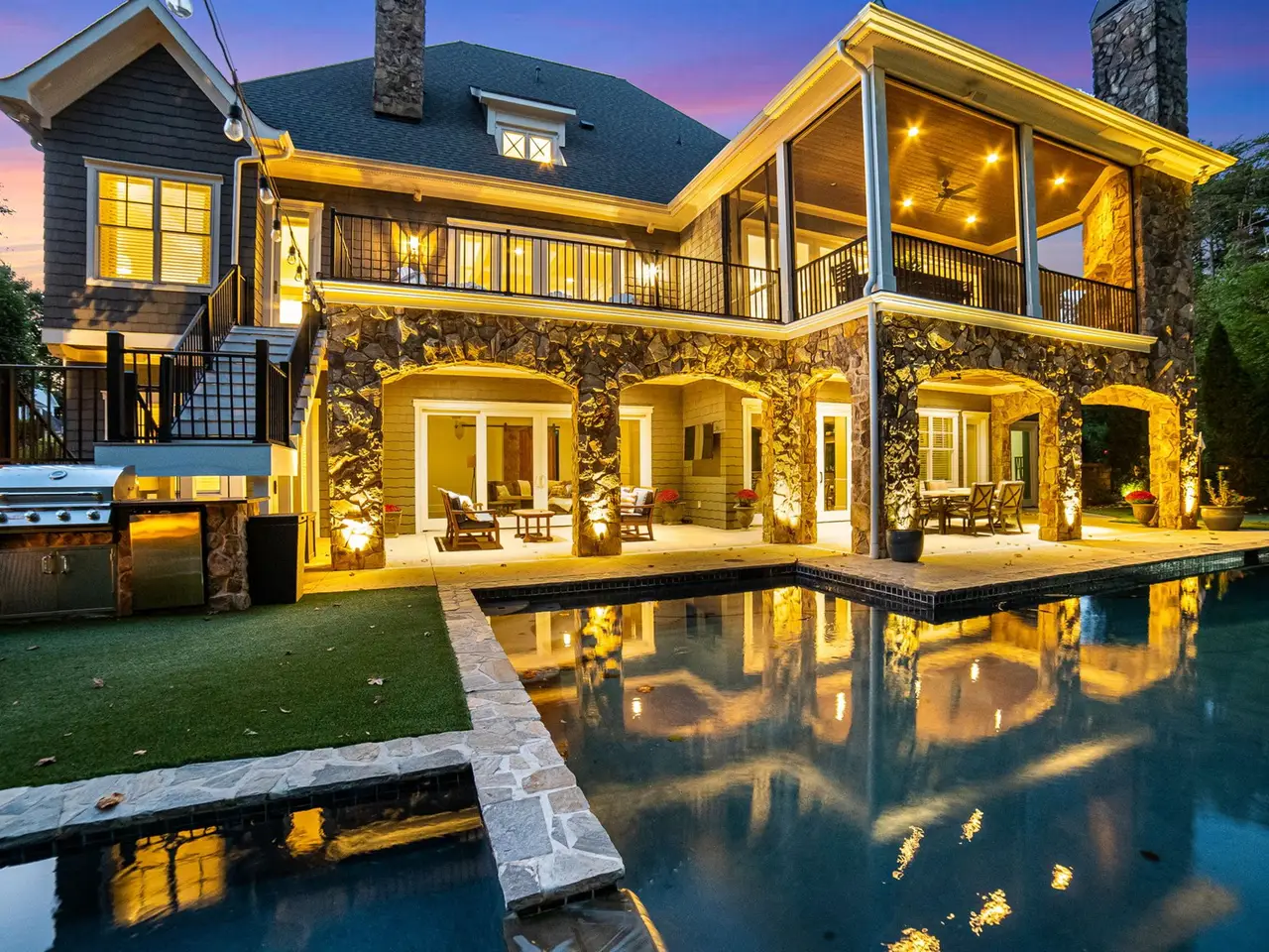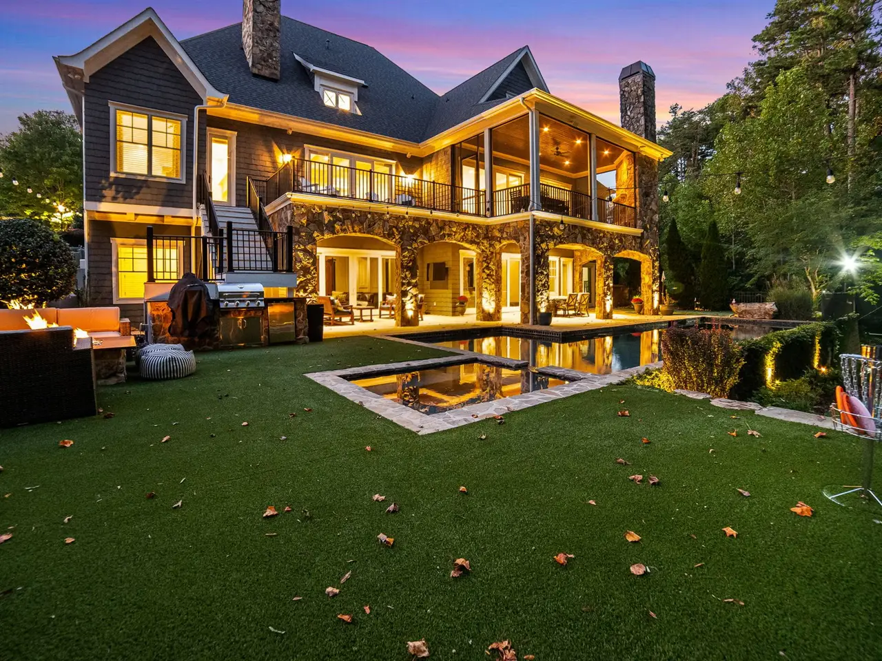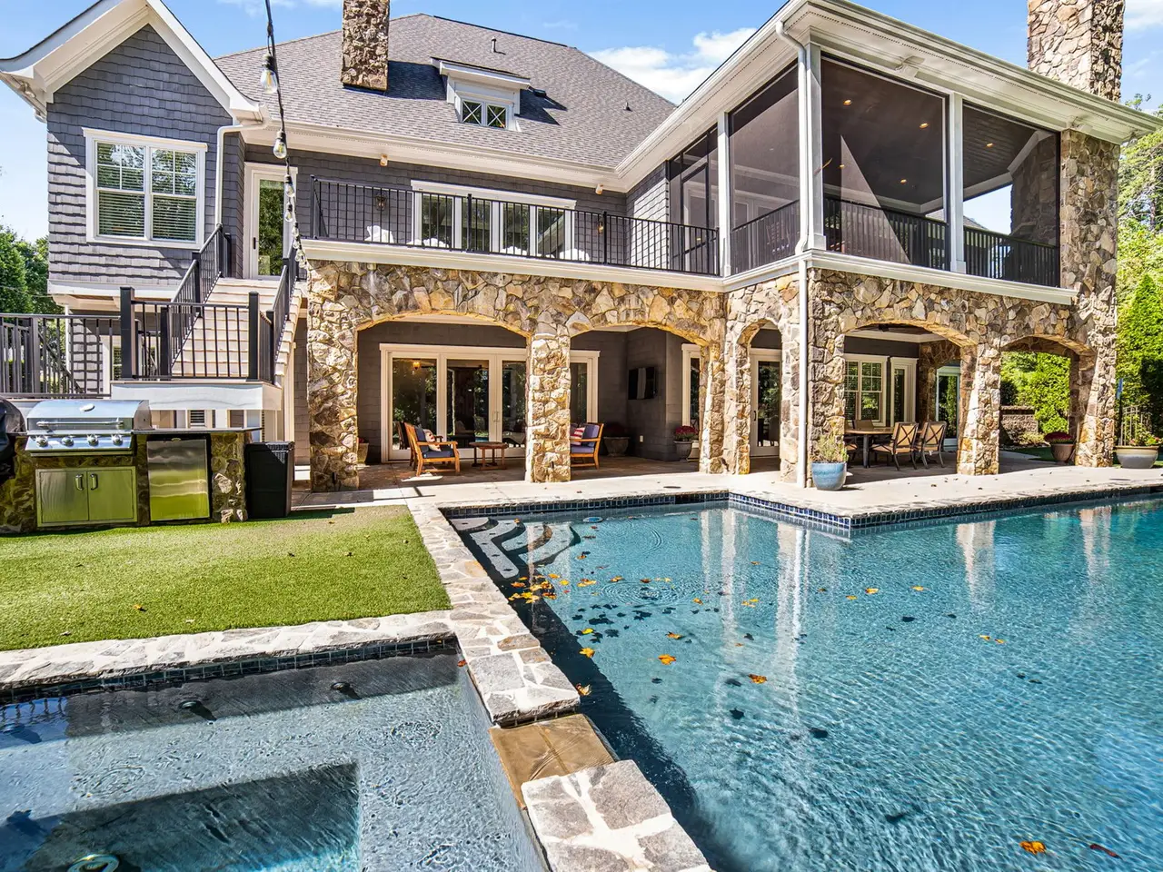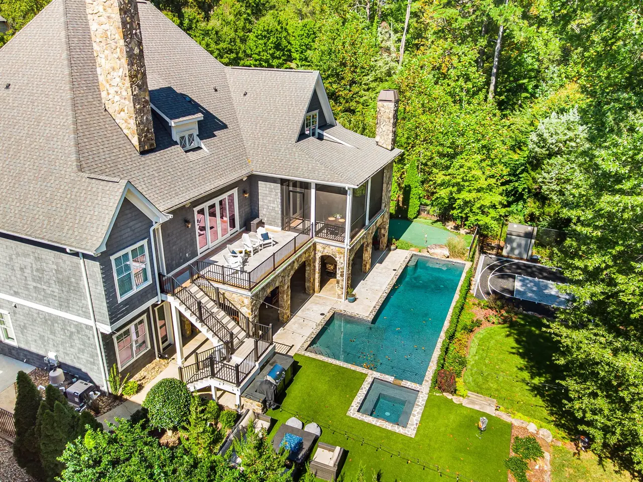 Resort-Style Luxury Estate Backing to Protected Greenspace Discover a rare blend of timeless craftsmanship and modern luxury in this cedar shake and stone estate. Designed for both everyday living and unforgettable entertaining, the home offers a true resort lifestyle. Outdoors, enjoy multiple living spaces screened porch, balcony, patios, and a spectacular pool with diving rock, spa hot tub, and dedicated pool bath. Entertain with a full outdoor kitchen, gas-start fireplace, fire pit, half-court basketball, turf putting green, and grassy play yard.Inside, soaring ceilings, elegant moldings, hardwoods, and smart-home features set the stage. The chef's kitchen shines with dual islands, Thermador appliances, walk-in pantry, and breakfast nook. The coffered-ceiling living room, keeping room, and screened porch make gatherings seamless.The main-level owner's suite is a retreat with vaulted ceilings, fireplace, porch access, and spa-inspired bath featuring heated marble floors, freestanding tub, oversized shower, and custom closets. Upstairs offers a study loft, three bedrooms with ensuite/shared baths, and unique bonus spaces.The finished lower level boasts a wine cellar, custom bar, 120-inch home theater, office, exercise room, and guest suite with pool access.This extraordinary estate delivers luxury, recreation, and nature right at home.