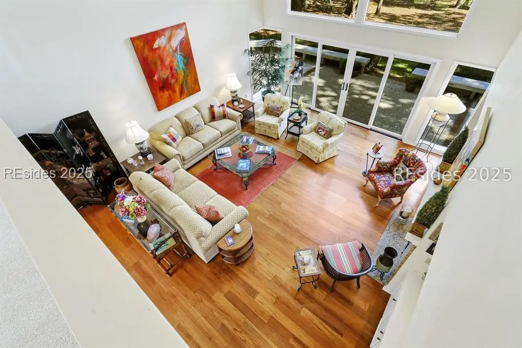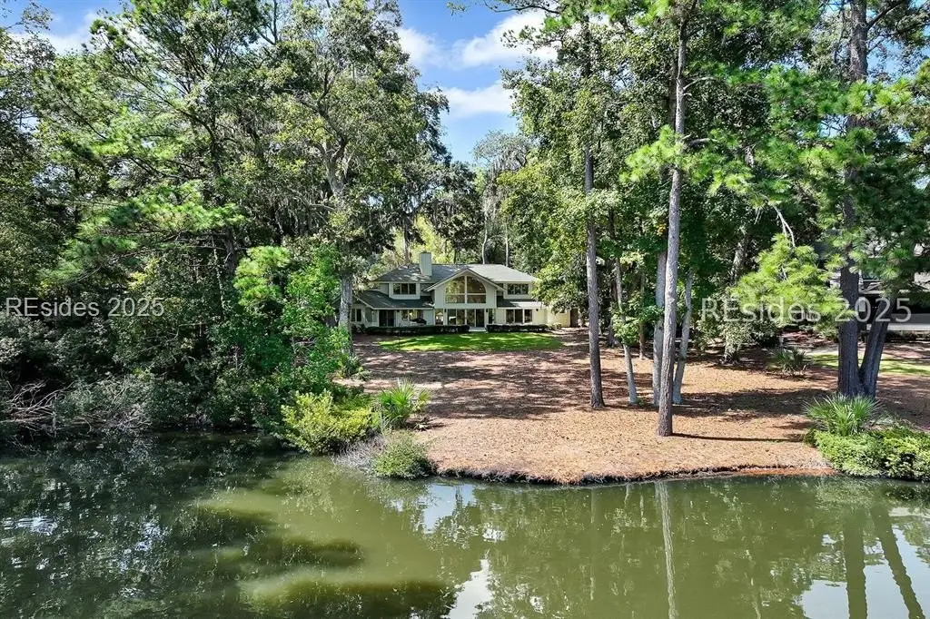 Rare opportunity to experience daily breathtaking panoramic views across much desired Blue Heron Sanctuary in amenity rich, private Moss Creek! Interior features in this impeccably maintained residence include soaring, vaulted/tray ceilings, floor to ceiling walls of windows to view, teak wood flooring, custom cabinetry/ built-ins/millwork, fireplace, granite & solid surface counters & designer fixtures/hardware/lighting. Very livable floor plan boasts impressive Great Rm, Island Kitchen open to Casual Dining & Carolina Rm, Dining Rm, Laundry, Powder Rm, excellent BR separation, Den/Study adjacent well-appointed primary BR suite w/updated Bath, 2 ample guest BR suites & open staircase to 2nd floor Gallery with stunning views. Exterior offers oversize, high elevation, cul de sac corner lot with nature preserve in front, golf view to side (#7 North Course), maximum privacy, rear patio (with built-in seating) spanning almost entire rear of home, side load 2 car garage, majestic live oaks, new roof, mature lawn/plantings & large back yard gently sloping to waters edge and arguably the finest lake view on this highly sought, birders paradise, nature preserve. All with excellent curb appeal, super quiet locale, and prime eastern exposure in rear offering stunning sunrises across lake to rookery, boardwalk/tidal marsh, and shaded late afternoons/evenings for relaxing & entertaining friends. It will be love at first sight...