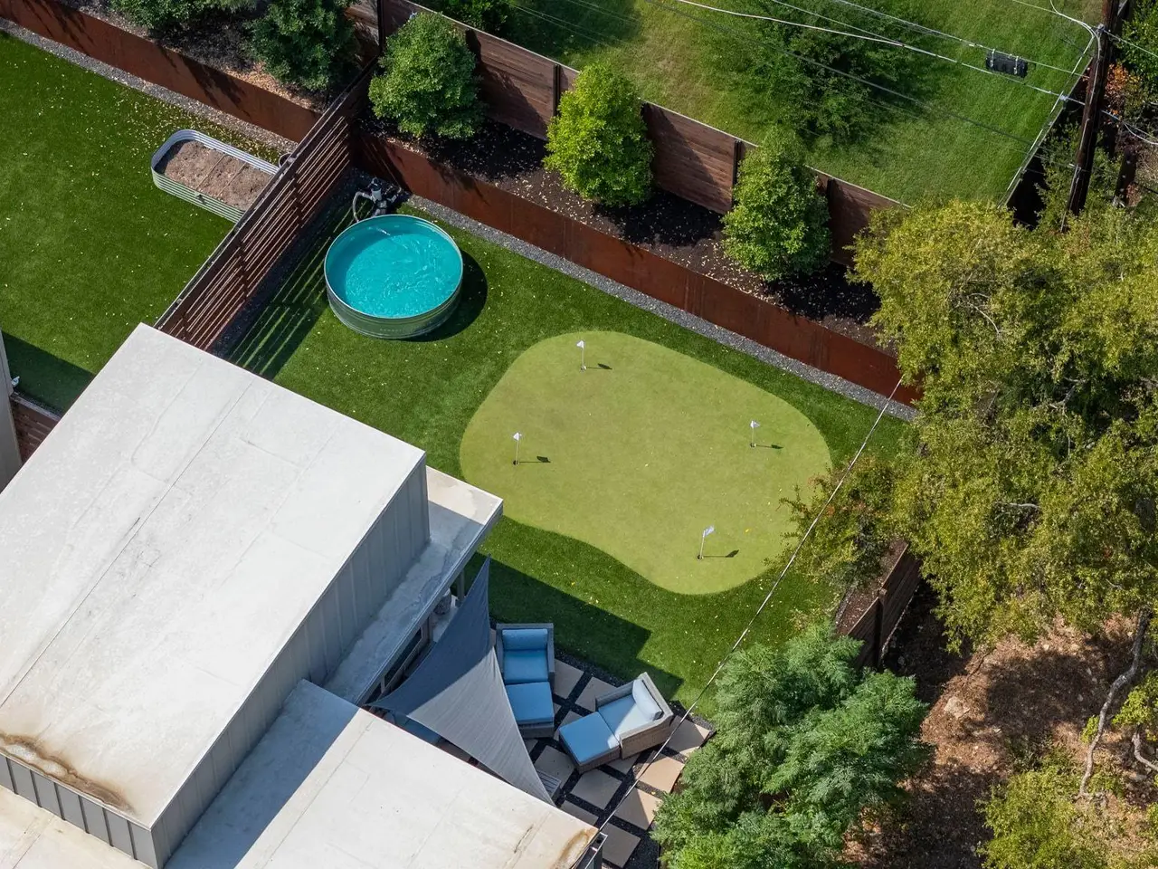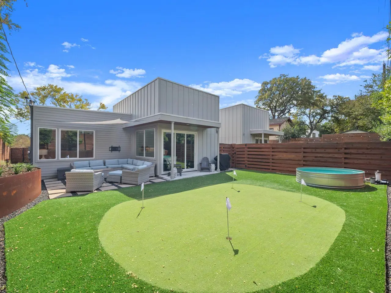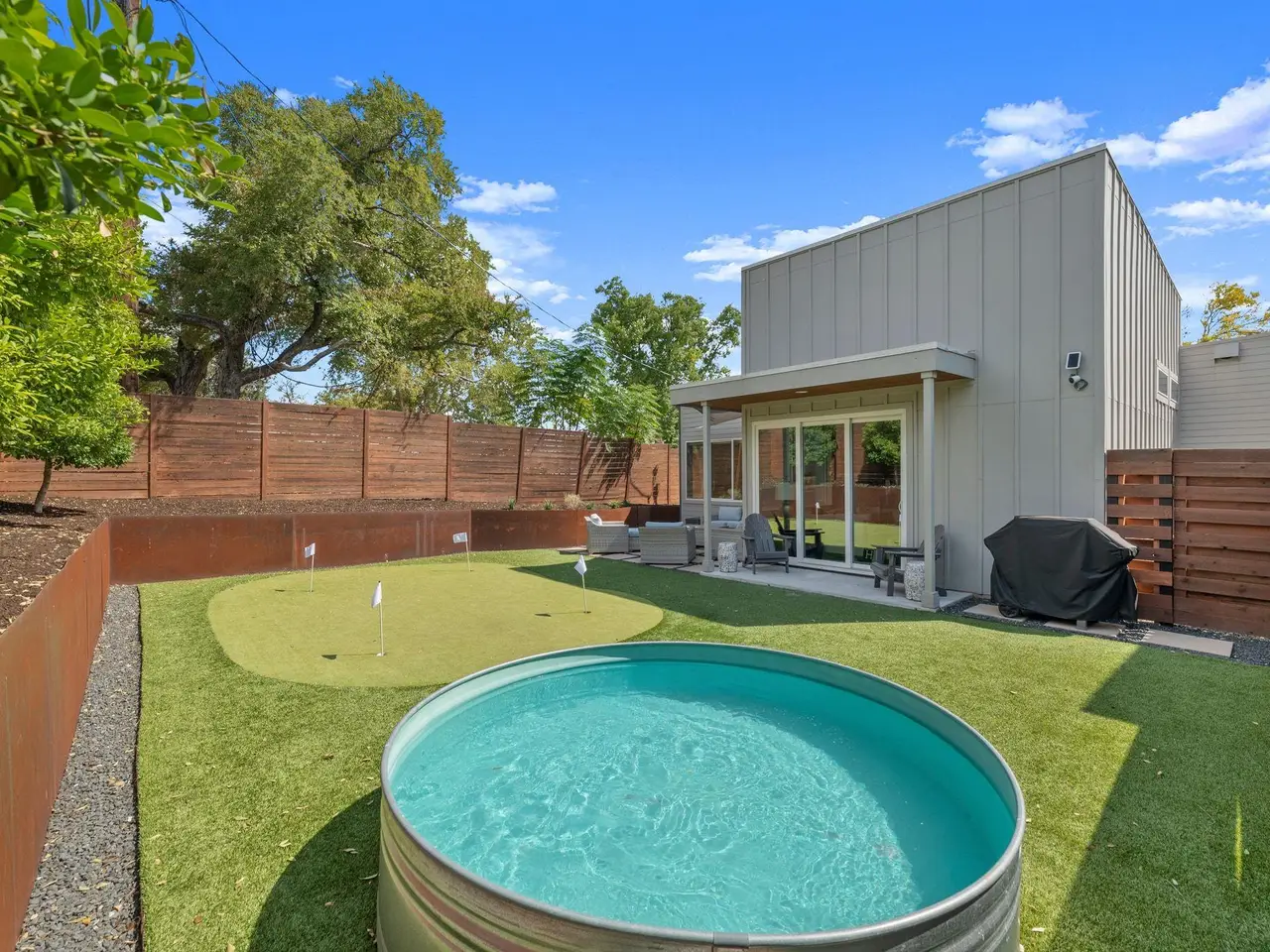 Experience modern Austin living at its finest in this gorgeous 3 bedroom, 3 bathroom residence, where elegant style meets effortless livability. Thoughtfully crafted with soaring ceilings and beautiful design, the open-concept living space feels bright, airy, and refined. Immaculate finishes and stylish fixtures give the home a fresh, contemporary aesthetic that feels both polished and inviting. The heart of the home centers around a stunning kitchen with sleek cabinetry, premium appliances, and an expansive island ideal for casual dining or entertaining. Each bedroom offers generous proportions and spa-like bathrooms with exquisite tilework. The primary suite provides a serene retreat, complete with a walk-in closet and a luxurious en suite bath. Escape to the private backyard oasis designed for relaxation and fun. Enjoy a covered porch ideal for morning coffee, a refreshing stock tank pool for warm afternoons, a personal putting green, and a cozy sitting area. Perfectly located near The Grove Signature Park, the trails along the Shoal Creek Greenbelt, and Austin's top shopping and dining options, this home delivers the best of modern design and central convenience. Tax and assessed values are estimates for illustration purposes only. All figures should be independently verified.