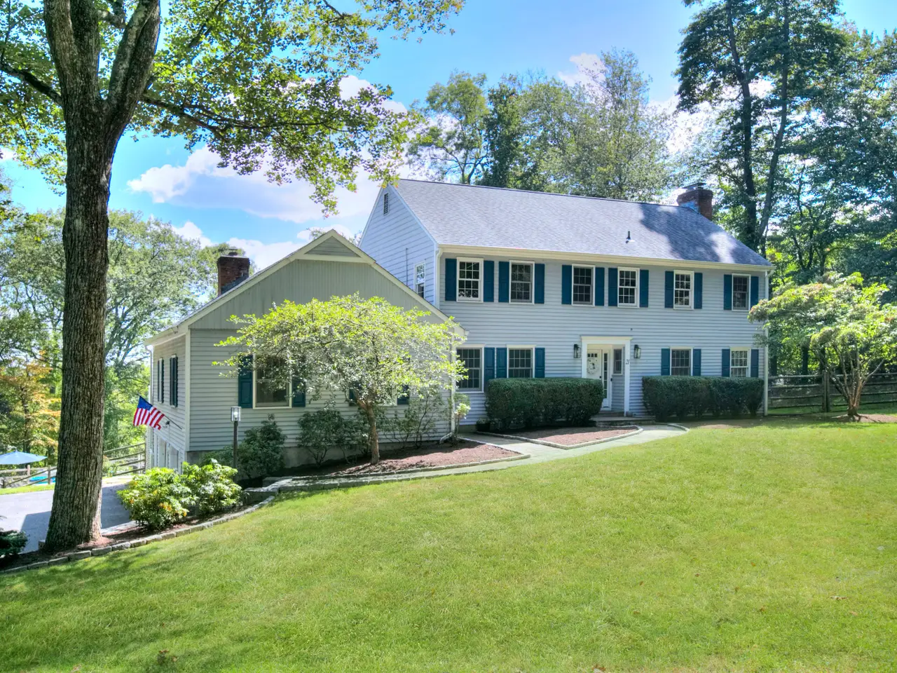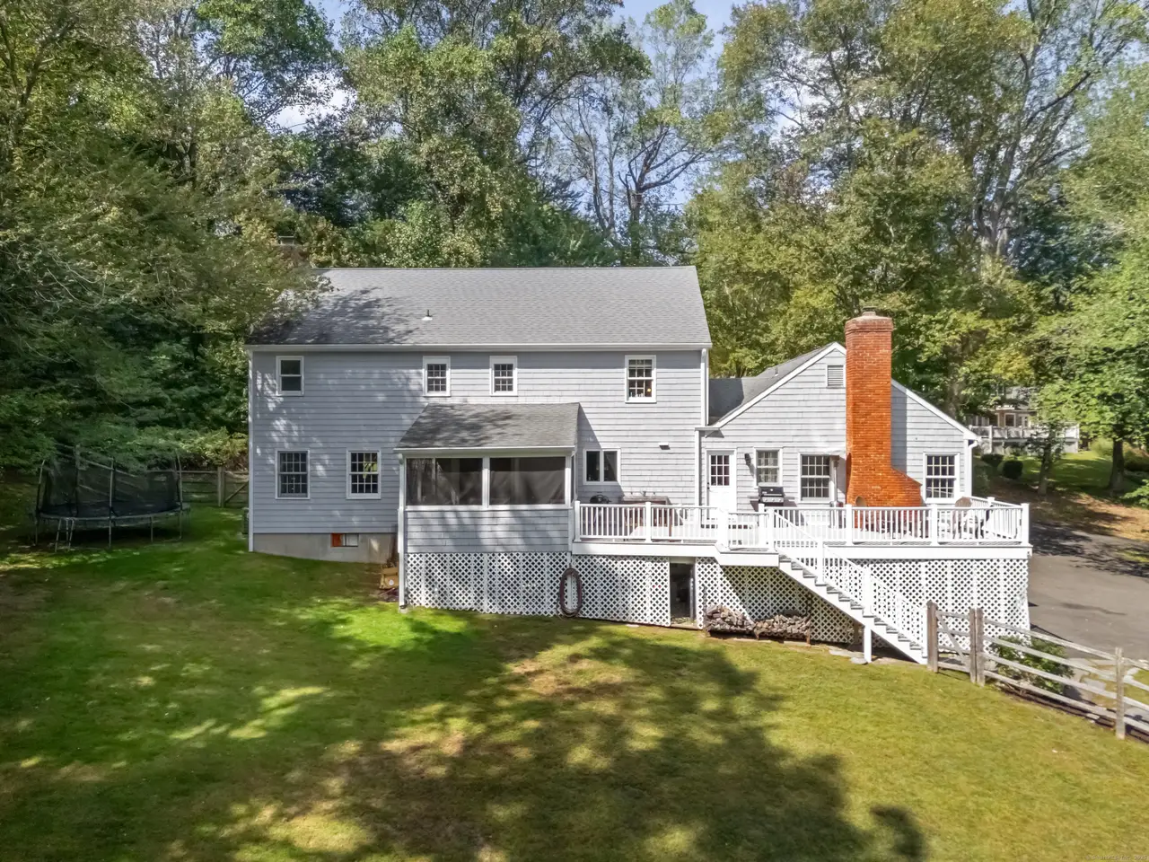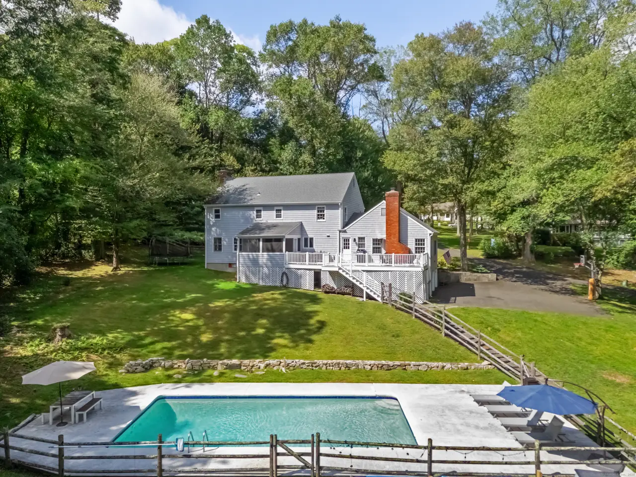 Welcome to 21 East Hill Road, a timeless New England Colonial tucked away on a quiet North Stamford cul-de-sac. Perfectly situated in a sought-after location, this home rests on 1.36 acres of parklike grounds, framed by mature greenery and highlighted by a heated pool. The setting is both peaceful and serene, offering a true retreat. Inside, spacious rooms and a functional floor plan are accented by hardwood floors and two fireplaces that add warmth and character. The eat-in kitchen is a standout, adjoining the gracious front-to-back living room on one side and a generous yet cozy family room on the other. A formal dining room adds elegance for entertaining, while casual kitchen dining flows to the screened porch and Trex deck, where sweeping views of the rear yard and pool set the stage for gatherings or quiet evenings outdoors. With four bedrooms plus a main-floor flex room/office, the home adapts seamlessly to today's lifestyle-ideal for a guest suite or work-from-home space. The primary suite features a spacious bath, while the finished walkout lower level provides abundant space for recreation, fitness, or media. All this in a prime location with convenient access to downtown Stamford, local beaches, shopping, dining, and the train station. With New York City within easy reach, the home offers the best of both worlds, elbow room to relax, yet close to everything. Set in a peaceful, versatile, and desirable neighborhood, this property delivers both everyday comfort and the refined Fairfield County lifestyle.