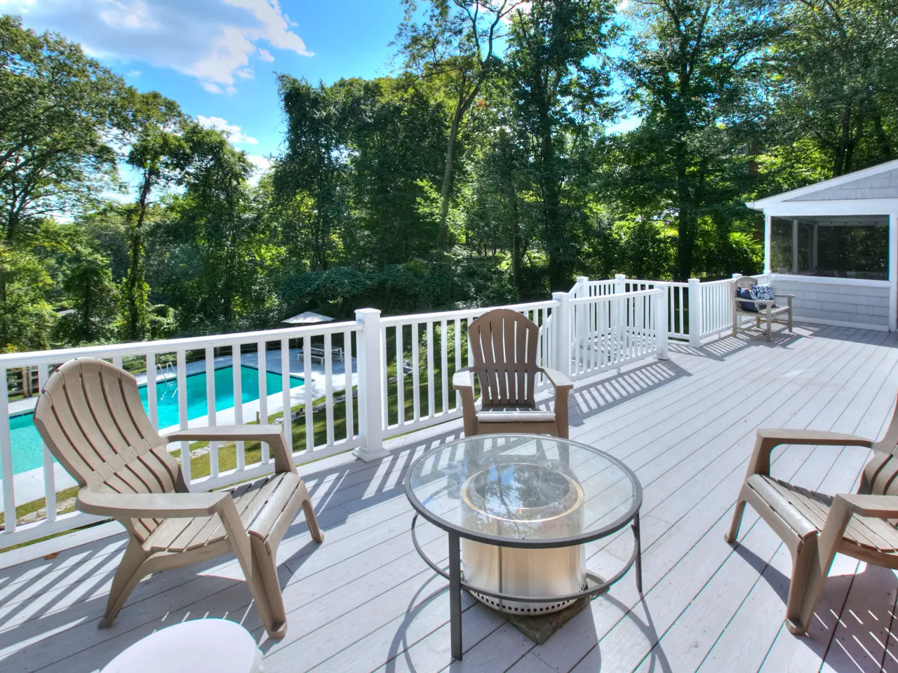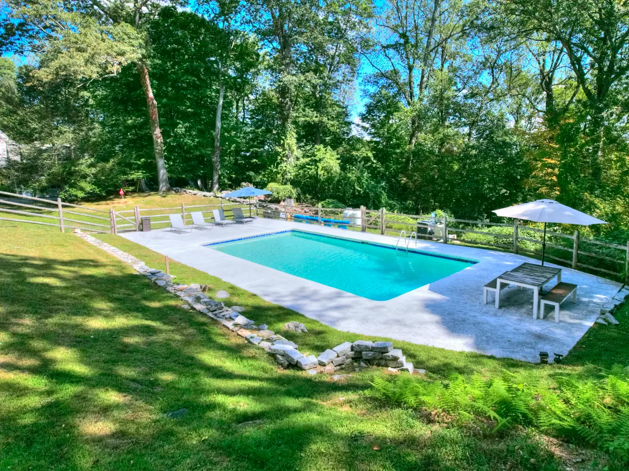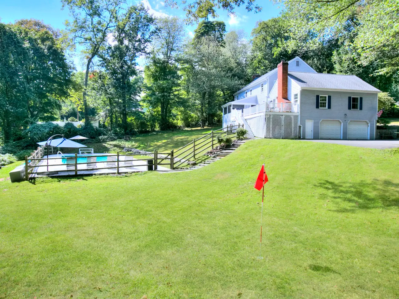 Welcome to 21 East Hill Road, a timeless New England Colonial tucked away on a quiet North Stamford cul-de-sac. Perfectly situated in a sought-after location, this home rests on 1.36 acres of parklike grounds, framed by mature greenery and highlighted by a heated pool. The setting is both peaceful and serene, offering a true retreat. Inside, spacious rooms and a functional floor plan are accented by hardwood floors and two fireplaces that add warmth and character. The eat-in kitchen is a standout, adjoining the gracious front-to-back living room on one side and a generous yet cozy family room on the other. A formal dining room adds elegance for entertaining, while casual kitchen dining flows to the screened porch and Trex deck, where sweeping views of the rear yard and pool set the stage for gatherings or quiet evenings outdoors. With four bedrooms plus a main-floor flex room/office, the home adapts seamlessly to today's lifestyle-ideal for a guest suite or work-from-home space. The primary suite features a spacious bath, while the finished walkout lower level provides abundant space for recreation, fitness, or media. All this in a prime location with convenient access to downtown Stamford, local beaches, shopping, dining, and the train station. With New York City within easy reach, the home offers the best of both worlds, elbow room to relax, yet close to everything. Set in a peaceful, versatile, and desirable neighborhood, this property delivers both everyday comfort and the refined Fairfield County lifestyle.