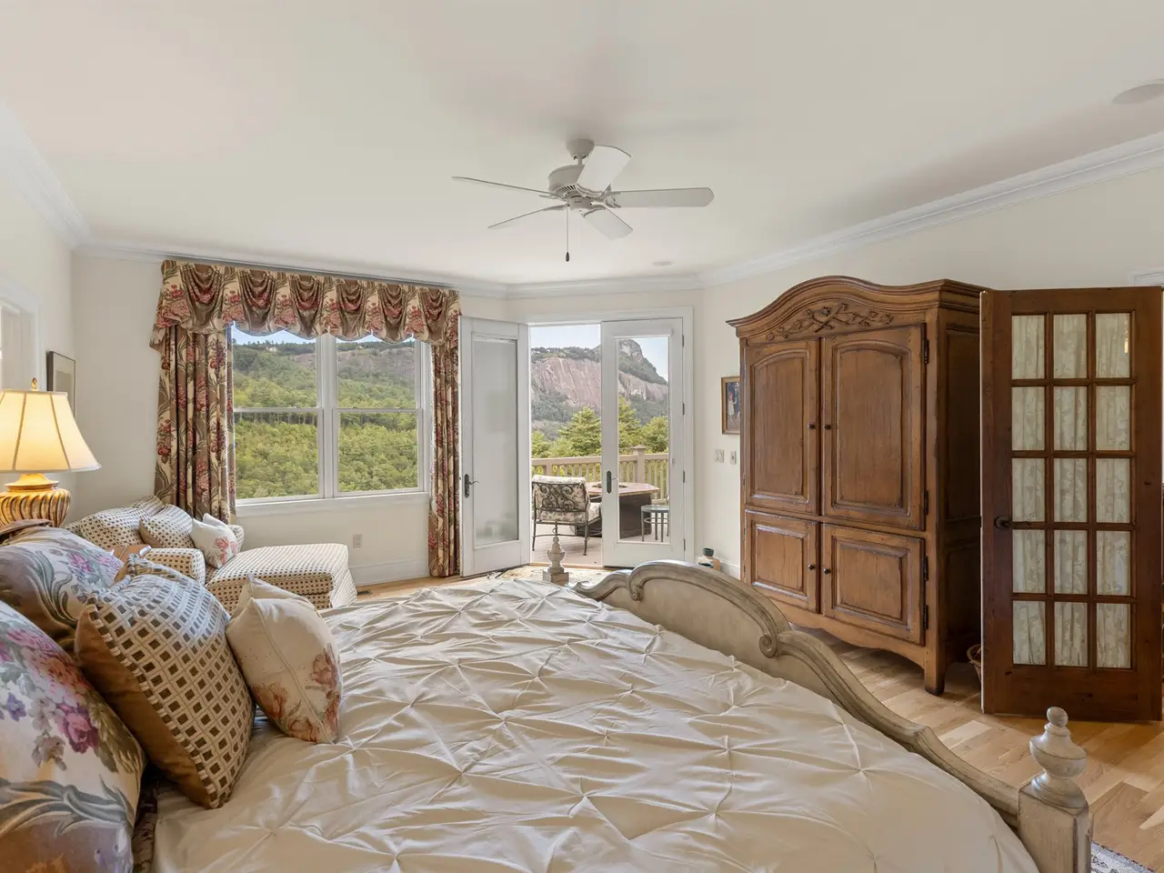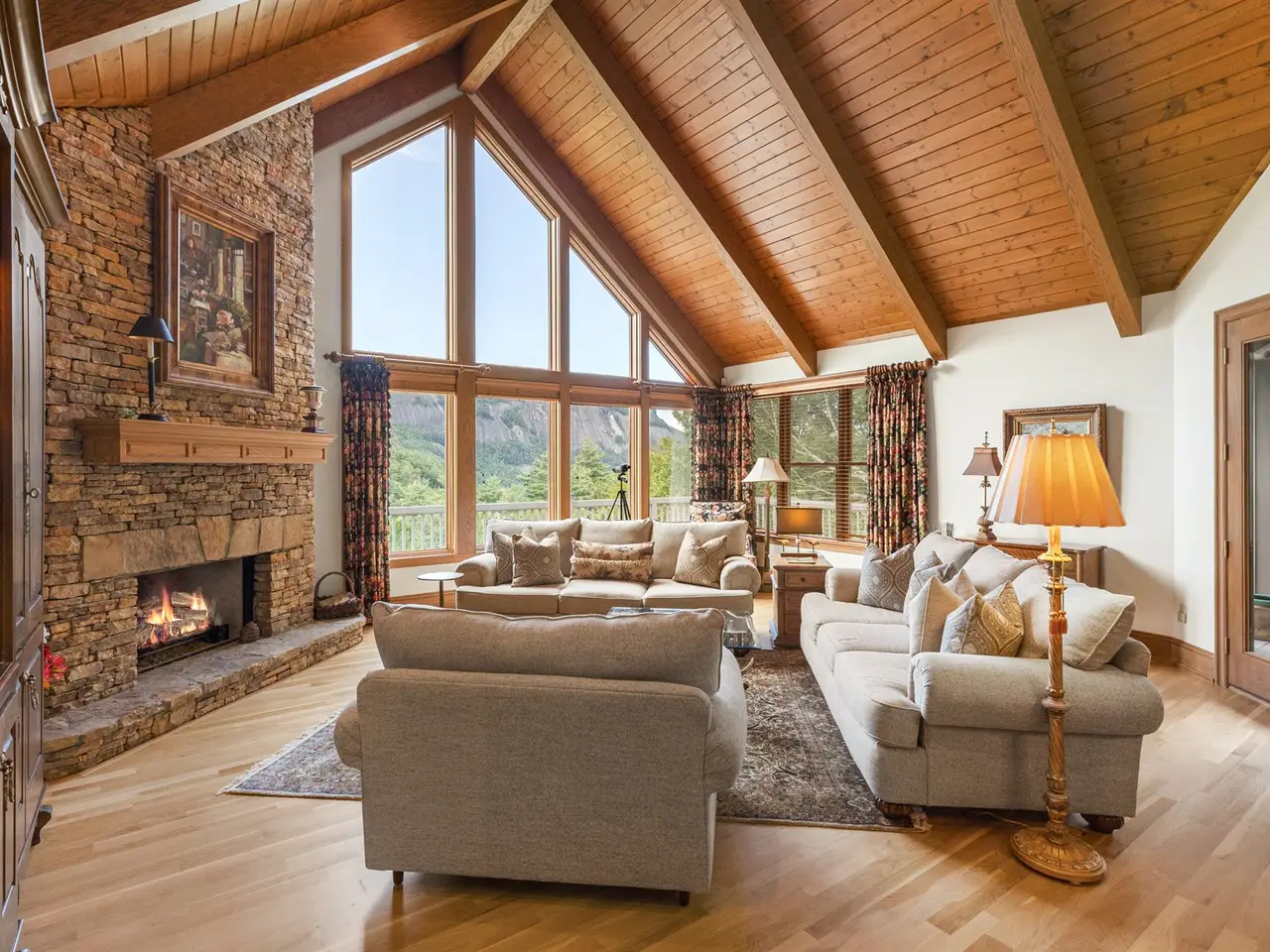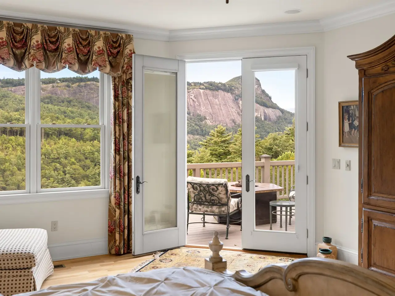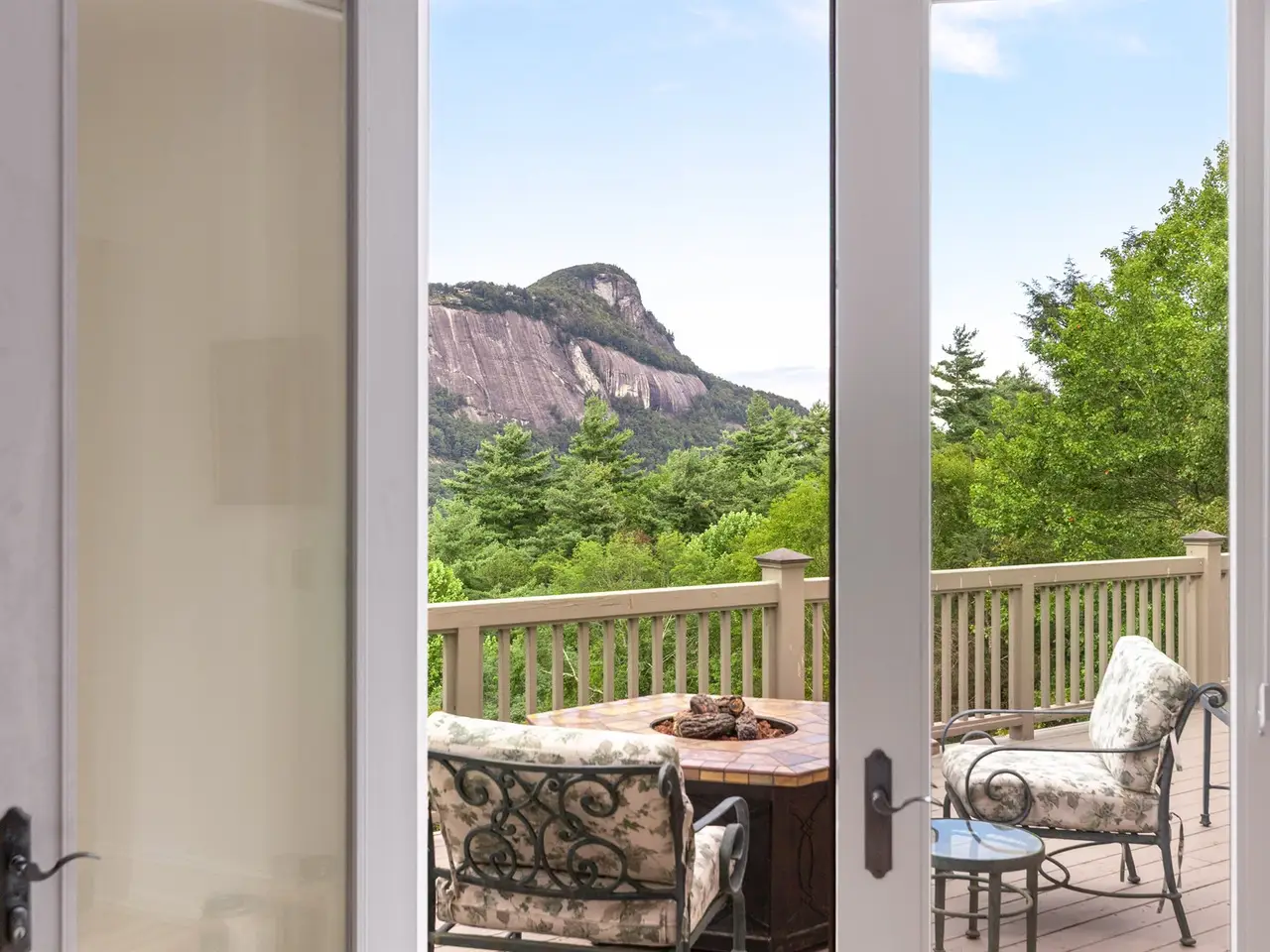 This is the panoramic BIG VIEW! Prepare to be captivated by sweeping, unobstructed views of iconic Whiteside Mountain from this stunning Highlands Falls Falcon Ridge residence, a home so remarkable it has been featured twice in Architectural Digest. Designed with generous proportions and effortless flow, the home offers main-level living with the primary suite conveniently located on the entry level. Architectural details abound, highlighted by custom wormy chestnut and oak features throughout, including an impressive 3? solid wormy chestnut entry door. The primary suite commands breathtaking mountain views and sunrises and boasts a lavish Italian marble bath with soaking tub, oversized shower, dual lighted mirrors, hidden lighted vanity, Kohler fixtures, custom walk-in closets, and a private wet bar with sink and mini-fridge. The open-concept living, dining, and kitchen spaces flow seamlessly onto a screened porch with a fully outfitted grilling station featuring a Blaze grill?an entertainer's dream with Whiteside Mountain as the backdrop. The main level also conveniently includes a guest bedroom, full bath, office/den with custom glass paned wormy chestnut and oak door, and a full laundry room with sink. The lower level provides for guest privacy with a second living area with fireplace, private deck, two spacious en-suite bedrooms, powder room, bonus/flex room with gym/playroom potential, and a secondary laundry area. Recent upgrades are extensive, including a remodeled kitchen, refinished hardwood floors, 27 new windows, new roof, gutters with guards, encapsulated crawlspace, repaved driveway with focal pavers, updated HVAC systems, new water heaters with recirculation pump, blown-in attic insulation, new gas logs in main level fireplace, and view clearing to fully showcase dramatic views of Whiteside Mountain, Wildcat Ridge, and Cullasaja Club beyond. A drainage system beneath the upper deck ensures protection for the lower-level outdoor living area. Peace of mind comes with a 500-gallon fresh water reserve tank and a whole-house generator. A two-car garage with workshop, along with a welcoming exterior accented by a serene water feature, completes this mountain sanctuary. This Highlands Falls home is more than a residence?it is a retreat of timeless architecture, meticulous updates, and awe-inspiring views. Membership to Highlands Falls CC is not mandatory but the amenities are tremendous and the club is vibrant.
