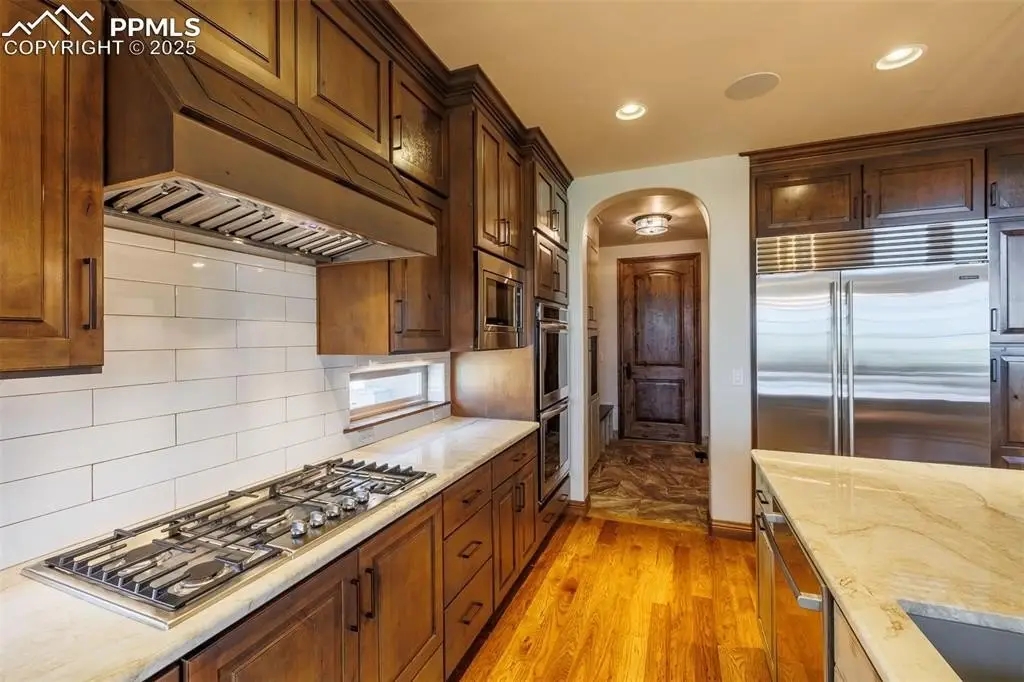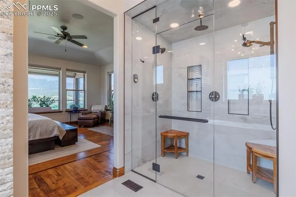 Unobstructed, straight-on view of Pikes Peak and Garden of the Gods!!! This gorgeous custom-built ranch home on the ridge of the exclusive gated-community of Cathedral Ridge at Garden of the Gods is a show stopper! Main level living offers a Great Room with gas fireplace, laundry room, 1/2 bath, Gourmet kitchen with Taj Mahal quartzite countertops, counter-to-ceiling cabinetry, expansive island with seating, stainless steel appliances and under cabinet lighting. Primary Suite with generous walk-in closet, double-sided gas fireplace, and ensuite spa bath with heated flooring, zero-entry steam shower, and soaking tub. Finished basement highlights a Family Room with gas fireplace and built-ins, two bedrooms that share a full bath, and a storage room. Back deck oasis will blow you away showcasing three separate areas (dining area, cozy fire pit, and conversation sitting area) for outdoor entertaining right on the edge of the Mesa! Lower covered patio w/ sunken hot tub. Three-car attached garage with Tesla EV charging station and epoxy floors. Home amenities include central air, solar panels, lightning mitigation system, Class IV hail resistant tile roof, emergency generator, surge and EMP protector, safe room, Rolladen hurricane shutters, extra wind protection, foam insulation construction, radon mitigation system, Crestron home automation system, two water heaters, reinforced stairwell walls, exterior holiday Jellyfish lighting, humidifier, and Mortise locks on front door and garage. HOA dues include gated security, snow removal on private streets and trash removal. Walking distance to the Garden of the Gods Club and Resort, which offers numerous amenities including spa, gym, swimming pools, hot tubs, pickleball and tennis courts, and fine dining, with club membership. Plentiful hiking and biking trails close by. Excellent location only minutes from downtown, Manitou Springs, and Kissing Camels Golf Club. Rare opportunity to acquire a one-of-a-kind property on the rim in exclusive Cathedral Ridge!