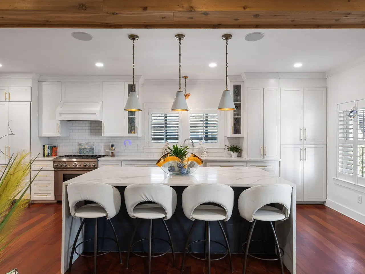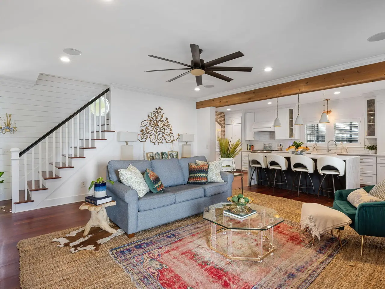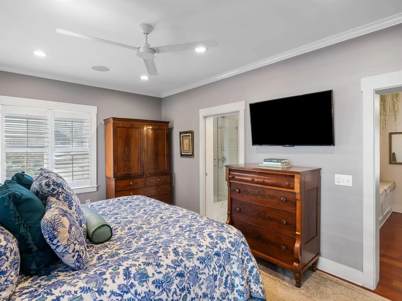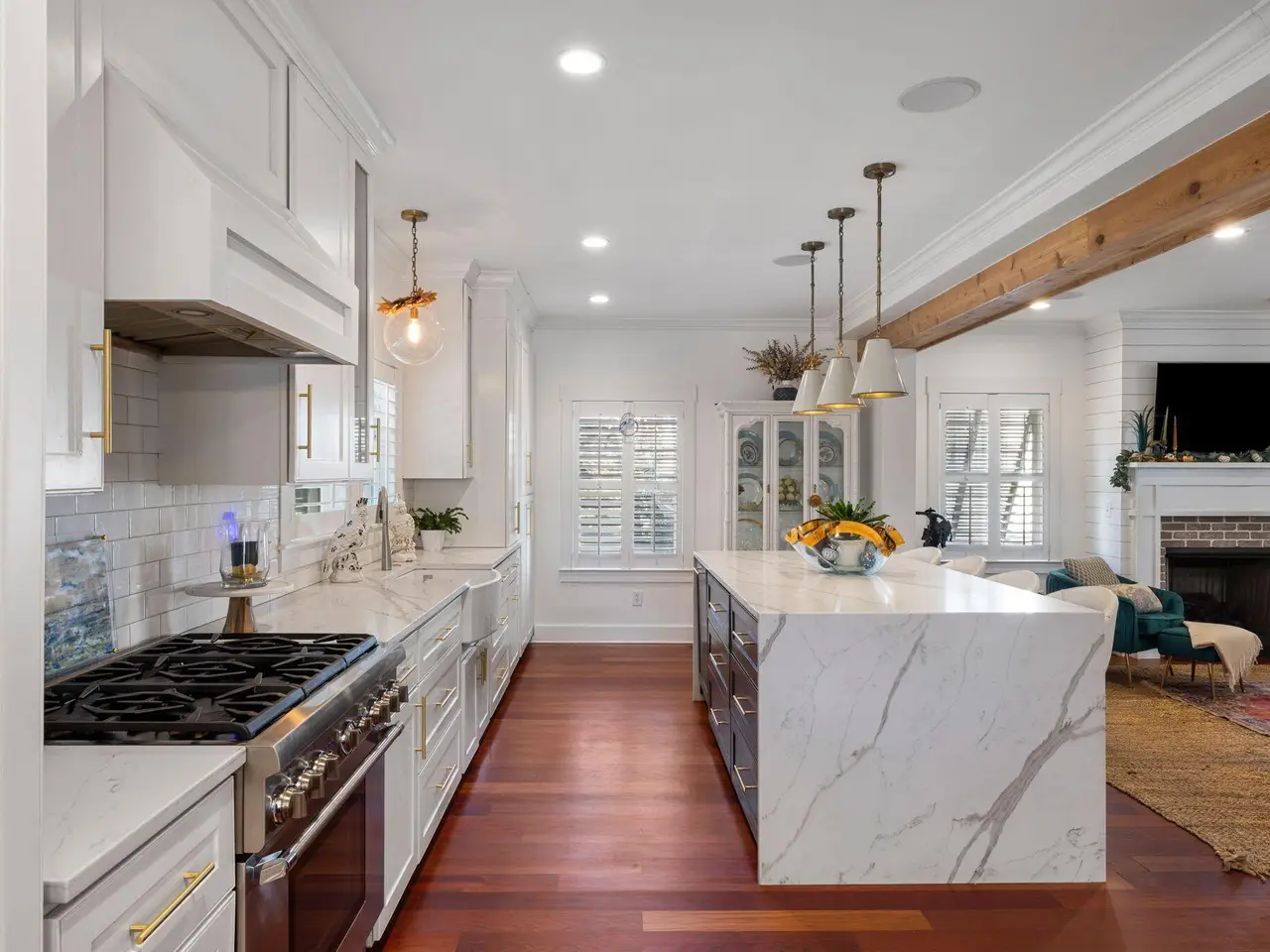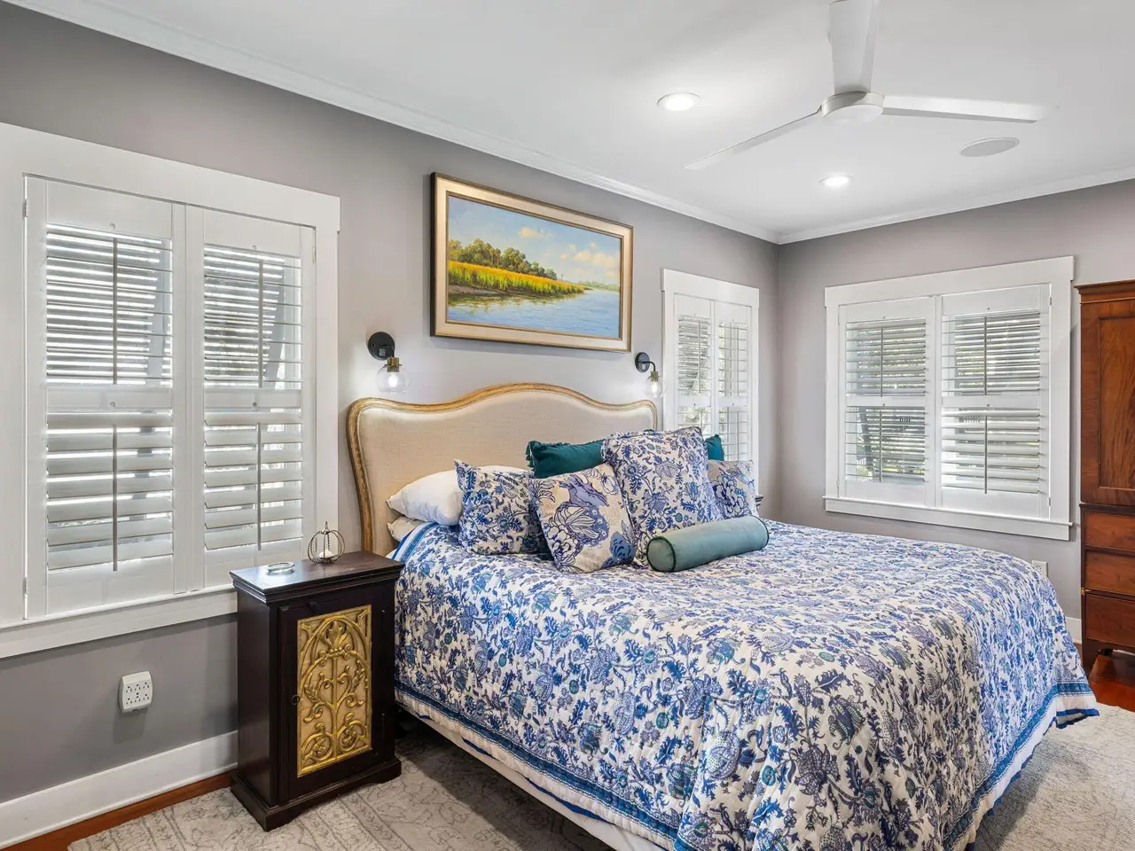 Stunning home in highly sought-after Old Village Landing! Open floor plan with high ceilings, hardwood floors and plantation shutters. Cedar beam accents the spacious kitchen -large kitchen island with bar seating for 4, custom refrigerator, gas range, undermount microwave drawer, granite countertops, farm sink and plentiful cabinetry. Stunning brick façade complements the dining room and nods to the historic charm of Charleston! Living room has a gas burning fireplace flanked with brick & shiplap and built-in cabinets - perfect space for a wet bar! Primary bedroom is downstairs with a separate foyer -great space for reading room or even an office. The built-in bench seats offer additional storage. Primary bedroom has 2 walk-in closets. Primary bathroom has shiplap walls, dual vanity, tiled shower and large soaking tub. Additionally on the first level is a powder room and a mudroom/drop spot. Upstairs you will find another living room with 3 secondary bedrooms. Each secondary bedroom has ensuite bathrooms. Huge laundry room with 2 closets for additional storage. Large double porches on both levels are perfect for outdoor entertaining! Enjoy the sunsets from the top porch and peeks of the marsh and Sullivan's Island lighthouse! Sunken cypress garage doors open to enormous garage level. Space for large cars, golf cart and tons of room for storage of beach gear, bikes and yard supplies. Fenced backyard with outdoor shower to rinse the sand off from those beach days. Centrally located in Mt. Pleasant, Old Village Landing is just five minutes from Sullivan's Island and 10 minutes to Downtown Charleston! Mt Pleasant Academy and Moultrie Middle School are walking/biking distance. Enjoy the best of Lowcountry living with walks to Pitt St Bridge and Alhambra Hall, golf cart rides to Pitt Street with local dining and shops or go grab fresh-caught seafood from Shem Creek!