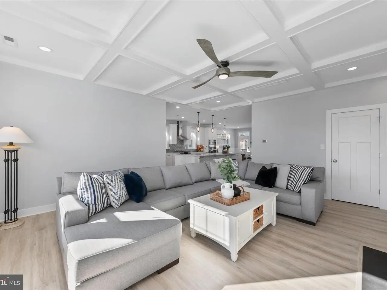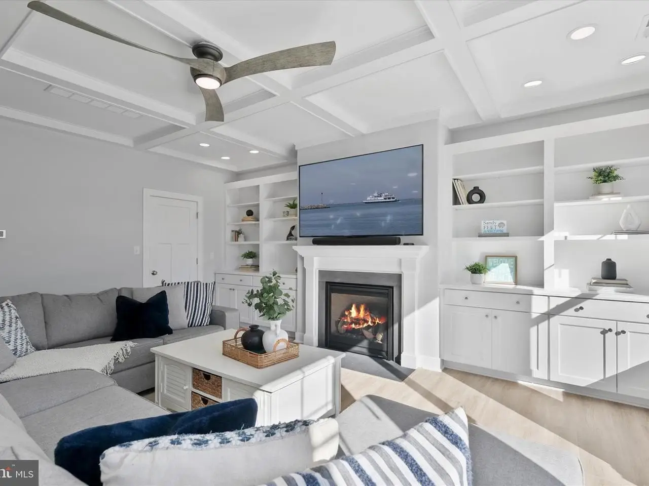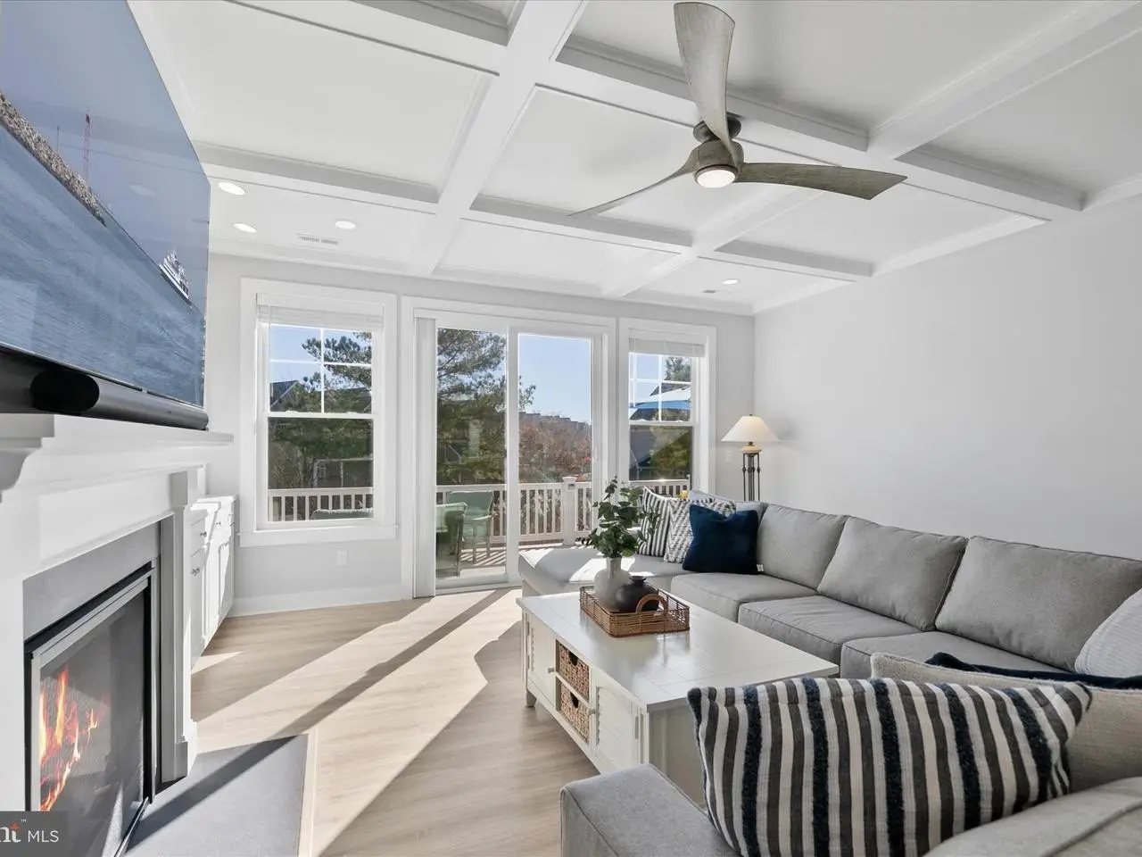 • Custom coffered ceiling living room with gas fireplace