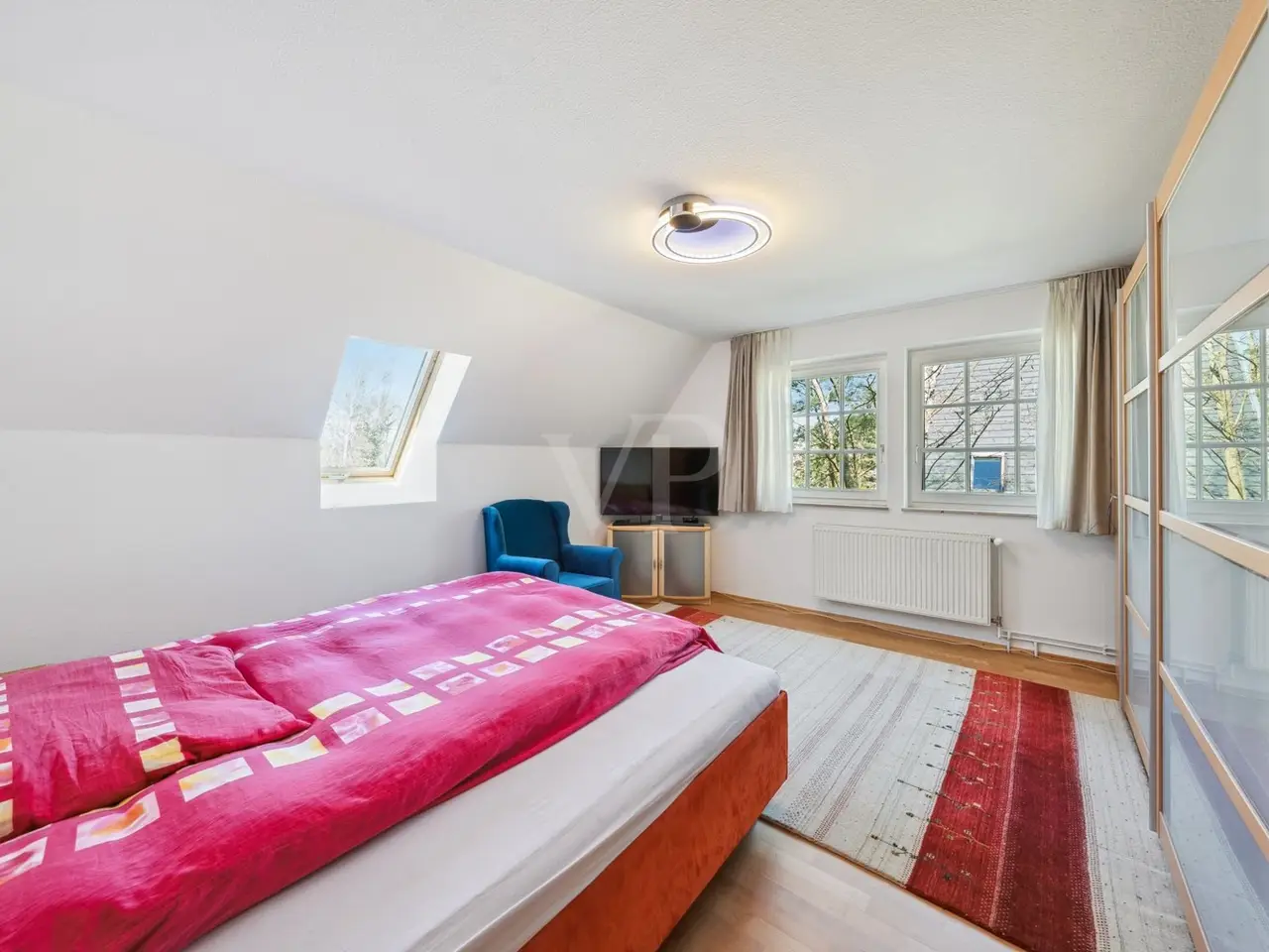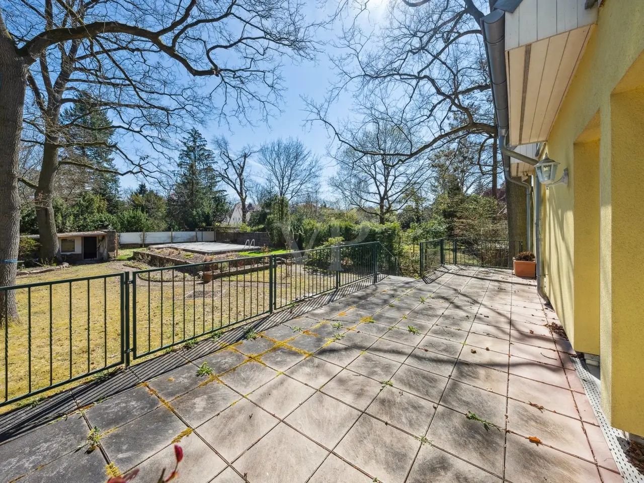 Rented since 05/ 2021 for an annual rent of € 33,600. For sale is a spacious detached house built in 1980 and located in one of the most sought-after locations in Kleinmachnow. The property offers a living space of approx. 215 m², spread over seven rooms, including six bedrooms, two bathrooms and an additional guest WC. This generous room layout provides ample space for living and working. The house was extensively modernized in 2005 and 2021. The extension of the house in 2005 resulted in a gain of approx. 62 m² of additional living space, with additional thermal insulation installed on the ground floor as well as on the upper floor and attic. A modern gas-solar hybrid heating system was installed in 2021, ensuring efficient heating. The plot covers 1,207 m² and offers a variety of possible uses. The outdoor pool was renovated in 2022 and provides refreshing hours on warm days. The spacious terrace invites you to spend relaxing hours outdoors, while the garden with its mature trees is a green oasis where you can experience nature to the full. The garden is also enclosed by a new garden fence. On the first floor, you can enjoy the view of the greenery through the many floor-to-ceiling windows, which are fitted with lockable olives and offer additional security. The rooms on the upper floor are also flooded with light and bright. The converted loft offers additional living space or room for creative uses. The house has a full basement, which creates further storage space or additional usable space. An underground garage and a parking space are also available. You can access the house directly from the underground garage, which is equipped with an electric roller shutter door. The property combines modern living comfort with generous open space. A tool shed in the garden completes the offer and provides space for garden tools and other utensils. Viewings are possible by appointment. Take the opportunity to get to know this detached house with its numerous amenities.
