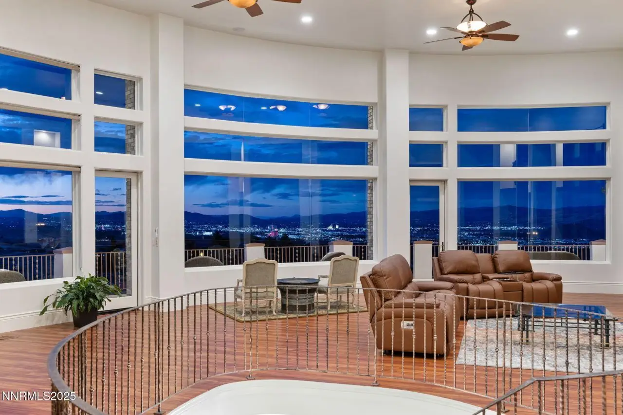 Architectural ArrowCreek Masterpiece. This move-in-ready Modern Revival Mediterranean estate, designed by renowned architect Steve Miles, is nestled on 0.73 private acres in one of the most serene, private settings within the prestigious, guard-gated ArrowCreek community. Offering 6 bedrooms, 5 baths, and 7,525 square feet of luxury living, this custom home is a rare find. From the moment you arrive, the dramatic entrance captivates with bubbling fountains emerging from massive boulders, a stone pathway leading to stately custom iron doors, and breathtaking panoramic views that unfold from every angle. Step into a gallery-style grand hallway that opens to a seamless, open-concept floor plan designed for both entertaining and everyday living. Soaring ceilings and expansive, seamless butt glass and Loewen windows capture sweeping vistas of the mountains, canyons, golf course, and the twinkling lights of Reno. Captivating nature-oriented views are further enhanced by a seasonal creek in the canyon, adding a serene element to this exceptional estate. Designed with steel beam construction, curved walls, and 5 fireplaces, this home showcases superior features and timeless design. The chef's kitchen is a showstopper, with a massive center island, Viking range, granite counters, a back-kitchen, and new KitchenAid oven, fryer, and microwave-all overlooking stunning natural surroundings. The main-level primary suite is a sanctuary of luxury, featuring a private balcony, dual-sided fireplace, spa-inspired bath with steam shower, and a generous walk-in closet. Additional main-level highlights include: An elegant library retreat with custom walnut cabinetry, coffered ceilings, and crown molding, light-filled media room/optional bedroom with deck access, guest suite with separate entrance and cafe-style granite counter. Descend a sweeping stairwell with hand-forged railings to a gallery/den, complete with a fireplace, custom wet bar with undercounter refrigerator/ice maker, dishwasher, magnificent wine cellar with redwood racks and custom arched iron door entrance. Lower level also features a guest ensuite suite with a fireplaces, walk-in closets and a guest ensuite private access to the gardens and patios. Upper and lower level garages with paver entrances, wood carriage doors open to high-bay ceilings, high-bay lighting with motion sensors and new interlocking modular floor tiles. Upper-level heated 3-car garage with electric vehicle charging, storage areas, a tub wash station with travertine surround and travertine landing/entrance to interior. Lower-level new RV garage access with ample storage, utility sink, tool area, and workspaces. New TimberTech decks, steps and pathways enter the large courtyard area adjacent to the kitchen and multiple living spaces featuring a decorative outdoor fireplace. Step onto a paver-patio seating area surrounded by new xeriscape landscaping for minimal maintenance and canyon/golf course views. Deck pathway wraps the home to the large wrap-around decks and large balcony for panoramic views and entertaining. Loewen windows with glazed dual pane new glass replacement throughout. Recent Upgrades (2023-2025) include New roof, freshly painted interior and exterior, 3 new A/Cs, new carpet installed, New lower floor tile, new LED lights throughout, new security system upstairs, W/D (2023) downstairs W/D (2025) and extensive upgrades from 2023 to 2025. ArrowCreek residents enjoy access to the ArrowCreek Residents' Center, featuring resort-style amenities and miles of scenic paved trails. The private Club at ArrowCreek offers dual championship golf courses and world-class facilities (membership required). Meticulously updated with striking features and high-end finishes, this exceptional turnkey home is poised to elevate your lifestyle. Buyers and Buyer's Agents to Verify Independently, Confirm, Satisfy-Lot Lines, Square Footage, Easements, Preliminary Reports, Disclosures, All Details and Information.