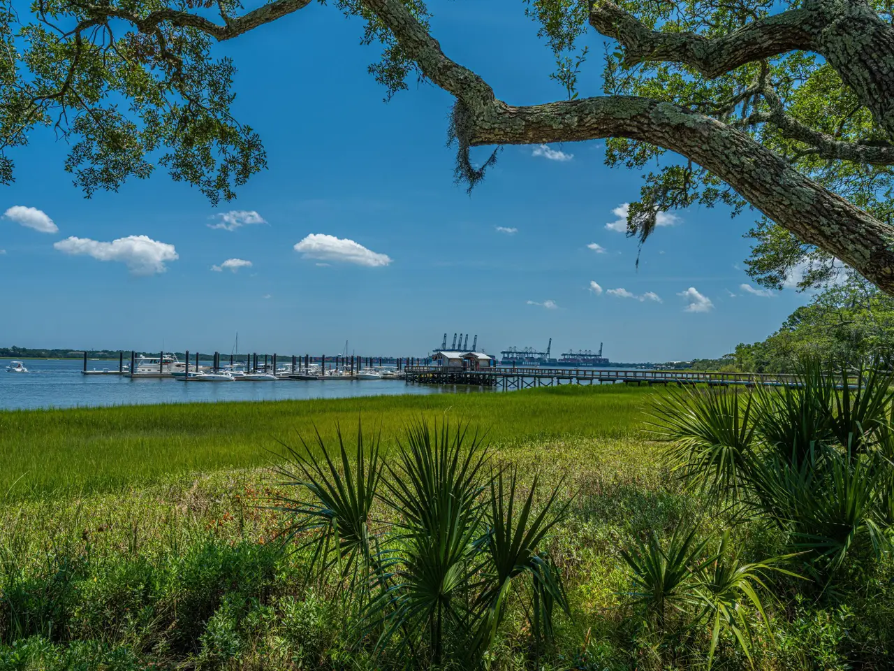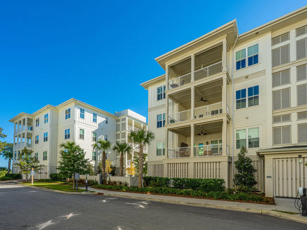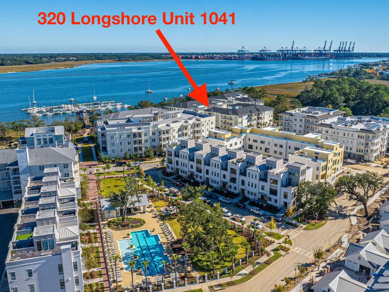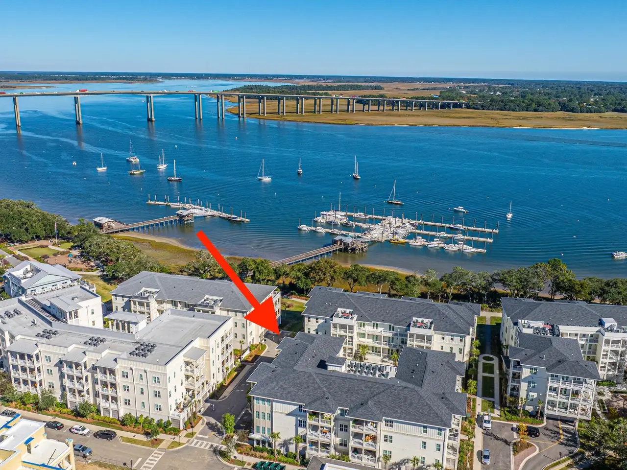 Luxury living at The Waterfront on Daniel Island! This 2024 top floor 2 bedroom 2 bathroom condominium is perfection! Enjoy fantastic views of the Wando River while basking in comfortable breezes from the large terrace. One of only six units throughout the community with no adjoining walls, experience unmatched quiet and privacy with an abundance of natural light from windows on all sides. Upgrades galore! Wide plank hardwood flooring throughout, high end lighting fixtures and ceiling fans, custom closets and kitchen pantry designed by Inspired Closets, built-in kitchen appliances offering a seamless cabinetry esthetic, professionally installed high end wallpaper, additional ceiling lighting in dining room, custom window treatments in every room, large 2 x 4 shower tile and specialty mirrors in both bathrooms, upgraded Farrow and Ball wall paint with all walls and trim receiving 2 additional coats of paint after purchase. Beautiful kitchen tile backsplash and custom countertop in pantry with added electrical outlet. Impeccably maintained unit with garage storage and 2 parking spaces conveniently located next to the elevator. Beautiful courtyard with multiple seating areas and state of the art grille. Well equipped fitness center and tranquil pool with gathering pavilion.