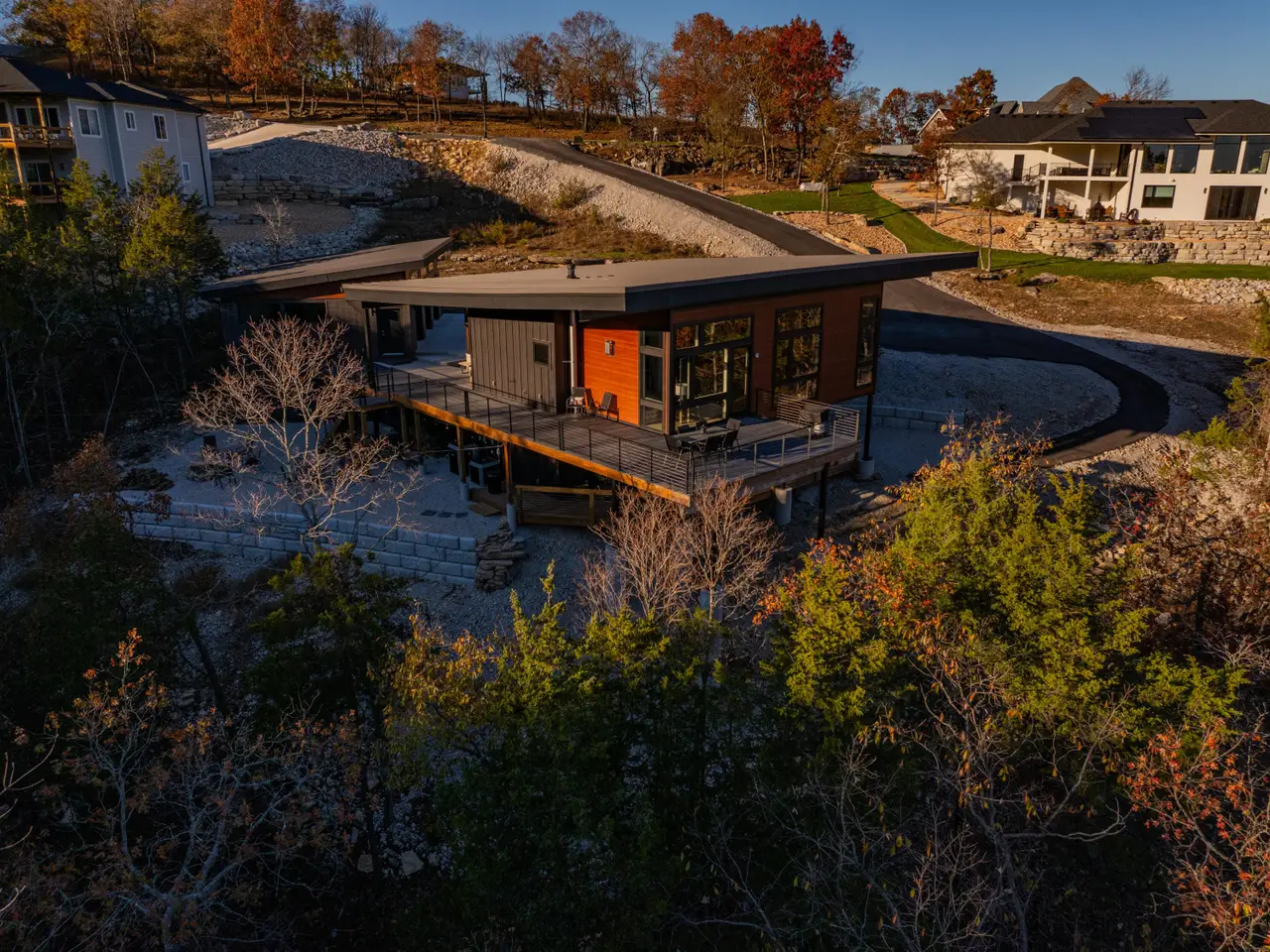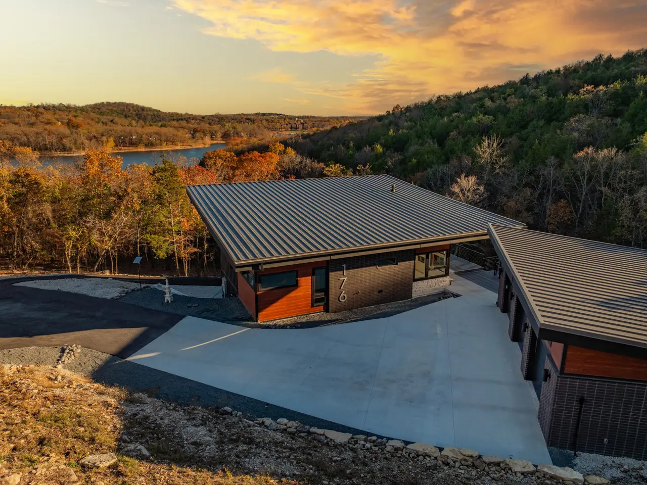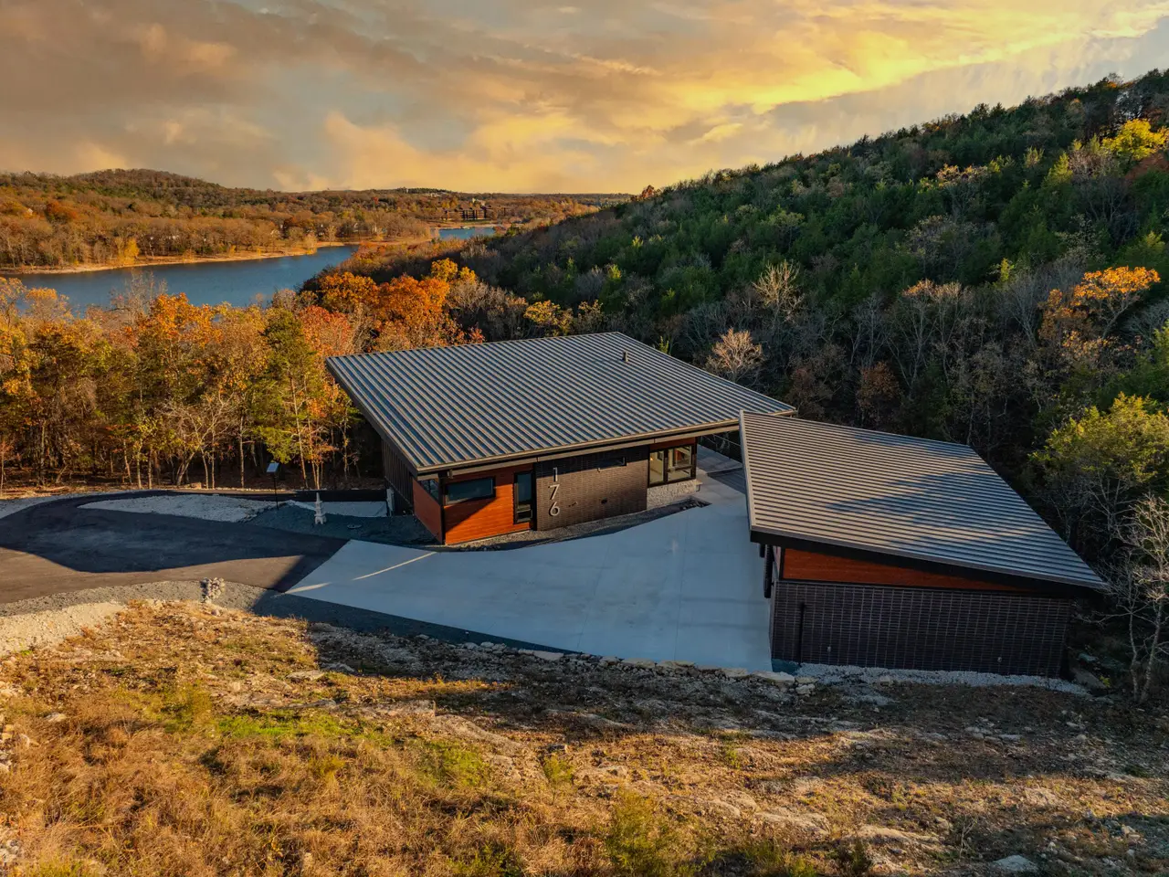 Welcome to this exclusive Modern Lakefront home that features clean lines, open floor plan, and a minimalist aesthetic, with an emphasis on natural light. This custom home was completed in 2024, sits on nearly an acre and combines classy contemporary features, offering a perfect blend of style and comfort. Explore the wet weather creek as you walk to a secluded cove which is a short walk from your private fire pit area bordered by 1.5 acre greenspace. Step inside to discover an open floor plan that seamlessly integrates living, dining, and kitchen areas with plenty of outdoor living space. The property boasts a serene setting with stunning views of Table Rock Lake and the surrounding forest, providing a tranquil backdrop for daily living and weekend getaways. Enjoy the outdoor lifestyle regardless of weather as the outdoor spaces include a colossal deck upstairs, and a large, covered deck downstairs, ideal for entertaining or relaxing. The 2nd kitchen downstairs makes entertaining a breeze. The versatile layout of this 3000+ square foot home includes 3 bedrooms, 2 1/2 baths, with a main level master bedroom, a sitting room and laundry room close to the master bedroom. Want more? Oversized 3 car detached garage, Storm Shelter, large mechanical room/workshop room in basement and huge driveway with plenty of room for toys and large vehicles. Parking for everyone. Conveniently located in the sought-after Lake Forest Hills neighborhood near Branson West with easy access to main routes to Springfield and Branson, Situated in a safe, friendly neighborhood, you'll enjoy peace of mind and the opportunity to explore Table Rock Lake and the Ozarks with Ease. (10X28 Boat Slip available for purchase separately as personal property for $65k)Offered fully furnished. Feature Sheet attached as a document