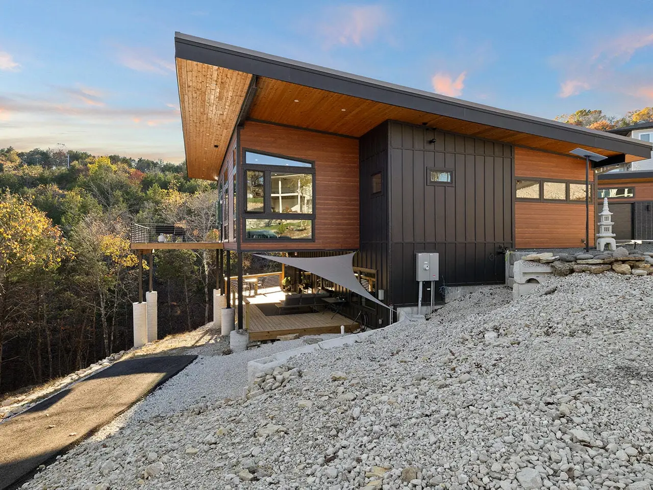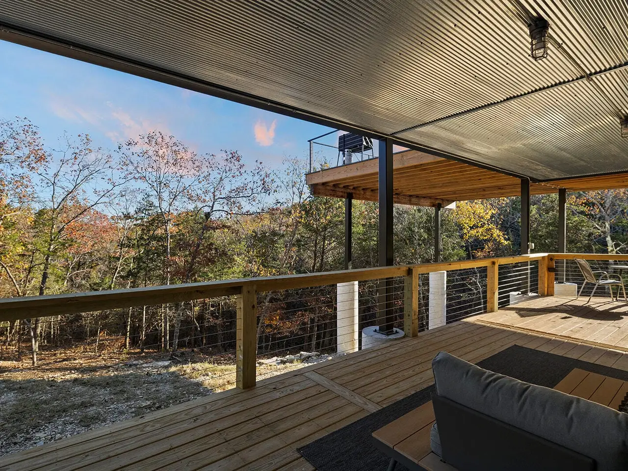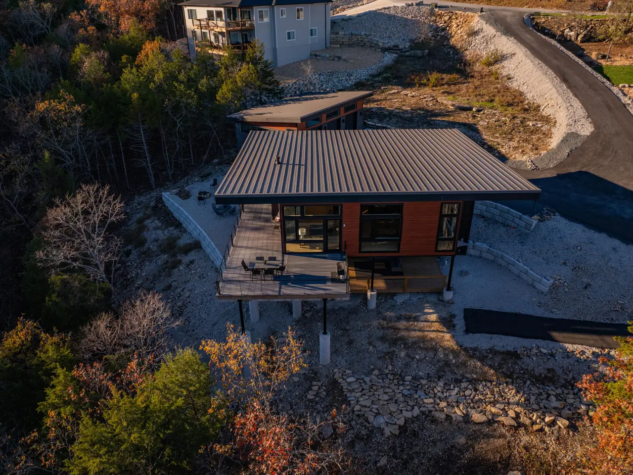 Welcome to this exclusive Modern Lakefront home that features clean lines, open floor plan, and a minimalist aesthetic, with an emphasis on natural light. This custom home was completed in 2024, sits on nearly an acre and combines classy contemporary features, offering a perfect blend of style and comfort. Explore the wet weather creek as you walk to a secluded cove which is a short walk from your private fire pit area bordered by 1.5 acre greenspace. Step inside to discover an open floor plan that seamlessly integrates living, dining, and kitchen areas with plenty of outdoor living space. The property boasts a serene setting with stunning views of Table Rock Lake and the surrounding forest, providing a tranquil backdrop for daily living and weekend getaways. Enjoy the outdoor lifestyle regardless of weather as the outdoor spaces include a colossal deck upstairs, and a large, covered deck downstairs, ideal for entertaining or relaxing. The 2nd kitchen downstairs makes entertaining a breeze. The versatile layout of this 3000+ square foot home includes 3 bedrooms, 2 1/2 baths, with a main level master bedroom, a sitting room and laundry room close to the master bedroom. Want more? Oversized 3 car detached garage, Storm Shelter, large mechanical room/workshop room in basement and huge driveway with plenty of room for toys and large vehicles. Parking for everyone. Conveniently located in the sought-after Lake Forest Hills neighborhood near Branson West with easy access to main routes to Springfield and Branson, Situated in a safe, friendly neighborhood, you'll enjoy peace of mind and the opportunity to explore Table Rock Lake and the Ozarks with Ease. (10X28 Boat Slip available for purchase separately as personal property for $65k)Offered fully furnished. Feature Sheet attached as a document