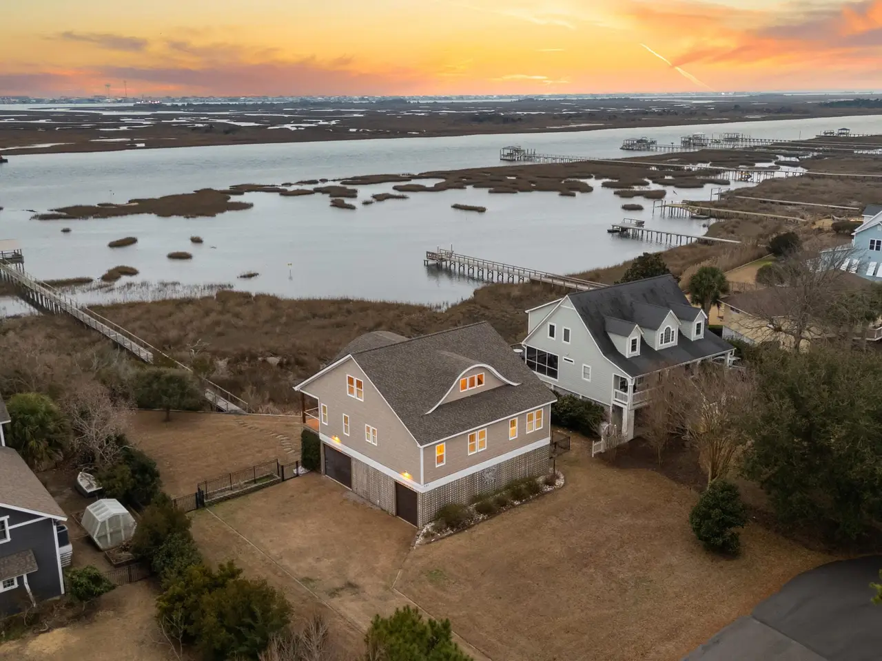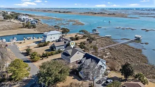 Nestled along 100 feet of pristine waterfront, this exceptional 3 bedroom, 4.5 home (plus two additional upstairs flex rooms with closets) is the perfect blend of thoughtful craftsmanship with the serenity of coastal living! The monolithic slab construction and Zip-Wall System ensure lasting strength, while the new architectural shingled roof (installed 11/2024) and impact-resistant windows provide peace of mind. Step inside, and you'll be greeted by luxurious 20x20 Spanish stone tile flooring, featuring a compass rose, setting the stage for a home that is both refined and inviting. The custom KraftMaid maple cabinetry offers soft-close dovetail drawers throughout, while the built-in wet barfeaturing a one-of-a-kind sea turtle tile backsplashcreates the ideal space for entertaining. With an elevator-shaft, a whole-house water filtration and softener system, and a cedar-lined storage window seat in the spacious upstairs Family Bonus Room, every detail has been carefully curated for comfort and convenience. Freshly painted inside and out (12/2024), this meticulously maintained home also includes a garage workshop wired for 20A service, ample space for a small boat on a trailer, and three Carolina Perception kayaks with ruddersready for new owners to explore the beauty of the coast. Outside you will find where the expansive covered porch with Cypress decking and sleek cable railing invites you to unwind with beautiful unobstructed ICW views. Venture down to your oversized dock, featuring built-in seating, a full roof, a kayak launch, a fish-cleaning station, and drive-on boat docking for a flat bottom boat or jet skis; a dream setup for avid boaters and fishermen alike. The Harbour Village Marina and Topsail Inlet are just moments away, ensuring effortless access to the best coastal waters. This is more than a home; it's a legacy of waterfront living, where crabbing with a string, fishing and watching sunsets ensure memories to last a lifetime!