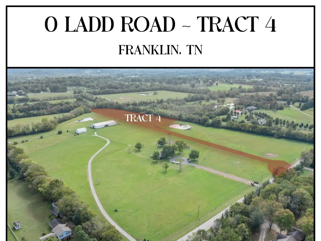 Once-in-a-Lifetime Opportunity - Build Your Dream Home on 7 Stunning Level Acres in Franklin, TN! Imagine waking up to the gentle glow of the sunrise, sipping coffee as mist rises off the tree line, and ending your day with a breathtaking sunset over rolling countryside. This is more than just land--it's a rare chance to create your own peaceful retreat in an exclusive 5-tract subdivision featuring expansive lots, upscale living, and the charm of country serenity--all just minutes from shopping, dining, and entertainment in Franklin. Endless Possibilities Await! Sprawling 7 Acres - Plenty of space for your custom-built estate, 6-Bedroom Perc Approval - Build the home of your dreams with room for everyone, Minimal Covenants - Enjoy the freedom to create your vision without excessive restrictions, Incredible Views - Wake up to sunrises and sunsets that belong to you. The Perfect Blend of Privacy & Convenience. Feel miles away from the world while being just moments from Franklin's vibrant amenities, top-rated schools, and easy access to I-65. This is more than land--it's the foundation for your future. Don't miss your chance to own something truly special! Future residence structures shall be no less than 4,300 sq ft above grade construction. Black 4 board, painted black fencing along Ladd Road already installed. Bring Your Own Builder and Build Your Dream Home!