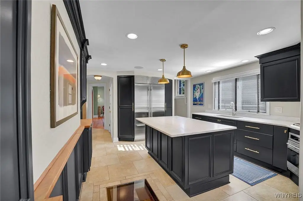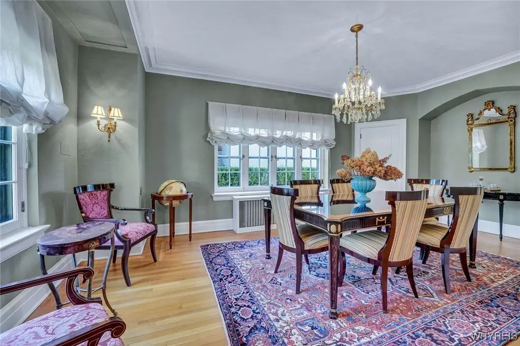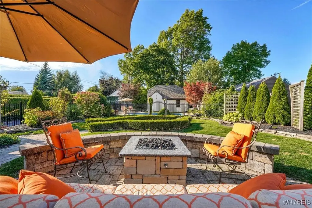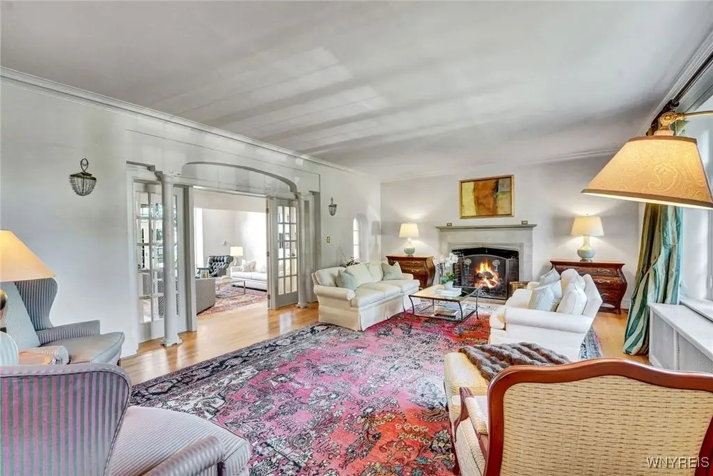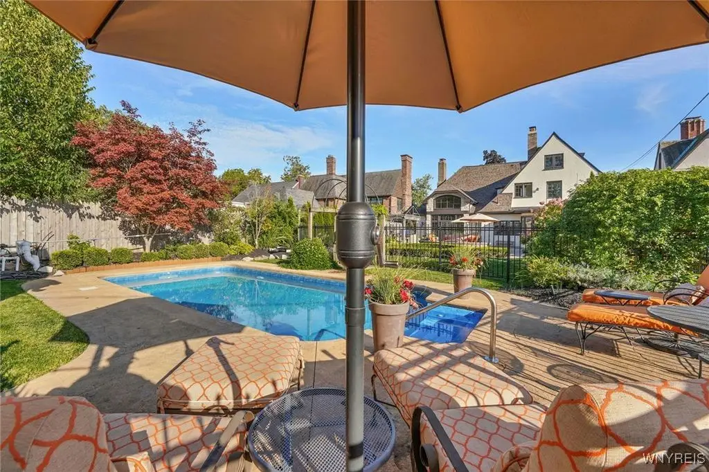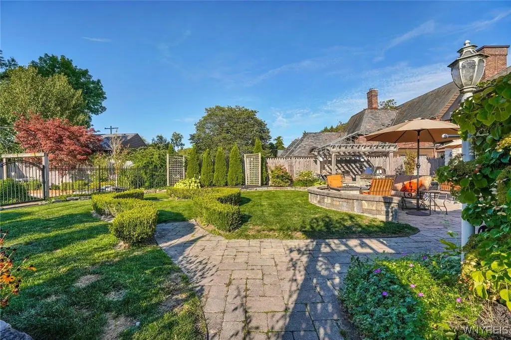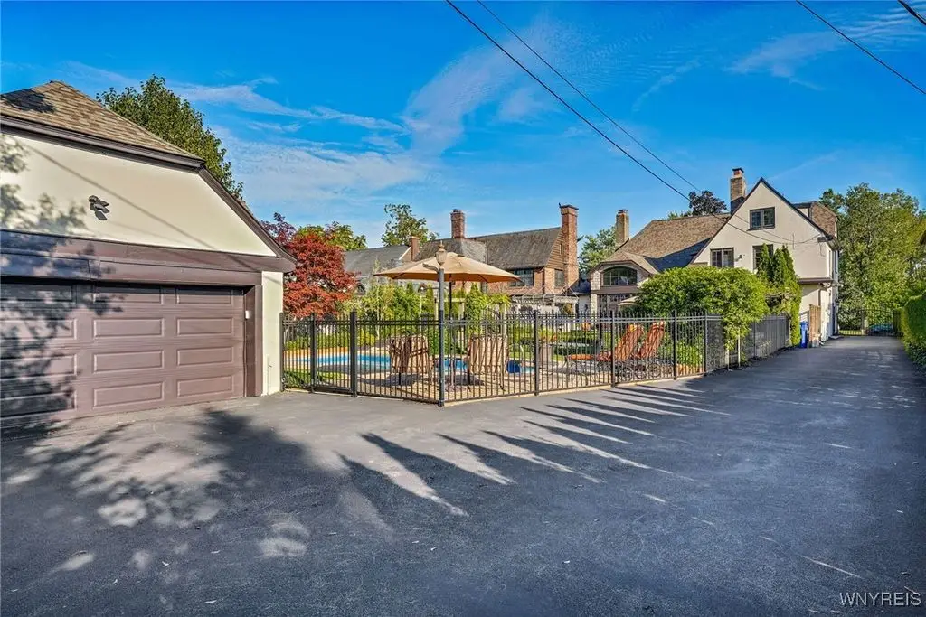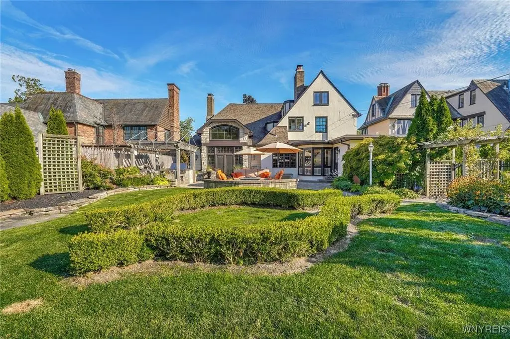 Timeless Elegance Meets Modern Luxury Across from Delaware Park at 81 Nottingham Terrace. Discover refined living in this stunning 4 bedroom, 3.5 bath Tudor estate, perfectly positioned across from Olmsted's historic Delaware Park. A seamless blend of classic architecture and contemporary upgrades, this home offers exceptional comfort and elegant style. The fully remodeled chef's kitchen is a showpiece, featuring premium appliances including a Sub-Zero refrigerator, Wolf range, Cove dishwasher, and a built-in coffee bar. Elegant Carrara marble countertops and a spacious island make it ideal for both cooking and entertaining. The kitchen opens to a bright breakfast room and offers a unique view into the climate-controlled wine cellar, which holds up to 1,000 bottles of wine. The formal dining room, adorned with its original chandelier, flows into a grand foyer. A spacious living room centers around a striking woodburning limestone fireplace, while the large modern family room features radiant heated floors and a loft above. French doors lead to a private courtyard patio, perfect for relaxing or hosting guests. The distinguished library/study offers warmth and character with a wood-burning fireplace and custom built-in bookshelves. Original hardwood floors and incredible woodwork throughout. Gorgeous staircases show the charm and character of this exquisite home. Upstairs, the luxurious primary suite includes three closets and a spa-inspired ensuite bath. The second bedroom opens to a Juliet balcony, and the third bedroom features a generous walk-in closet. The third-floor bedroom includes an additional full bathroom, ideal for guests or a private retreat. Outdoor living is equally impressive - enjoy a saltwater inground pool, a stone fire pit for cozy evenings, grilling area designed for effortless entertaining. Fully fenced electronic gated yard with sprinkler system. Updates include roof, boiler system ($30,000), Generac generator, and much more. This exceptional home combines historic charm, modern amenities, and resort-style outdoor living in one of Buffalo's most coveted neighborhoods.