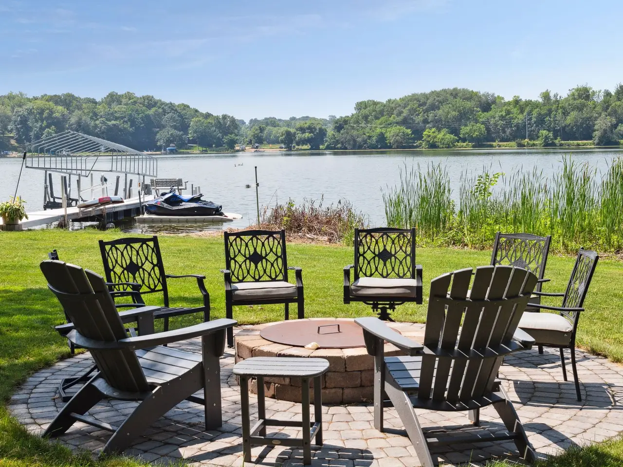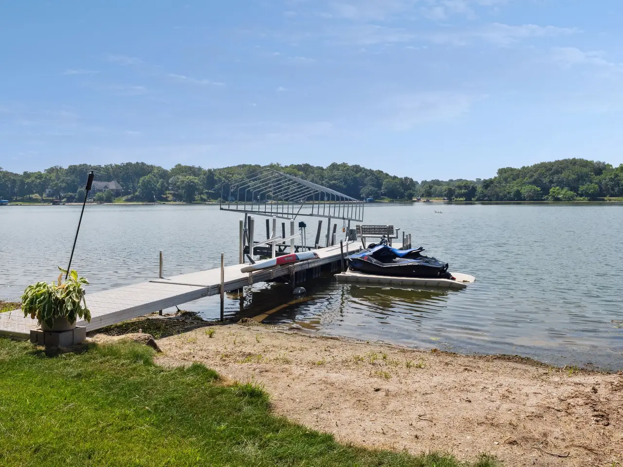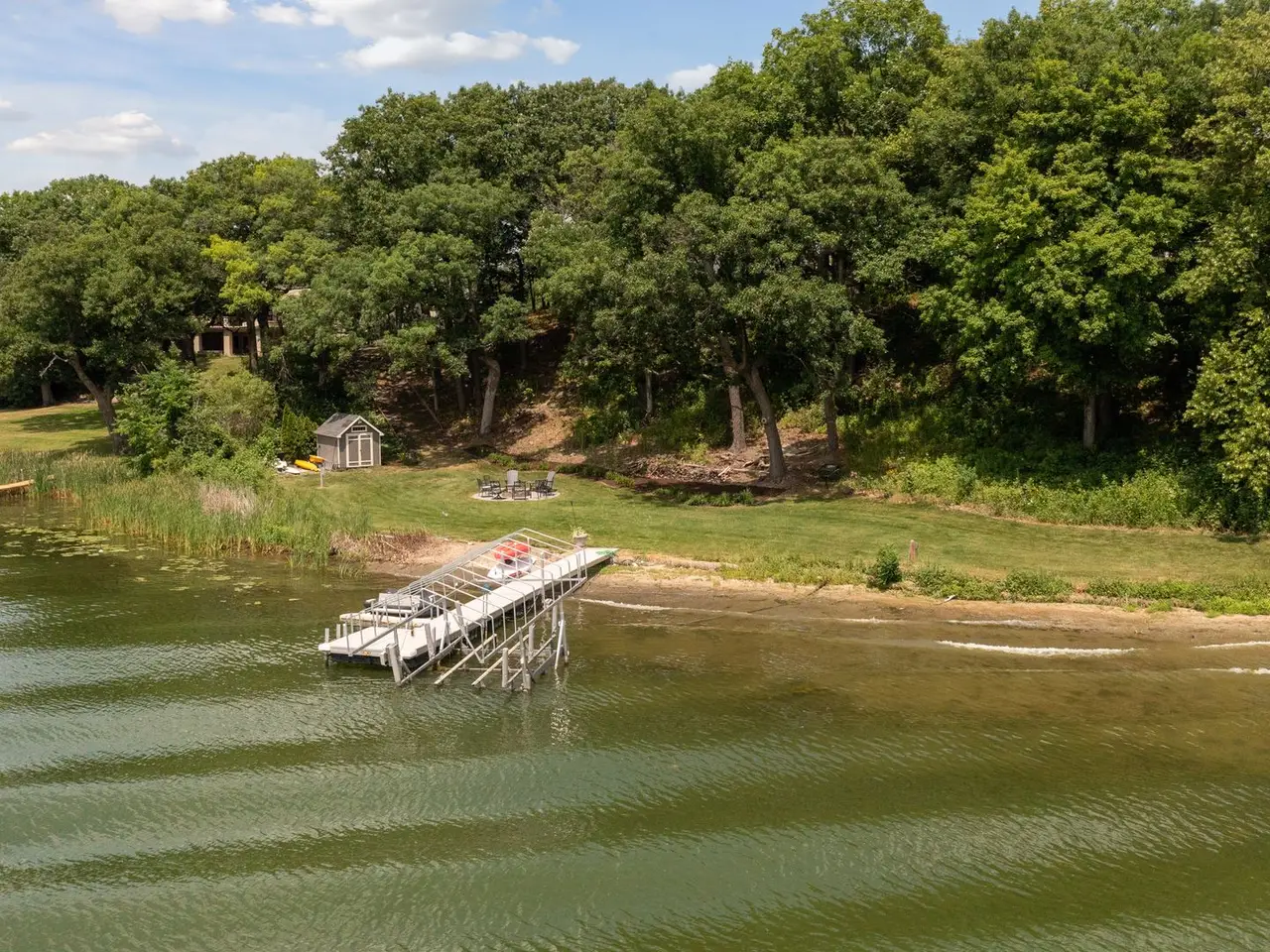 Remarkable home on a private 1.5-acre lot in Chevalle Neighborhood, on Lake Bavaria with nearly 200 feet of hard sand level lakeshore. This home sits on the best lot on the lake because it has the most usable flat grass area you can drive your car or ATV to for all sorts of summer fun right on the lake. Calling all fisherman! Sellers catch huge bass off the end of their dock as 20 feet deep, nice! Grand fireplace in the backyard to host exciting parties all summer and fall. High demand primary suite on the main level has stunning lake views year-round. Spacious three-season porch for another spot to enjoy your tranquil water views. The upper level has laundry, huge cozy loft and three generous bedrooms (one en suite and one pass-thru bathroom between two bedrooms) Entertain in the lower-level with your own theater room, bar area, billiards room, 5th bedroom and workout room. There is nothing this home does not have! You will not want to miss out on this one-of-a-kind home!