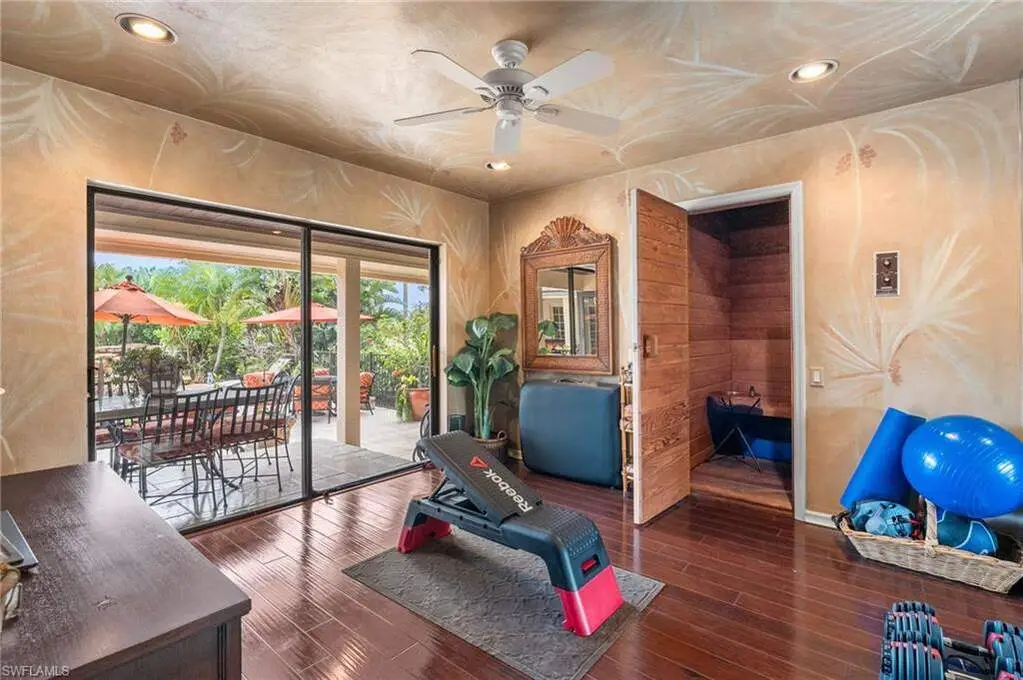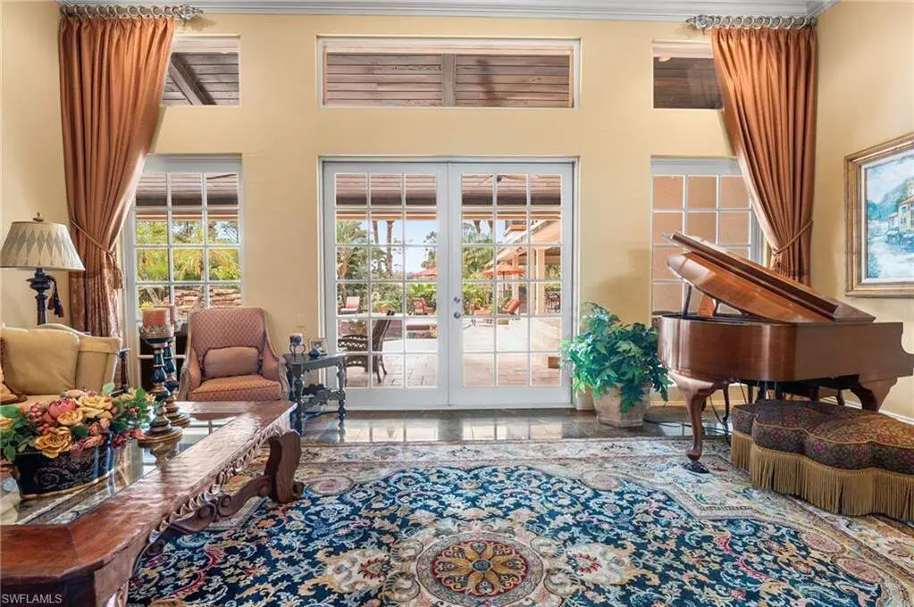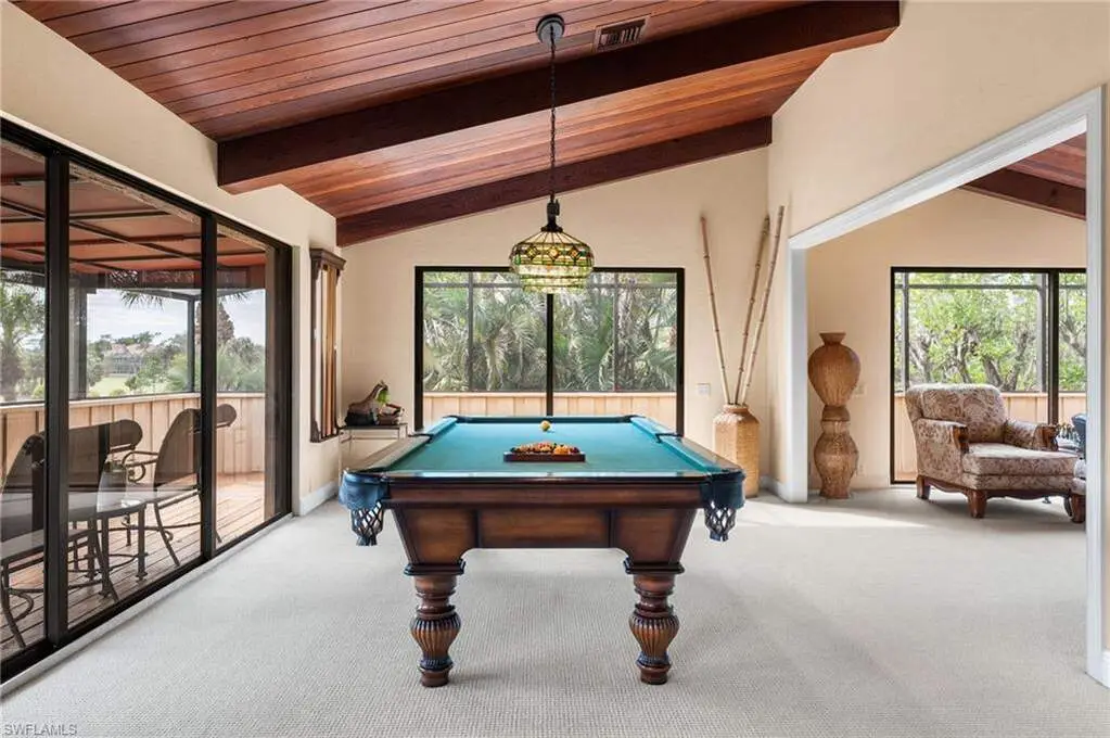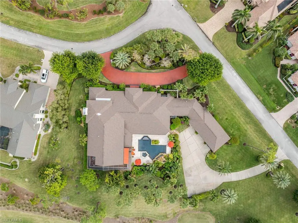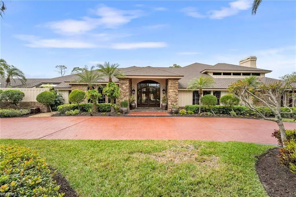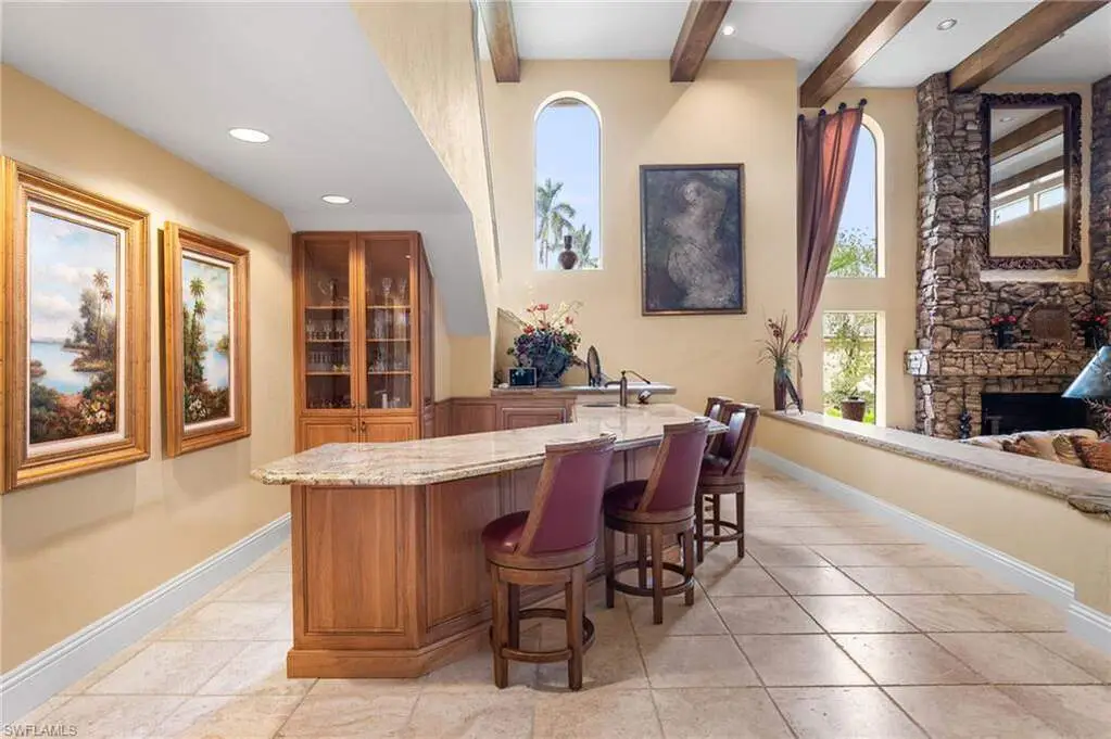 Welcome to an exquisite luxury estate, meticulously crafted by Rutenberg Custom Homes in collaboration with six accomplished architects, situated on two expansive lots. This remarkable property offers picture-perfect views of the 7th green and 8th tee box within one of Fort Myers' most exclusive country clubs. The gourmet kitchen is a chef's dream, equipped with high-end appliances, including a paneled Sub-Zero refrigerator, a professional Thermador microwave and range with a 48-inch gas cooktop, Dacor double ovens, custom cabinetry with pull-out shelves, a coffee bar, a double pantry, and an island with double-sided storage. Entertainment spaces abound in this estate. The grand salon features a sunken design, French doors opening to the lanai, double front doors, and an adjacent formal dining area. The family room showcases soaring 20-foot ceilings, wood beam accents, a stone fireplace, and natural stone details. A main floor bar, outfitted with granite countertops, a sink, a wine fridge, an automatic ice maker, and a large beverage cooler, completes the perfect setting for gatherings. The primary wing is a private sanctuary, boasting two large walk-in closets, dual water closets-one with a bidet-dual vanities, a heated Jacuzzi tub nestled in an oasis, and a walk-in shower enhanced by a heat lamp. The primary wing also includes a private office featuring wood flooring, custom built-ins, a ladder rail, and a full bathroom. The thoughtfully designed bedrooms include second and third suites with carpeting, walk-in showers, single sinks, vanities, and walk-in closets, while the fifth and sixth bedrooms share a bath with a clawfoot tub, a glass-enclosed rain shower, and dual sinks. The loft is a versatile retreat, offering a vaulted Redwood ceiling with beams, a wrap-around screened balcony with treetop, golf course, and lanai views, and a fully outfitted bar. The expansive laundry room offers ample cabinetry, a Whirlpool stainless side-by-side refrigerator, and a Whirlpool Cabrio Platinum washer and dryer. The garage is equally impressive, featuring epoxy floors, built-in overhead storage, storage cabinets, and two golf carts (negotiable). Additional features include a home gym with wall mirrors, a sauna, and a full bath (shared with the pool). The lanai is an outdoor paradise, featuring travertine flooring, multiple seating areas, an electric-heated saltwater pool and spa with a natural waterfall, a swim-up bar, a Cypress wood ceiling wired for sound, and complete privacy The unique characteristics of this home epitomize luxury living with a harmonious blend of sophisticated design and modern amenities.