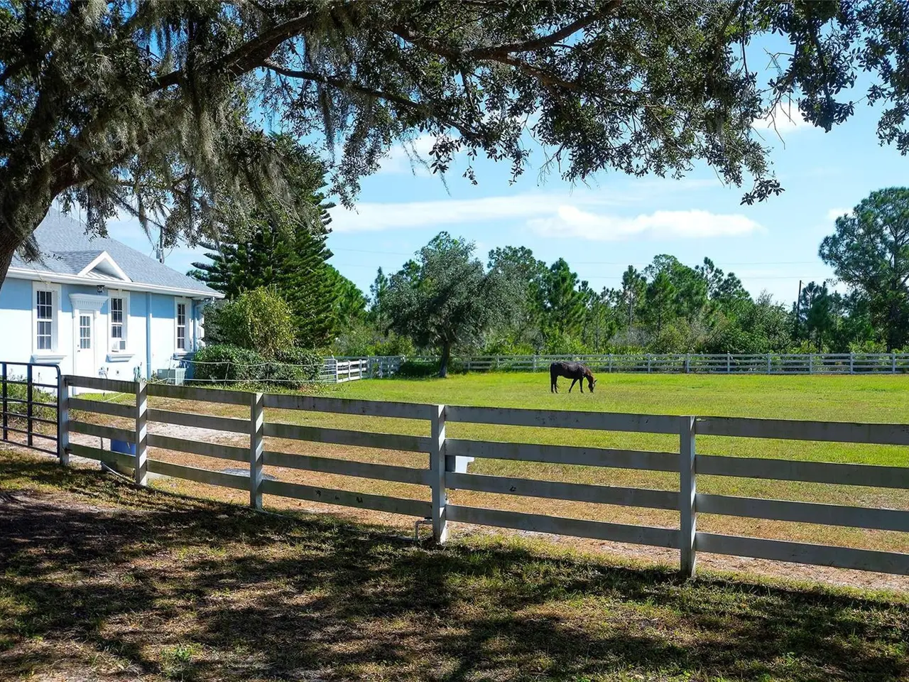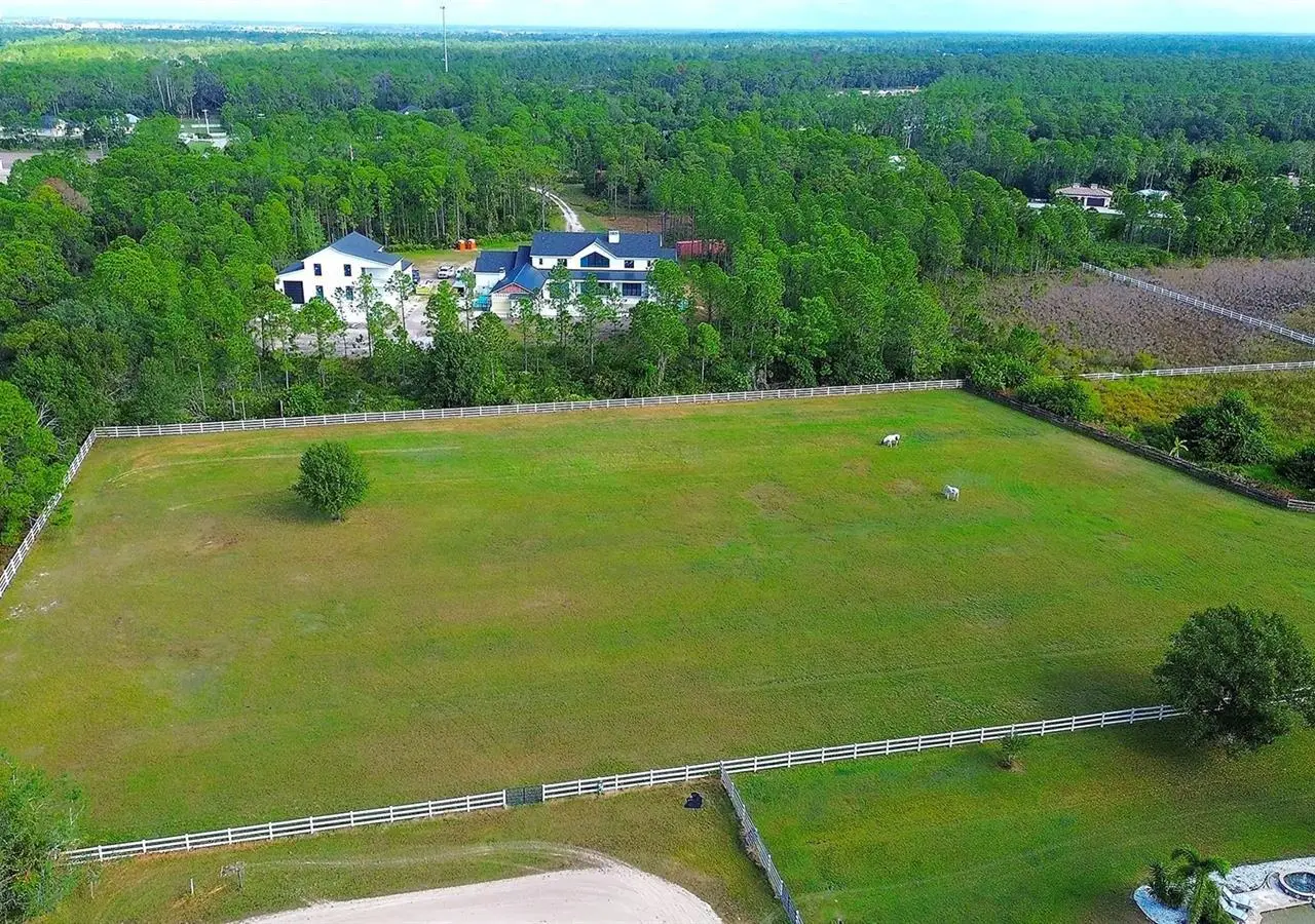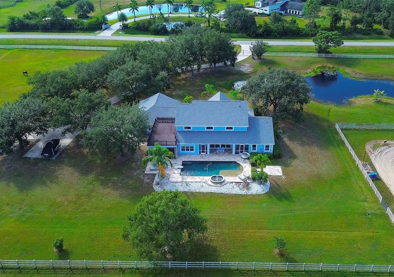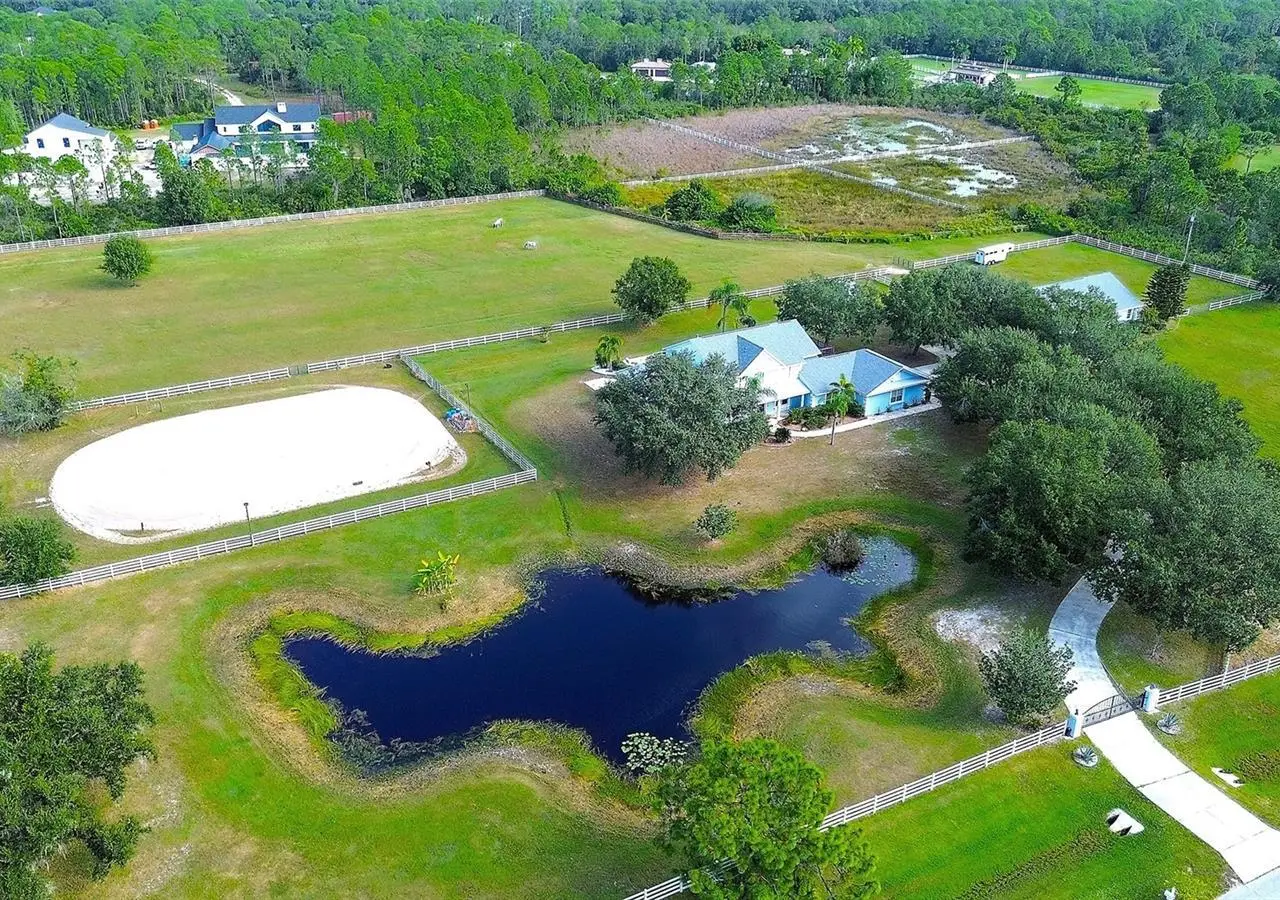 Gated and completely fenced, this elegant traditional home is in the highly sought after neighborhood of Foxwood in Panther Ridge. Its storm ready and perfectly positioned in Zone X, sitting high and dry, with no flood insurance required. Adding to your peace of mind, the house and barn have new roofs in 2025, each with a transferrable warranty. This country estate offers enduring craftmanship. Arrive through the automatic gate to the oak tree lined driveway. The view of pasture and block barn on right and pond on left make for beautiful curbside appeal. Step onto front porch and enter the marble foyer. Once inside you will find an impressive gourmet kitchen with cherry cabinetry, Cambria quarts, a 6 burned DACOR gas range, Sub-Zero refrigerator, Miele dishwasher-ideal for those who love to cook. The kitchen is light and airy with breakfast bar and plenty of room for table to view the saltwater pool with Baha shelf. The first-floor primary suite features a gas fireplace, spa-inspired bath with Mr. Steam shower and brass clawfoot tub, and custom closets with locking cabinetry. The great room has 20-foot ceilings, gas fireplace, marble floors and poplar built-ins open to a screened lanai with an automatic shade for effortless indoor-outdoor living. Additional rooms on first floor are spacious dining room, office, and private bedroom with ensuite bath. Featured upstairs is a large bonus room with bar connecting to a TREX deck overlooking pool with generous travertine surround. Two additional bedrooms and bathroom complete the second floor. The block barn designed with 4 stalls, individual turnouts, automatic fly system, fans, tack room, feed room, wash racks, and RV outlets. The barn offers infinite flexibility and could be converted into a guest house, workshop, or space for a car collector. Both the home and barn feature Miami-Dade hurricane rated windows and doors. For year-round comfort and security, a 30KW Generac generator and Martin garage doors have been installed. It is important to note that Panther Ridge offers miles of groomed private trails with bridges, oak hammocks, pine forests. Horseback riding, hiking and biking are allowed with no motorized vehicles to disturb the beauty of Mother Nature. Panther Ridge is a prime location for the Florida country living lifestyle. The serene setting and proximity to hospitals, schools, shopping, sports parks and only 8 miles from I-75. Bordering on the West side of the community is The Concession Golf Club designed by Jack Nicklaus and Gary Player. Don't miss the opportunity to live and enjoy this home in a unique setting. Places like this are not being built with everything this extraordinary home and property have to offer.