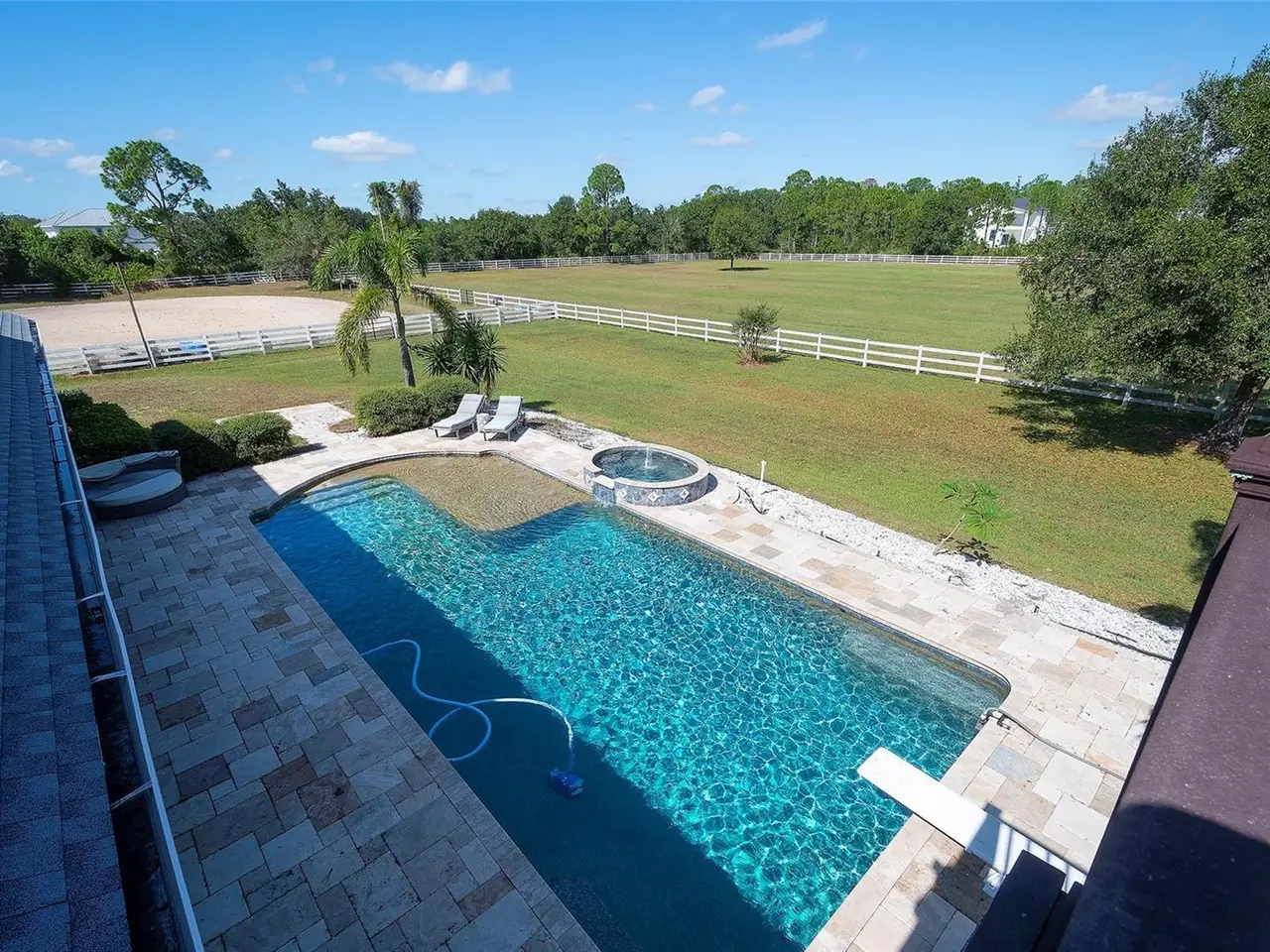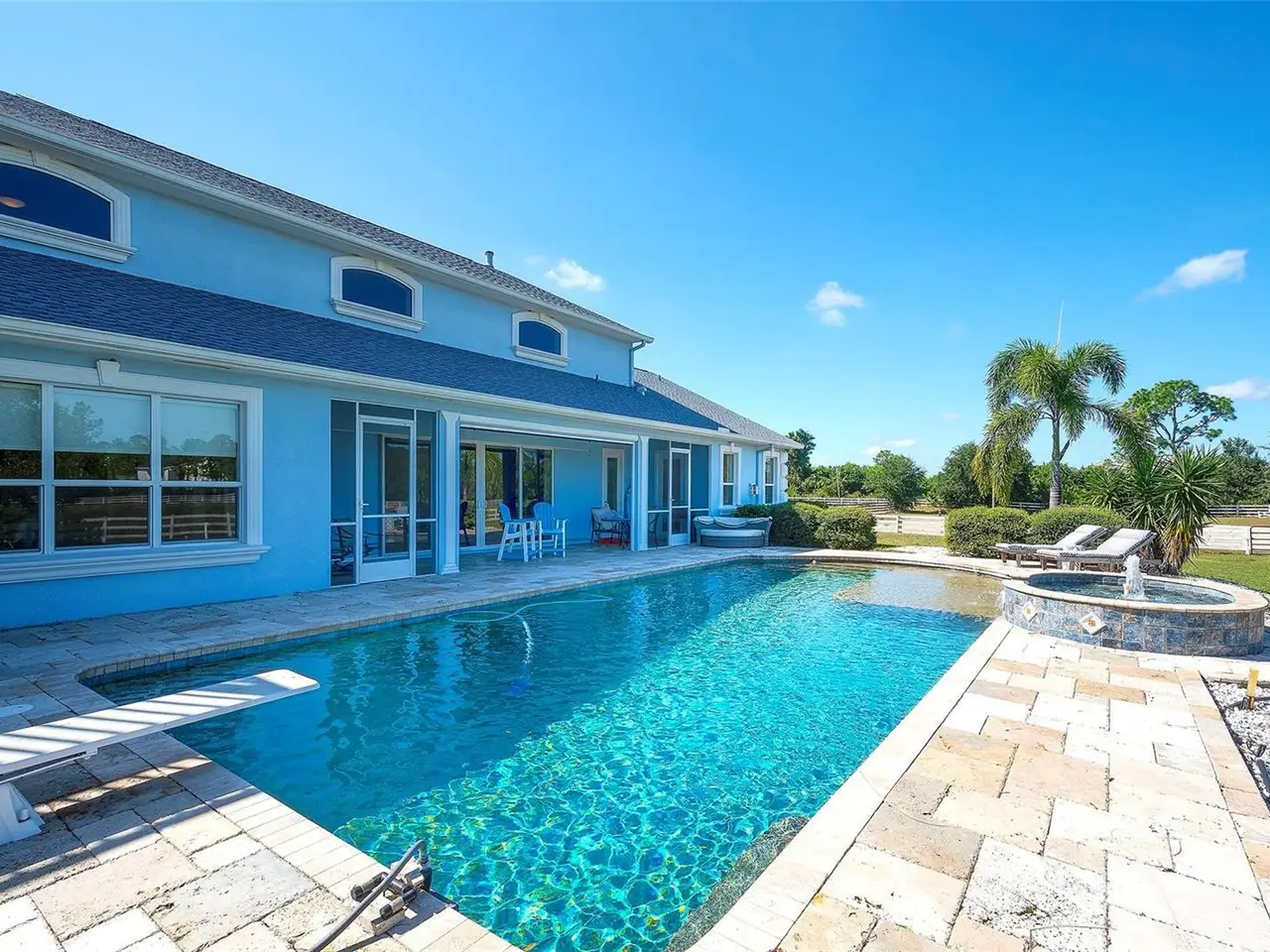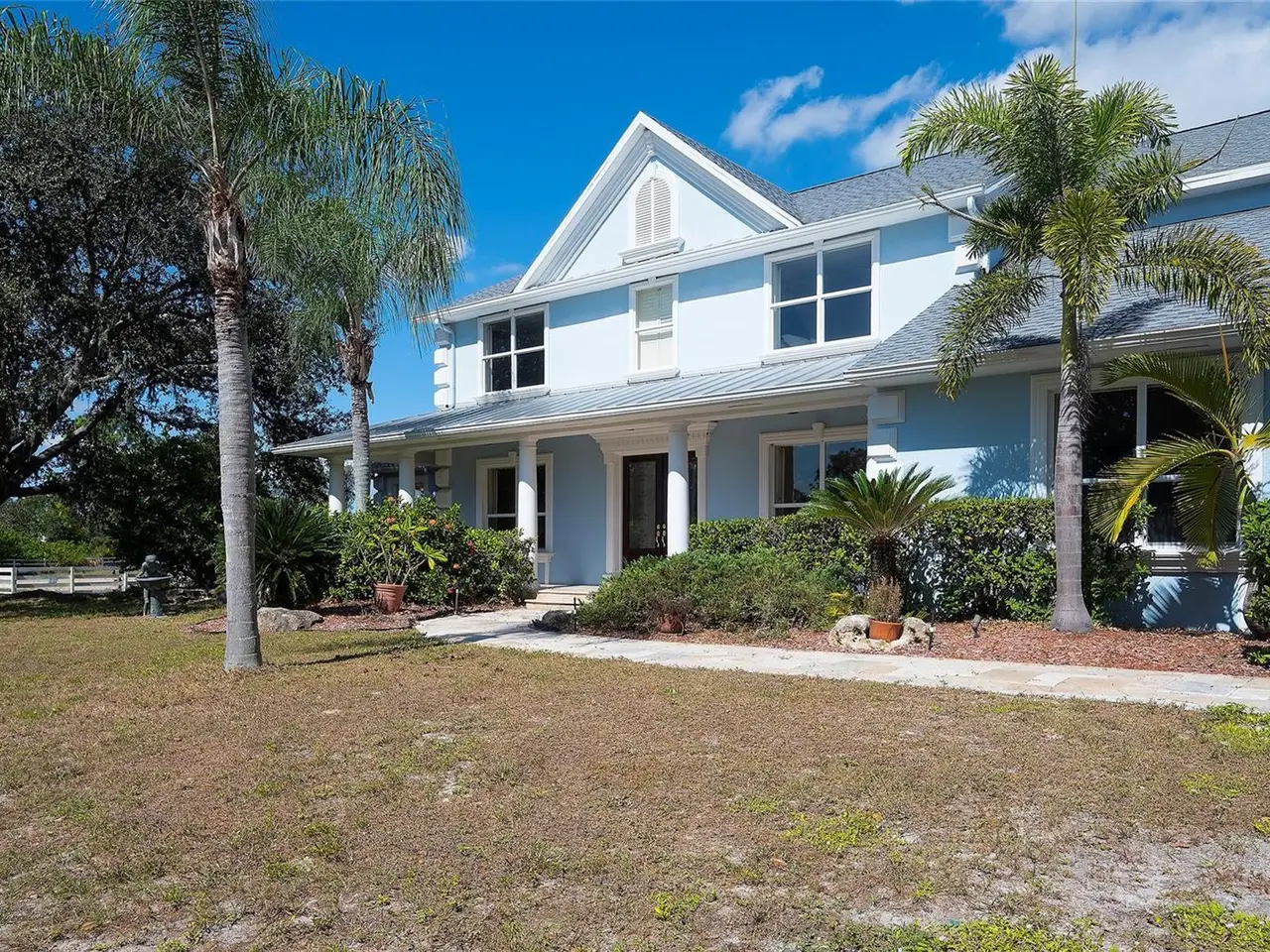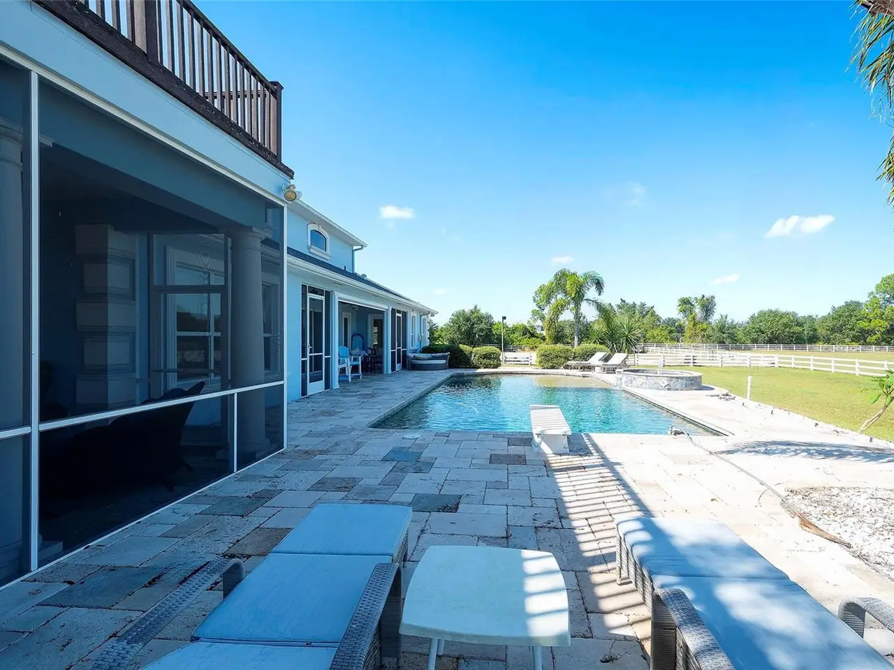 Gated and completely fenced, this elegant traditional home is in the highly sought after neighborhood of Foxwood in Panther Ridge. Its storm ready and perfectly positioned in Zone X, sitting high and dry, with no flood insurance required. Adding to your peace of mind, the house and barn have new roofs in 2025, each with a transferrable warranty. This country estate offers enduring craftmanship. Arrive through the automatic gate to the oak tree lined driveway. The view of pasture and block barn on right and pond on left make for beautiful curbside appeal. Step onto front porch and enter the marble foyer. Once inside you will find an impressive gourmet kitchen with cherry cabinetry, Cambria quarts, a 6 burned DACOR gas range, Sub-Zero refrigerator, Miele dishwasher-ideal for those who love to cook. The kitchen is light and airy with breakfast bar and plenty of room for table to view the saltwater pool with Baha shelf. The first-floor primary suite features a gas fireplace, spa-inspired bath with Mr. Steam shower and brass clawfoot tub, and custom closets with locking cabinetry. The great room has 20-foot ceilings, gas fireplace, marble floors and poplar built-ins open to a screened lanai with an automatic shade for effortless indoor-outdoor living. Additional rooms on first floor are spacious dining room, office, and private bedroom with ensuite bath. Featured upstairs is a large bonus room with bar connecting to a TREX deck overlooking pool with generous travertine surround. Two additional bedrooms and bathroom complete the second floor. The block barn designed with 4 stalls, individual turnouts, automatic fly system, fans, tack room, feed room, wash racks, and RV outlets. The barn offers infinite flexibility and could be converted into a guest house, workshop, or space for a car collector. Both the home and barn feature Miami-Dade hurricane rated windows and doors. For year-round comfort and security, a 30KW Generac generator and Martin garage doors have been installed. It is important to note that Panther Ridge offers miles of groomed private trails with bridges, oak hammocks, pine forests. Horseback riding, hiking and biking are allowed with no motorized vehicles to disturb the beauty of Mother Nature. Panther Ridge is a prime location for the Florida country living lifestyle. The serene setting and proximity to hospitals, schools, shopping, sports parks and only 8 miles from I-75. Bordering on the West side of the community is The Concession Golf Club designed by Jack Nicklaus and Gary Player. Don't miss the opportunity to live and enjoy this home in a unique setting. Places like this are not being built with everything this extraordinary home and property have to offer.