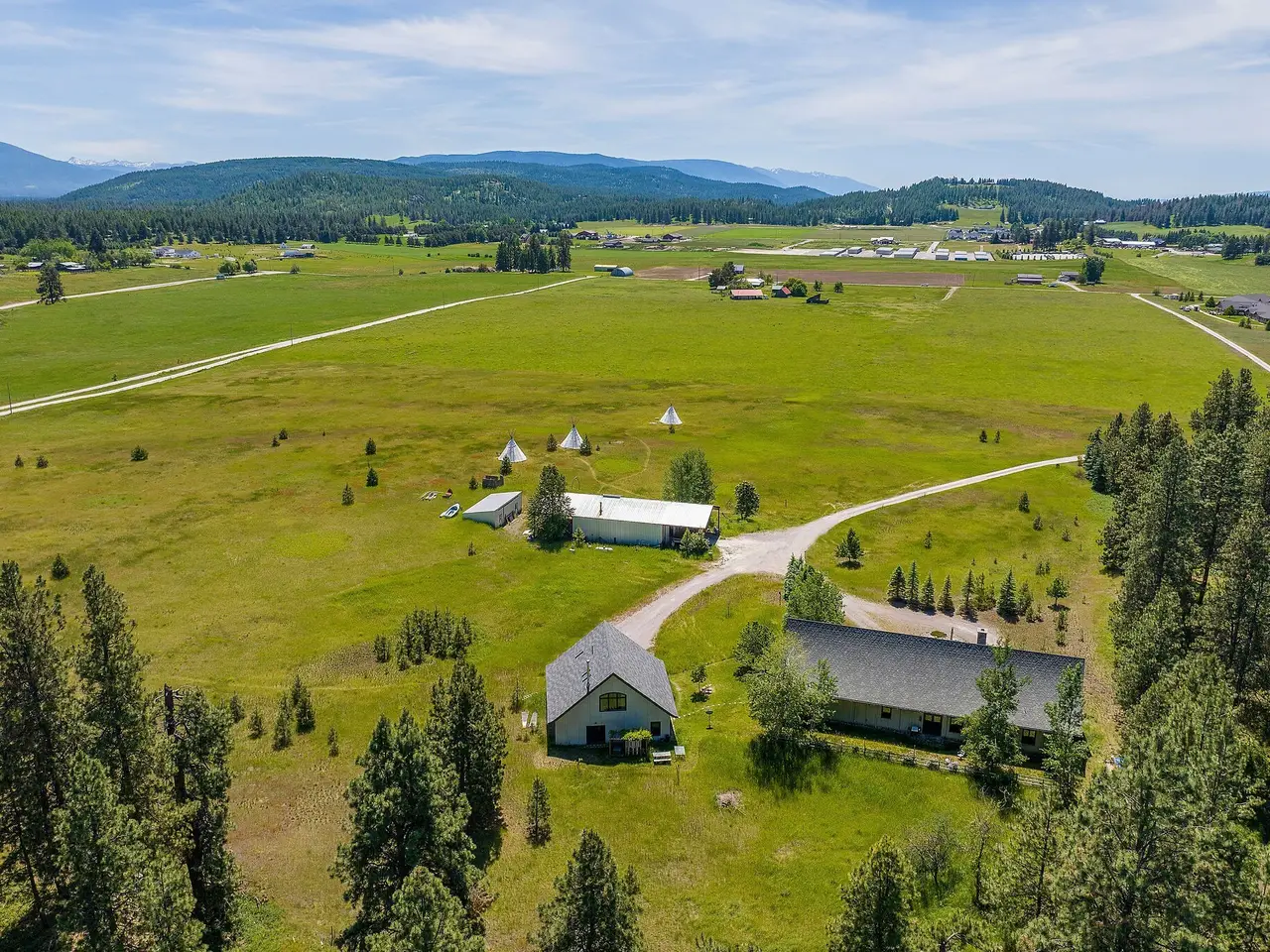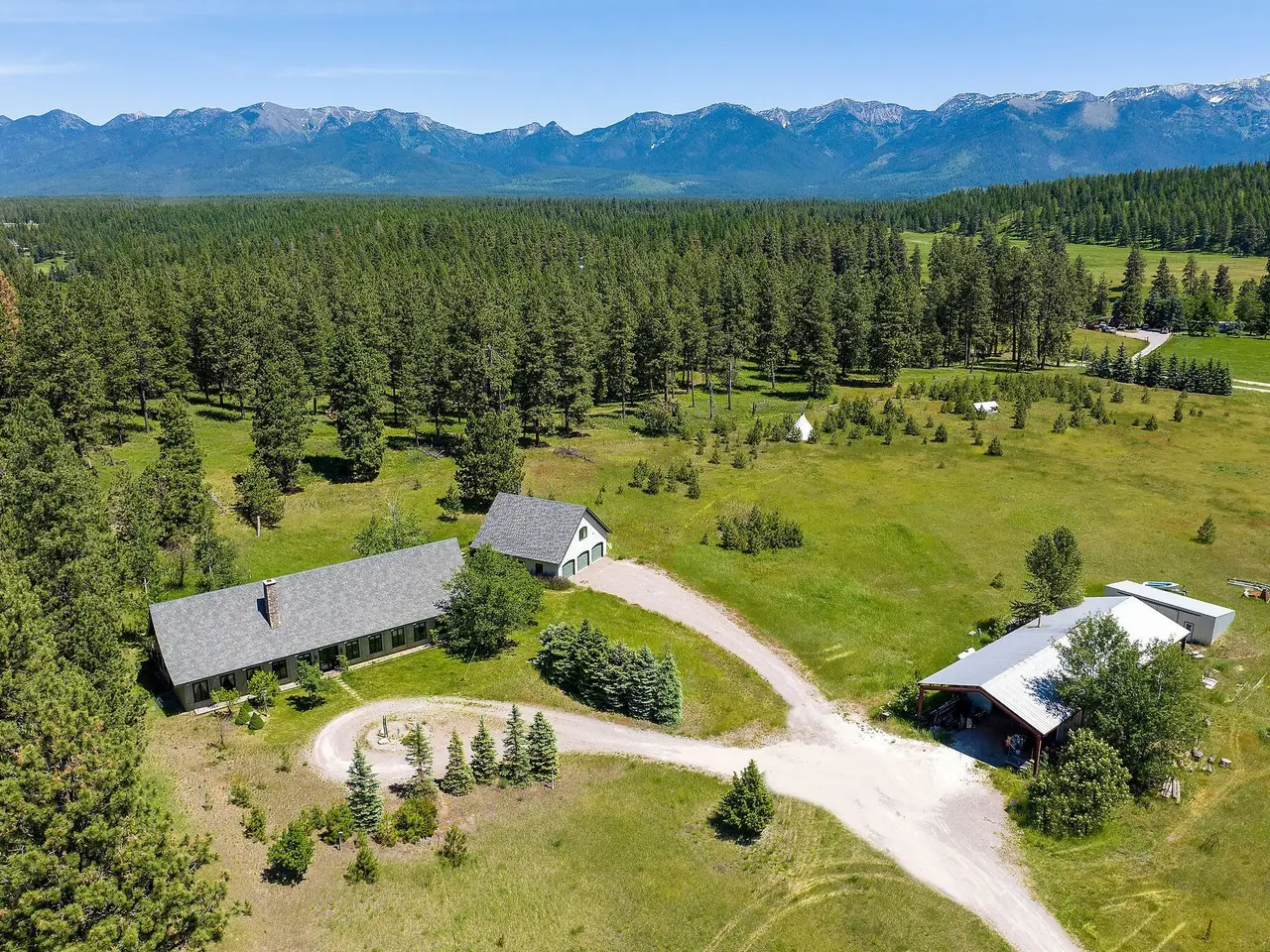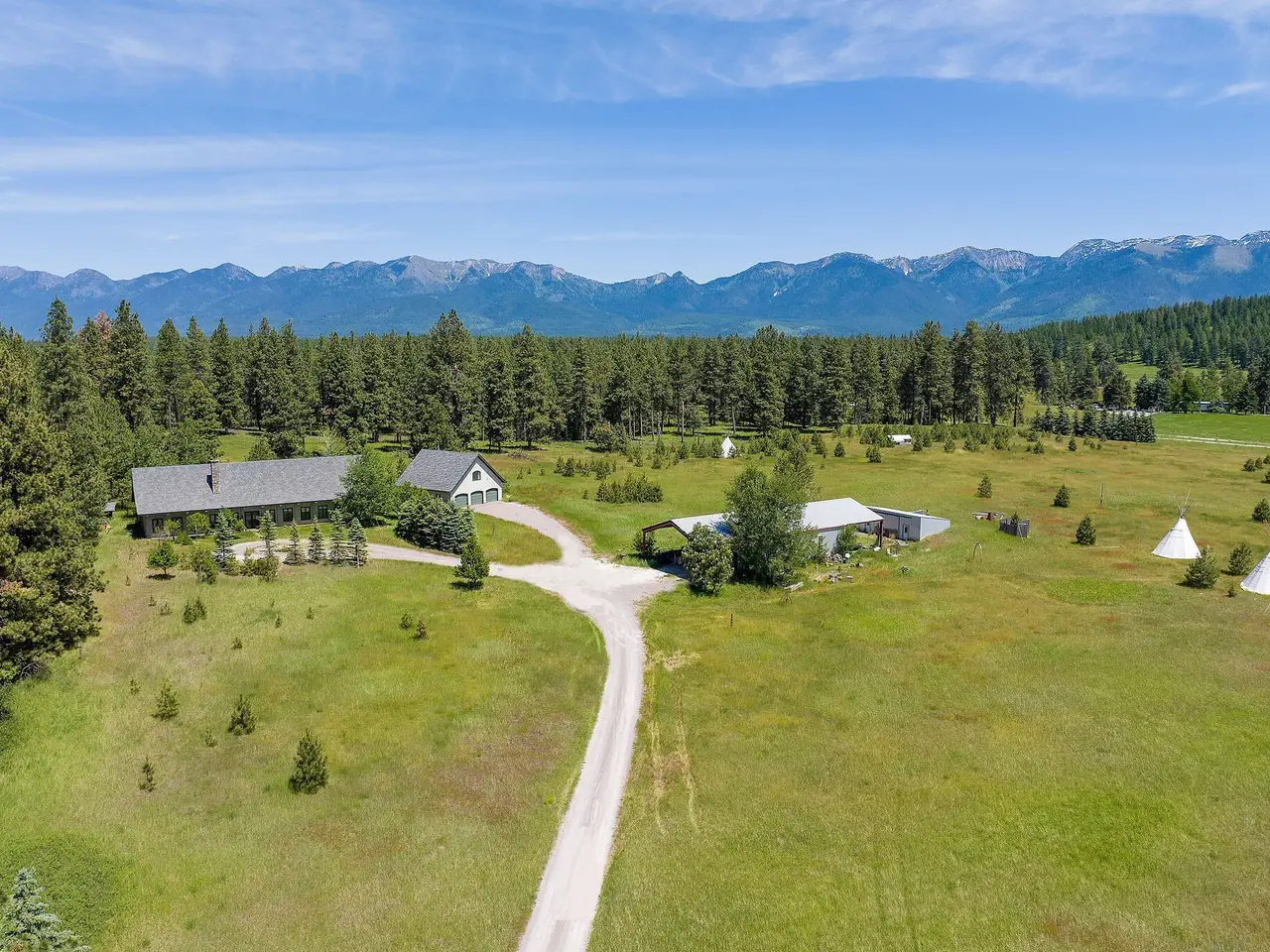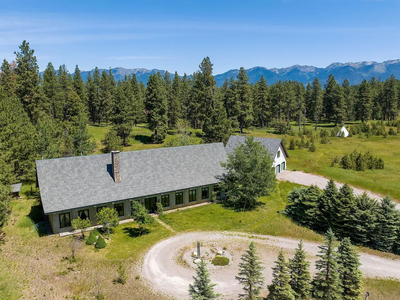 This stunning concrete tilt-up home is set on a breathtaking 20-acre meadow property, offering a serene and tranquil atmosphere just minutes from downtown Bigfork. The exceptional architectural design features magnificent arched concrete beams that support the unique structure. Inside, the spacious great room includes three luxurious bedroom suites and two distinctive lofts, all showcasing spectacular views of the surrounding meadow and mountain range. A guest suite above the garage adds a fourth bedroom, complete with a full bath, mini kitchen and gas fireplace. Additional rooms on the ground floor provide versatile options for various uses. The property also boasts a fully functional 2,120-square-foot workshop garage, currently serving as a working artist studio. This one-of-a-kind home is truly a masterpiece.