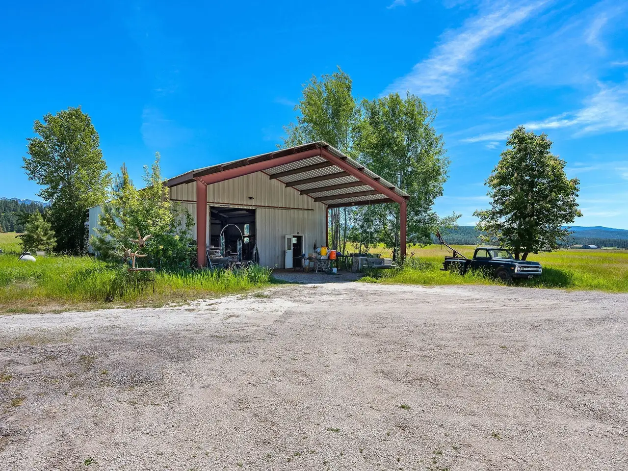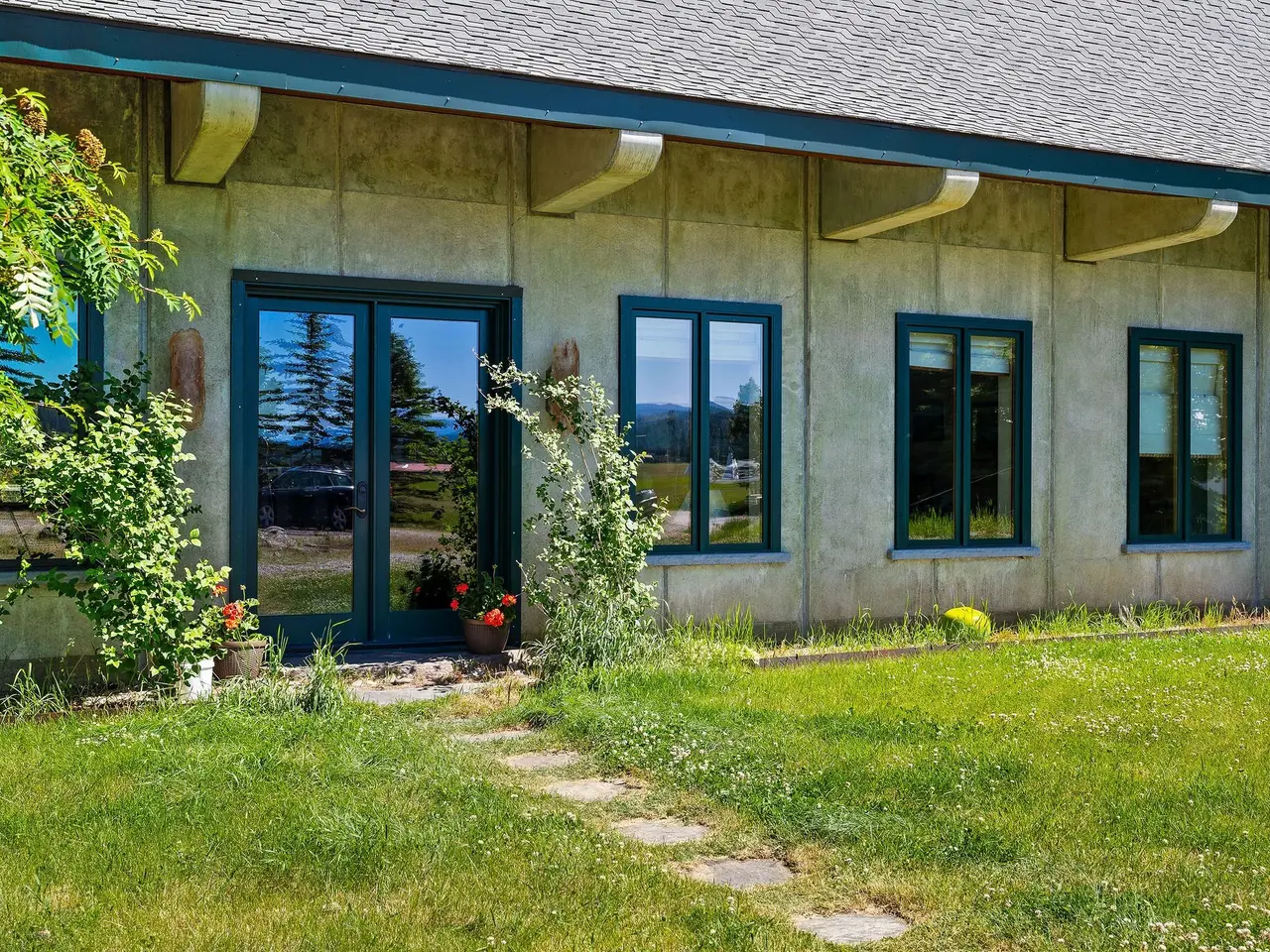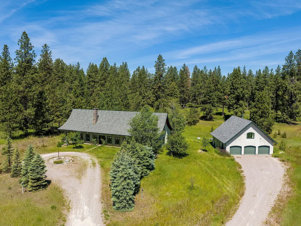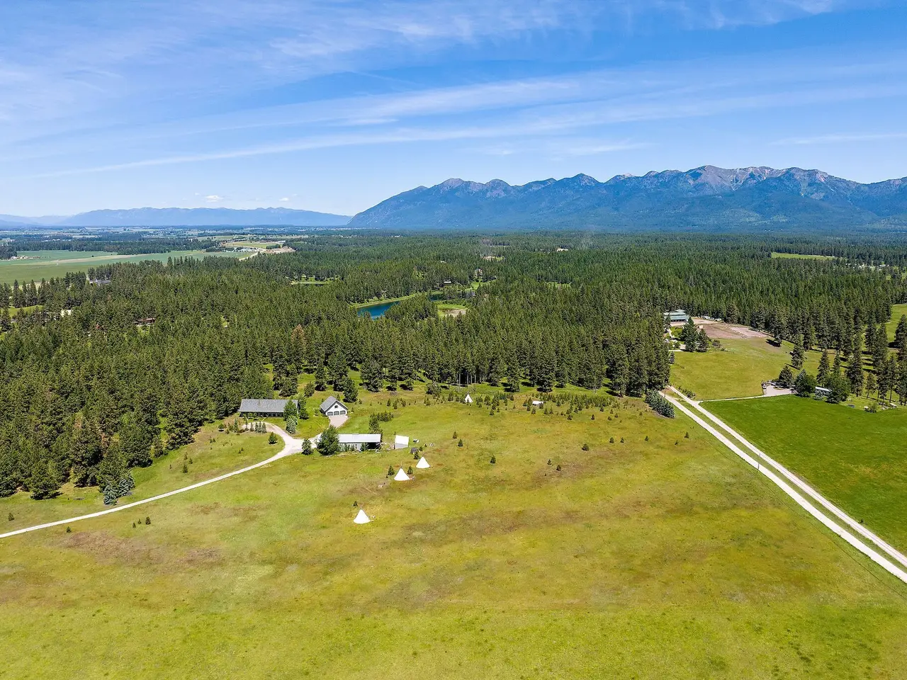 This stunning concrete tilt-up home is set on a breathtaking 20-acre meadow property, offering a serene and tranquil atmosphere just minutes from downtown Bigfork. The exceptional architectural design features magnificent arched concrete beams that support the unique structure. Inside, the spacious great room includes three luxurious bedroom suites and two distinctive lofts, all showcasing spectacular views of the surrounding meadow and mountain range. A guest suite above the garage adds a fourth bedroom, complete with a full bath, mini kitchen and gas fireplace. Additional rooms on the ground floor provide versatile options for various uses. The property also boasts a fully functional 2,120-square-foot workshop garage, currently serving as a working artist studio. This one-of-a-kind home is truly a masterpiece.