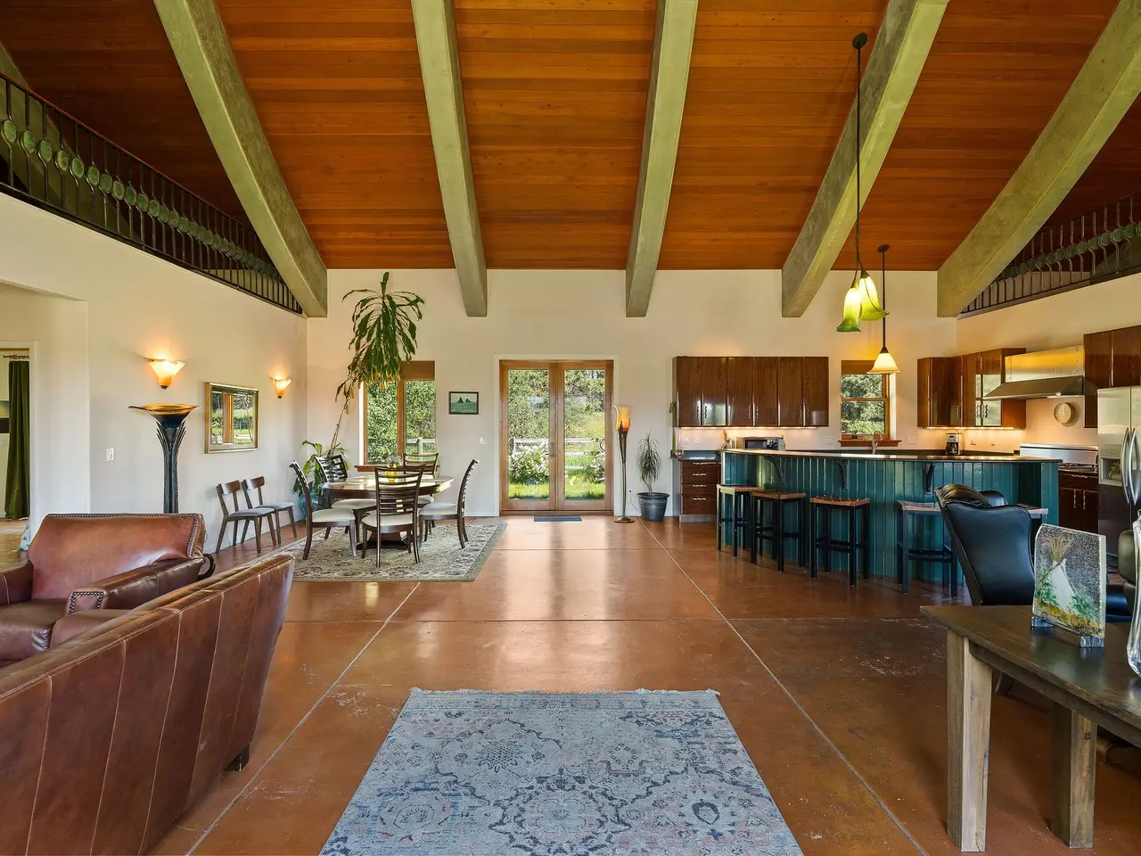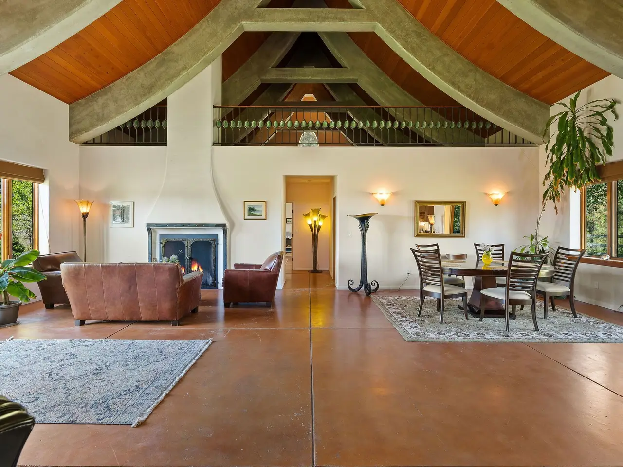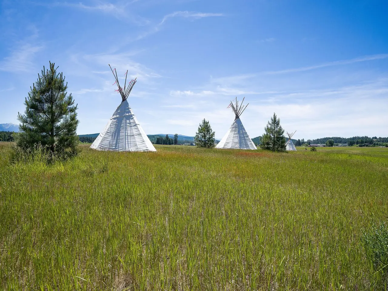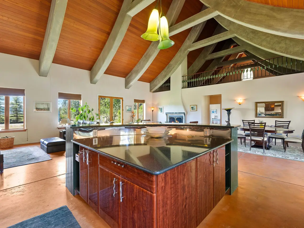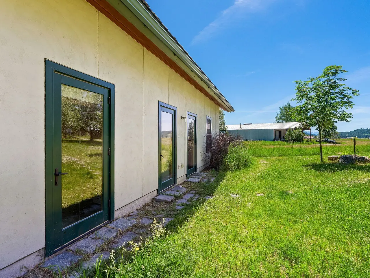 This stunning concrete tilt-up home is set on a breathtaking 20-acre meadow property, offering a serene and tranquil atmosphere just minutes from downtown Bigfork. The exceptional architectural design features magnificent arched concrete beams that support the unique structure. Inside, the spacious great room includes three luxurious bedroom suites and two distinctive lofts, all showcasing spectacular views of the surrounding meadow and mountain range. A guest suite above the garage adds a fourth bedroom, complete with a full bath, mini kitchen and gas fireplace. Additional rooms on the ground floor provide versatile options for various uses. The property also boasts a fully functional 2,120-square-foot workshop garage, currently serving as a working artist studio. This one-of-a-kind home is truly a masterpiece.
