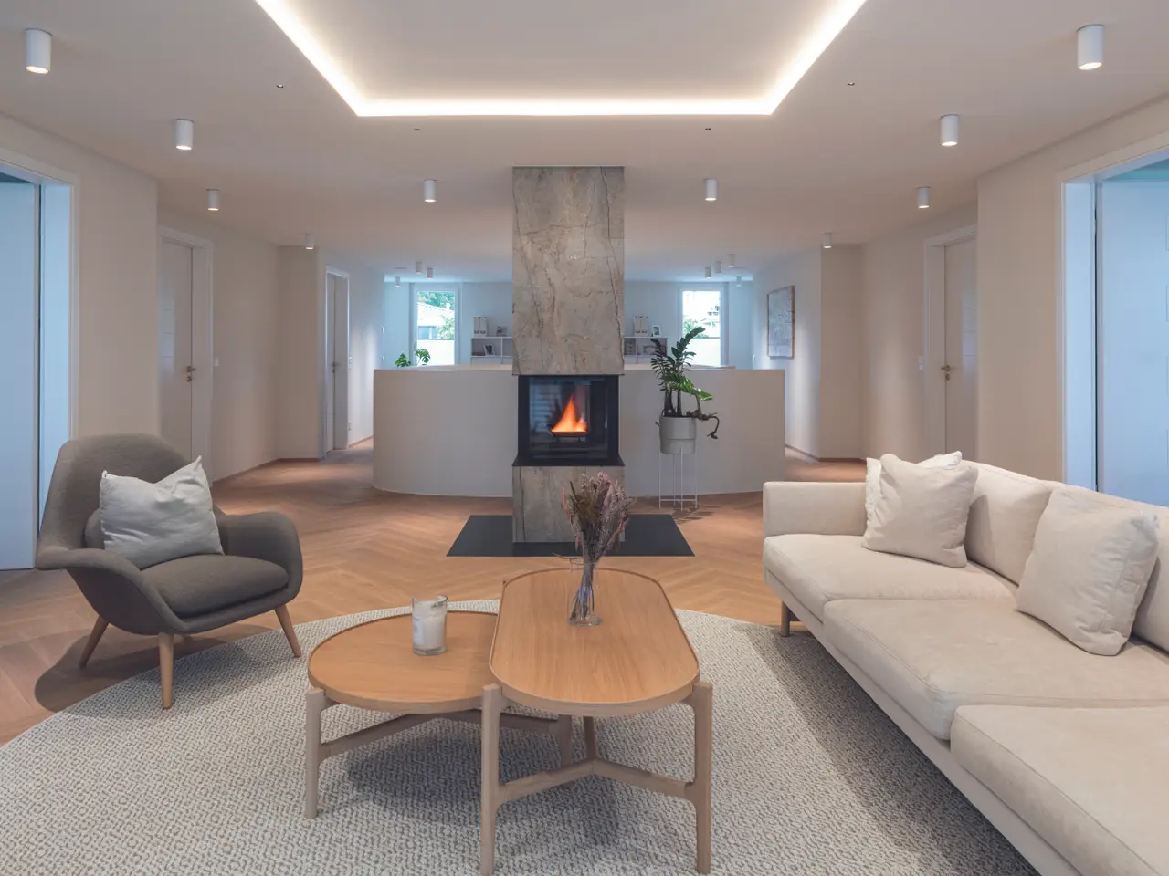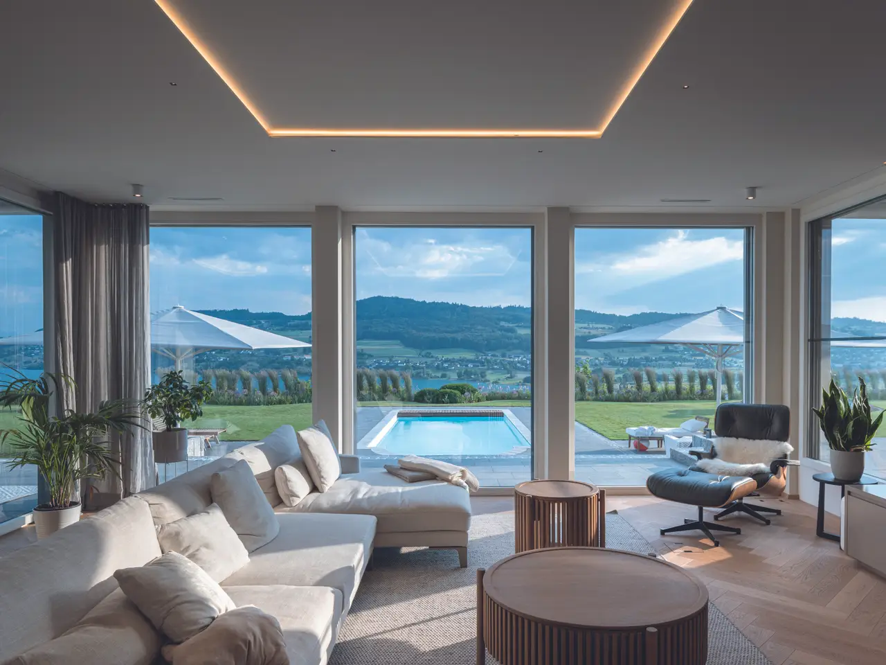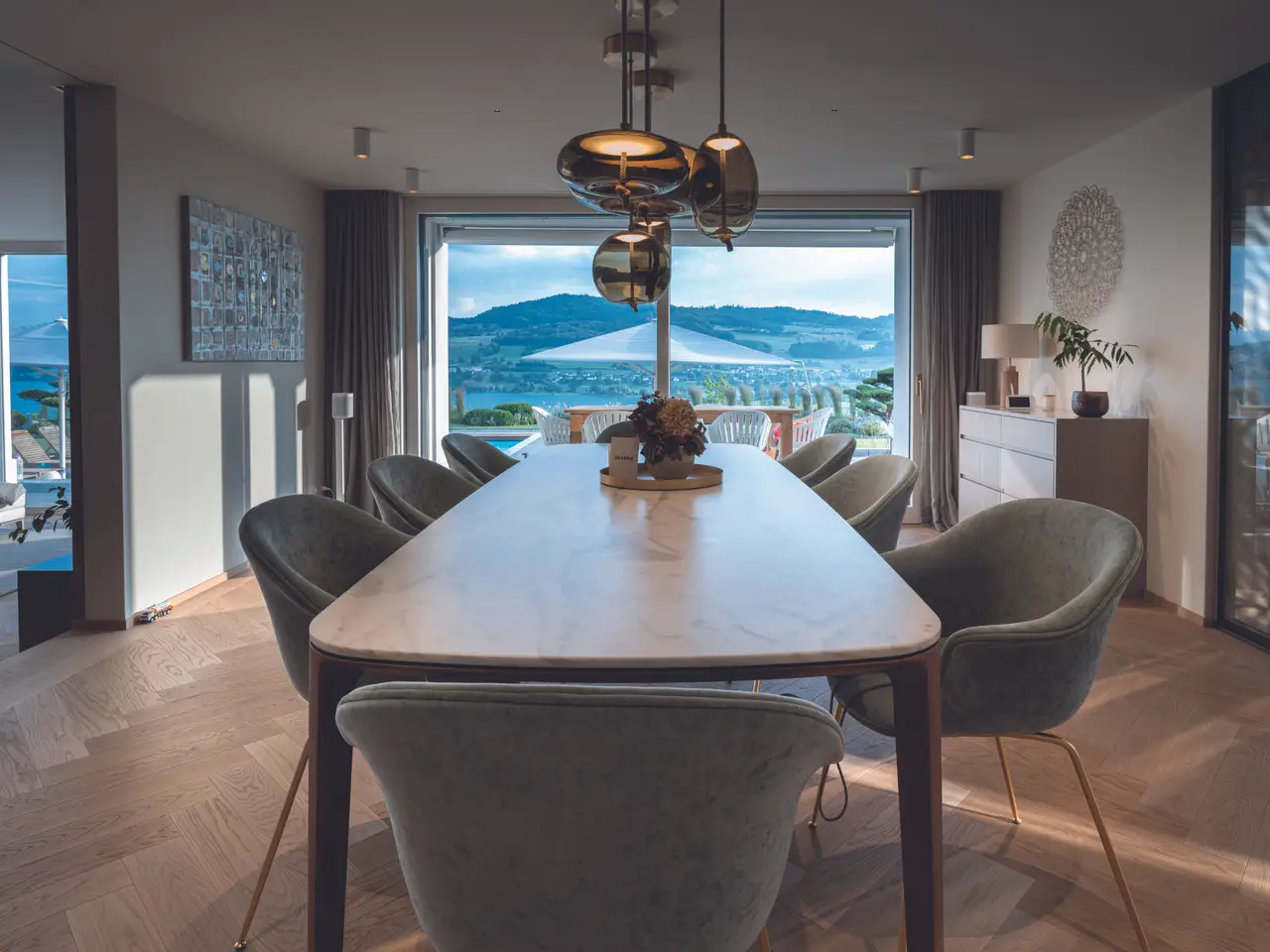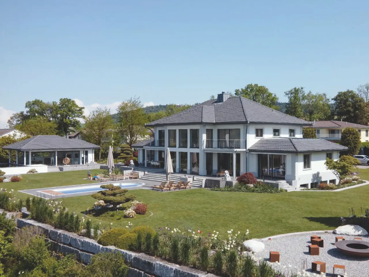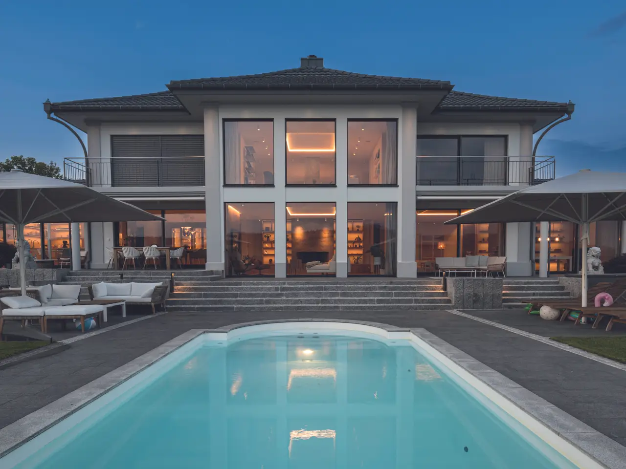 »Villa Palladia« showcases the magnificent views in every possible direction. In the extensive garden, a heated pool and a stylish pavilion with a grill, kitchenette, fireplace, and a fascinating Koi pond invite you to celebrate in style. The interior impresses with high-quality details and a sophisticated lighting concept. A heat pump and geothermal probe ensure that the home's technology is resource-efficient. And what would this luxurious villa be without the offerings for relaxation and wellness in the basement! An extravagant home theater, an air-conditioned wine cellar, and a beautufl spa with a steam bath and whirlpool enhance gray rainy days. We would be delighted to show you this apartment in person. If you have any questions or would like to arrange a viewing, please do not hesitate to contact us.