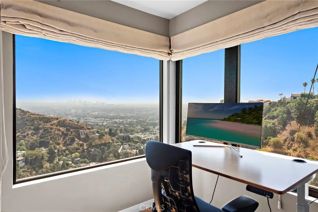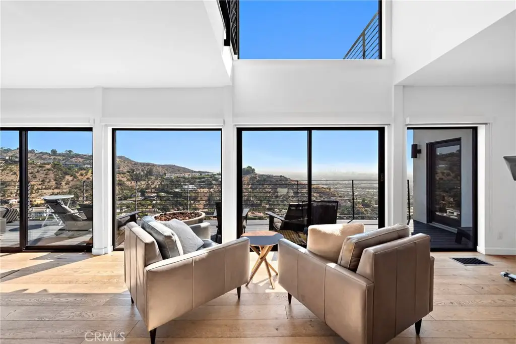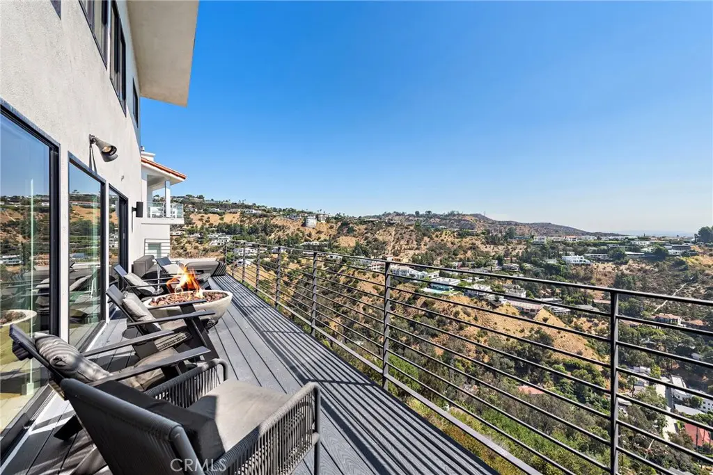 Nestled in the Hollywood Hills, sits this beautifully designed home with breathtaking views of the city below. Despite its secluded and private setting, this is just moments away from the vibrant energy the city has to offer. Having the perfect balance between tranquility and urban convenience, the home allows you to retreat into your own world while still being minutes from the heart of LA's most iconic destinations. The open-concept design invites seamless entertaining with its wet bar, fireplace, and soaring ceilings. The interiors feature oak floors and Caesarstone countertops adding warmth and texture, while panoramic views provide a stunning backdrop. With Viking appliances, a spacious island with seating, and a charming dining nook, this kitchen is perfect for the gourmet chef or casual cook. The primary suite features a corner window framing spectacular views, a walk-in closet, private balcony, and a bathroom with both a soaking tub and a walk-in shower. The front deck, complete with a fire pit, offers the perfect perch to enjoy the glittering LA skyline.
