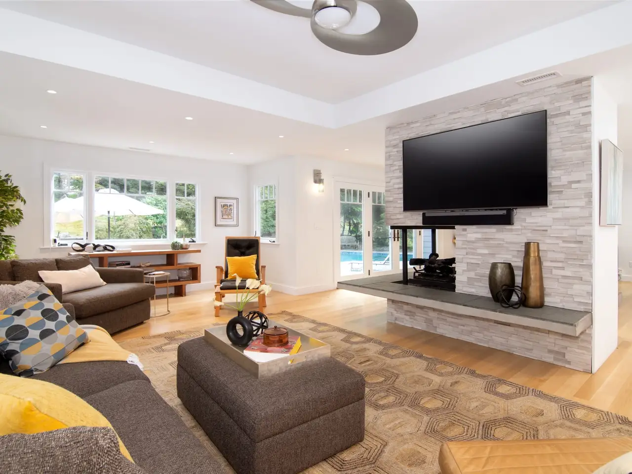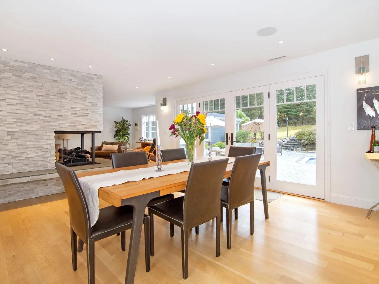 Your dream home in Hartsdale Estates is fully available. This beautifully reimagined and completely rebuilt modern Ranch offers the perfect blend of luxury, comfort, and everyday functionality. Set on nearly an acre in the sought-after Hartsdale Estates neighborhood, this home was thoughtfully designed for easy single-level living and exceptional entertaining. The bright and airy open floor plan features gleaming white oak floors, while oversized windows fill the spaces with natural light. At the heart of the home, a striking three-sided gas fireplace connects the spacious living and dining areas to a true chefs kitchen, complete with high-end Thermador and Fisher & Paykel appliances, ideal for hosting family and friends. The private bedroom wing includes three large bedrooms, two full bathrooms, and a convenient laundry area. The spacious primary suite feels like a personal retreat, featuring a spa-like bath with a soaking tub and walk-in shower, a custom walk-in closet, a cozy sitting area or home office, and even room for your own gym. The finished lower level offers a great bonus space for a family room, playroom, or media lounge, with plenty of storage and the option to add a fifth bedroom and bath. Enjoy your own backyard oasis with a heated Gunite pool, a full outdoor bath/dressing room, and a fully fenced yard that is perfect for entertaining, and making memories all year round. A spacious attached three-car garage completes this exceptional home. This move-in-ready gem has it all.